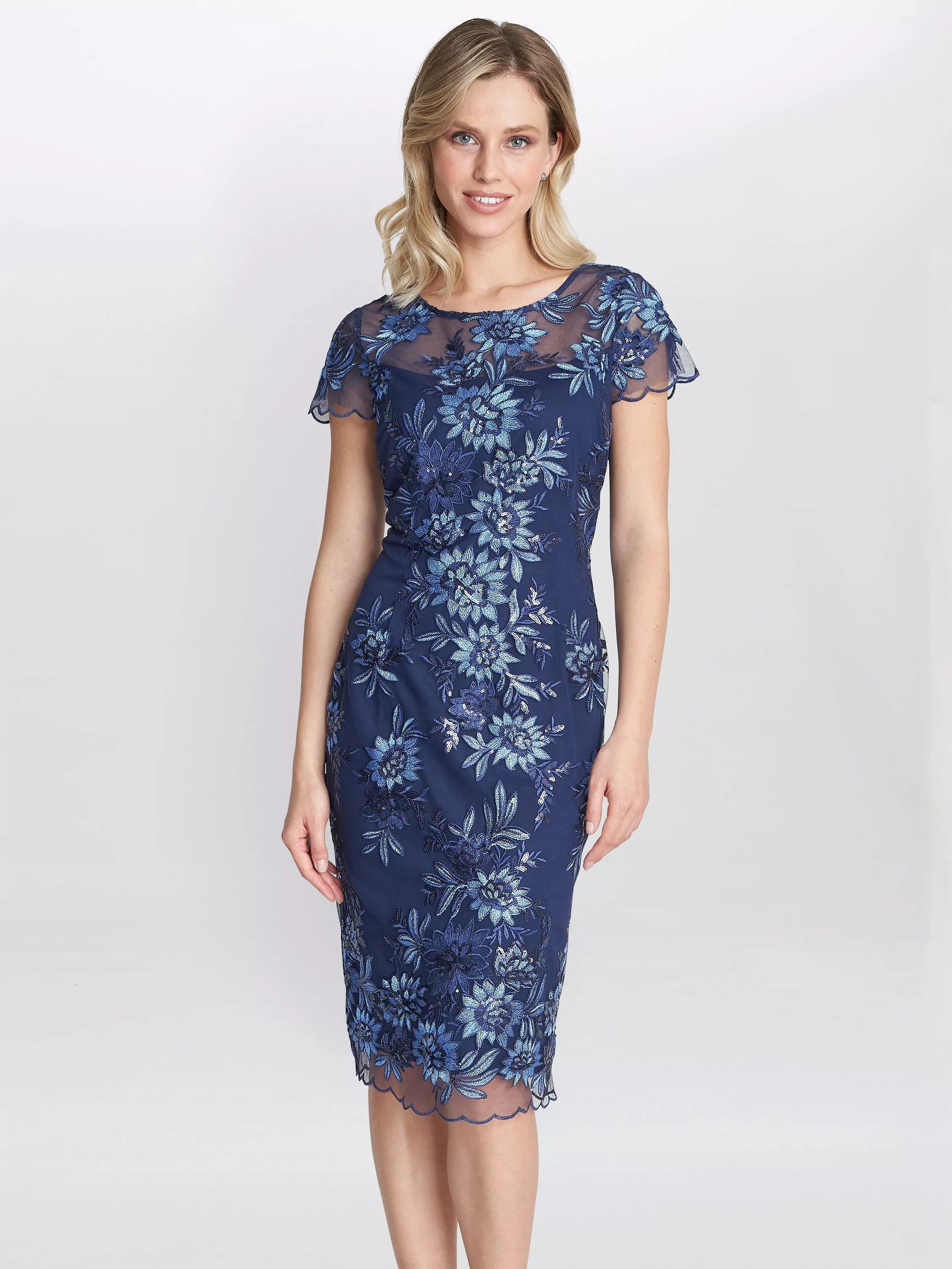 Carving a clean line with its pencil shape, this knee-length dress by Gina Bacconi is textured with embroidery.