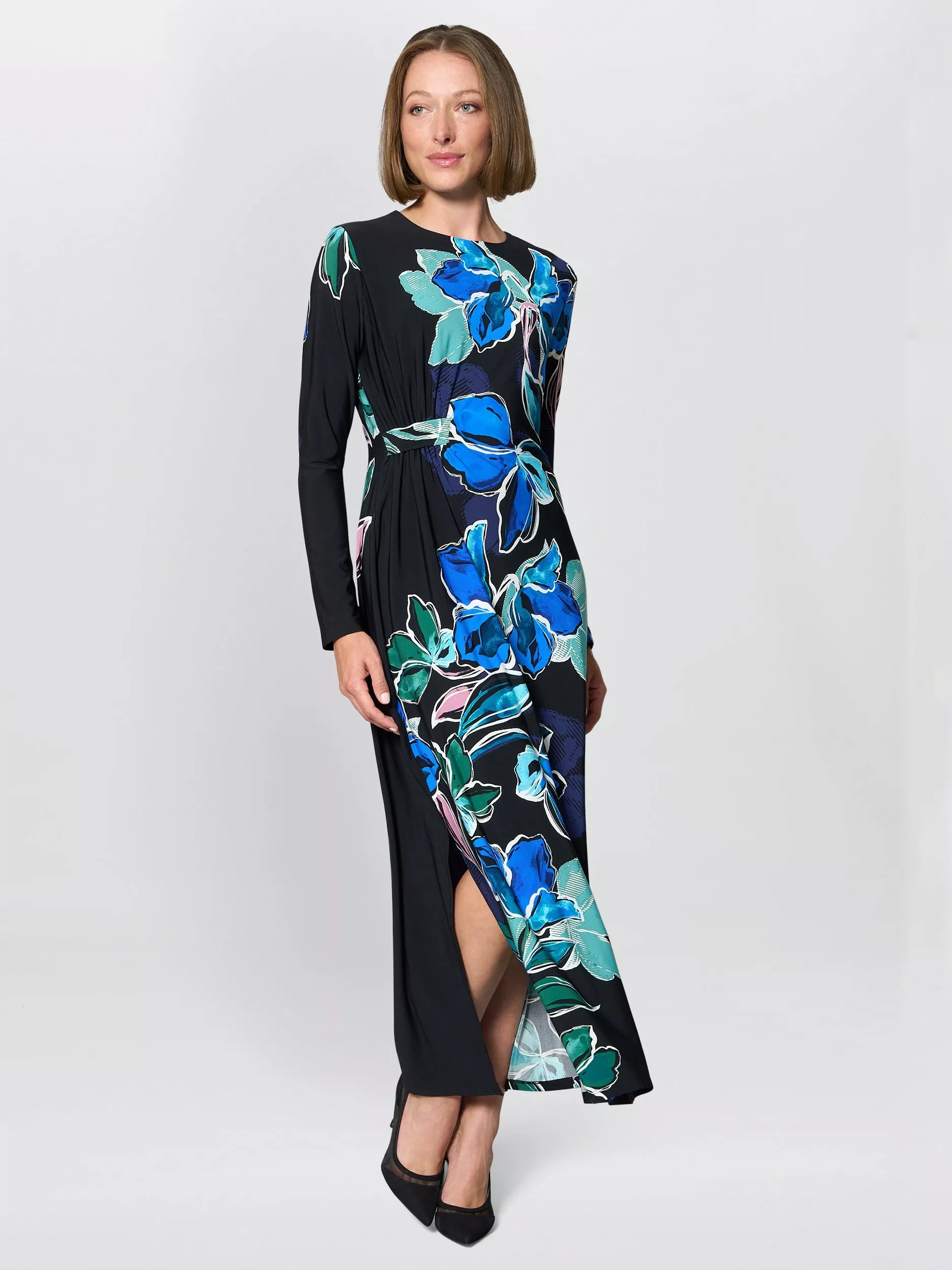 This elegant Eli dress features a striking floral print. Designed with a sleek silhouette, the dress has a slit on the side that adds a touch of sophistication. The long sleeves and flowing fabric create a flattering, polished look perfect for parties and evening events.