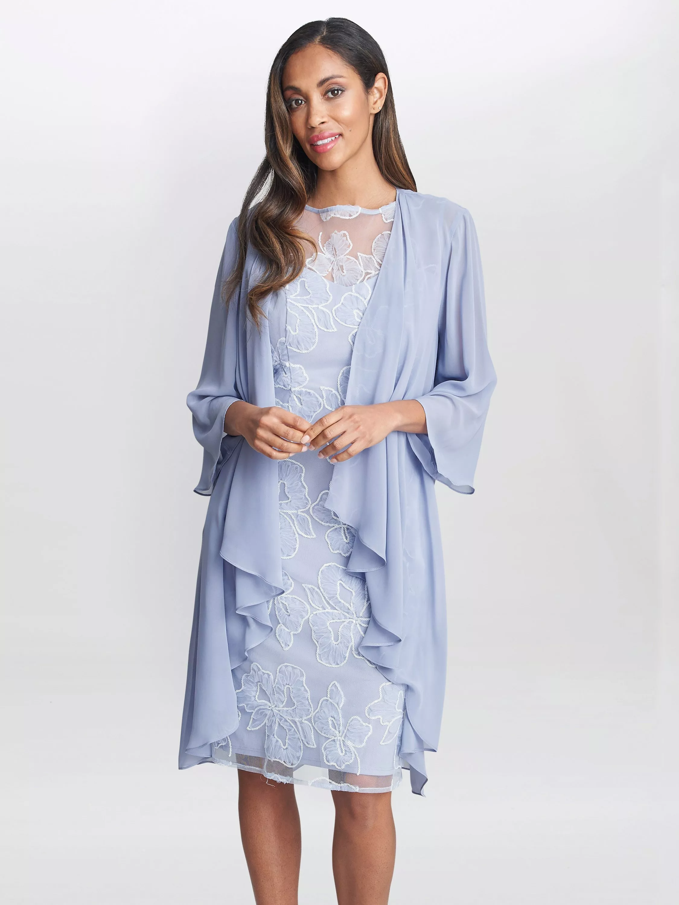 Gina BacconiElia Embroidered Dress with Chiffon Jacket, Hydrangea