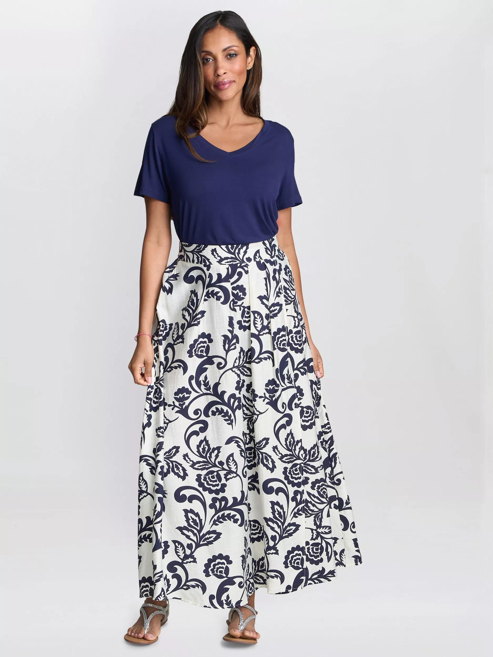 This wearable, pull on, floral, elasticated waist skirt has a side slit and waist pleats. Great when worn with a simple navy t-shirt. This skirt is unlined.