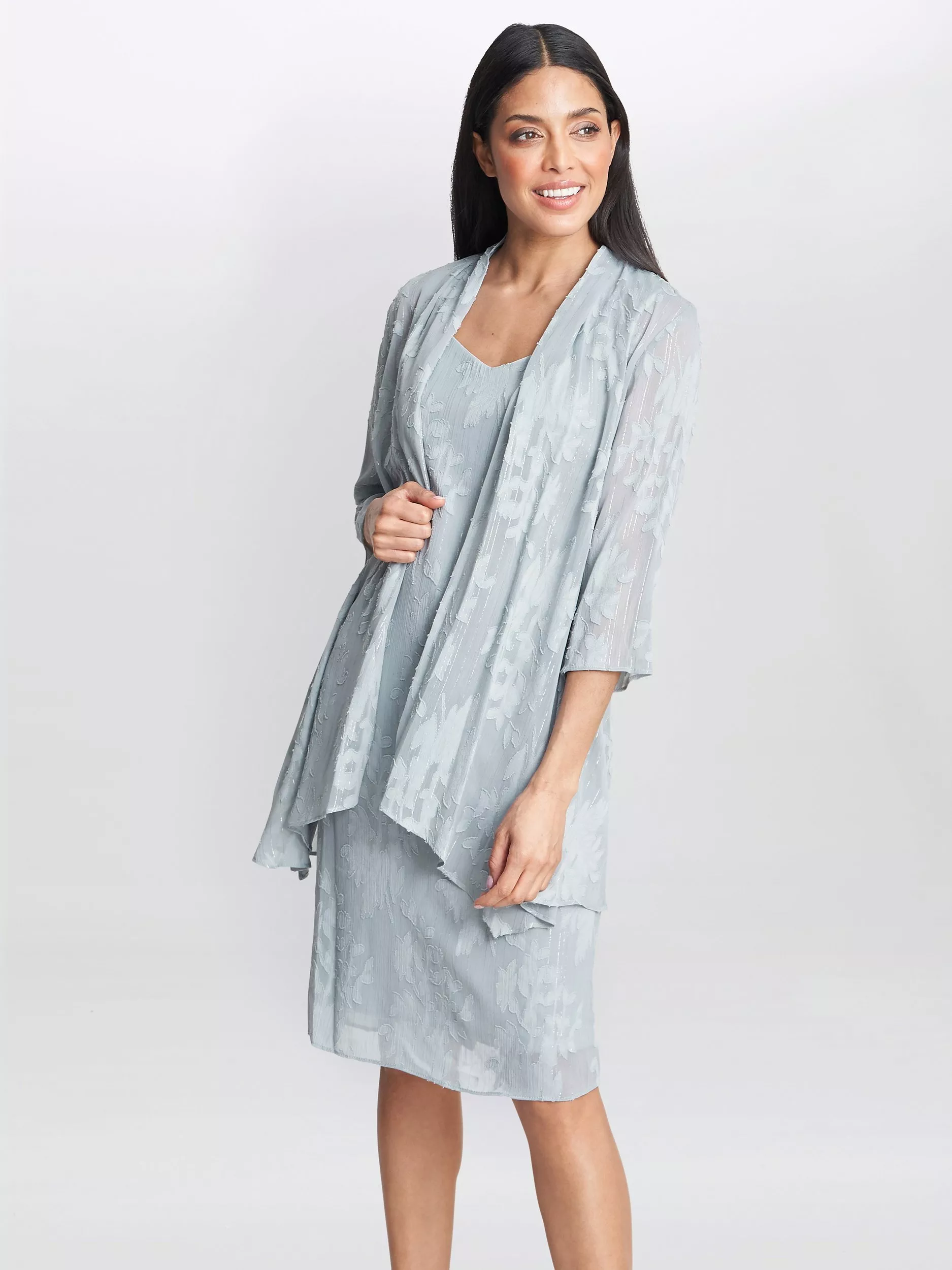 Cut to an iconic shift silhouette, this knee length dress from Gina Bacconi is fashioned with a flattering sweetheart neckline. Detailed with a textured abstract print, this piece comes with jacquard waterfall jacket for added coverage when needed.