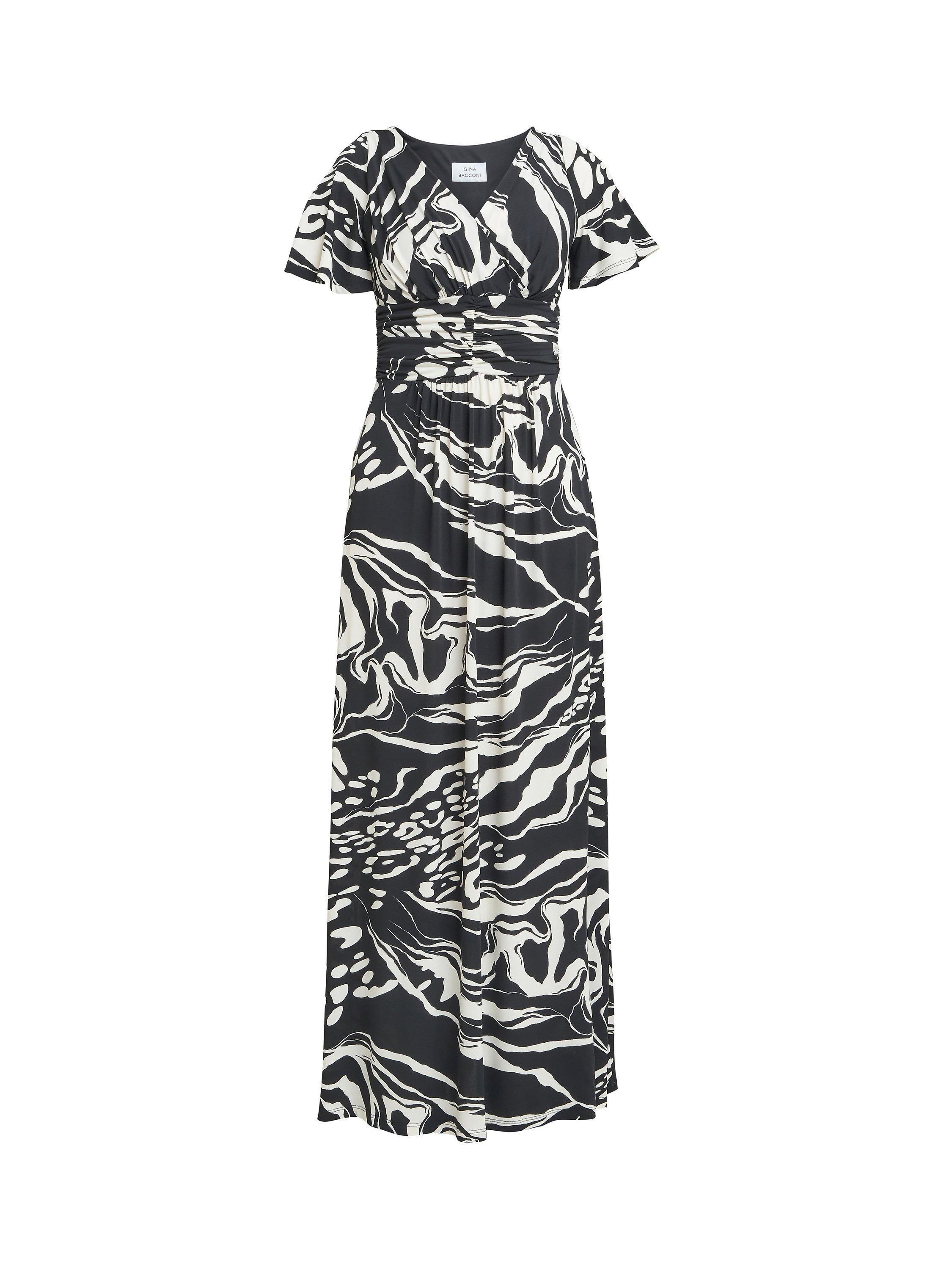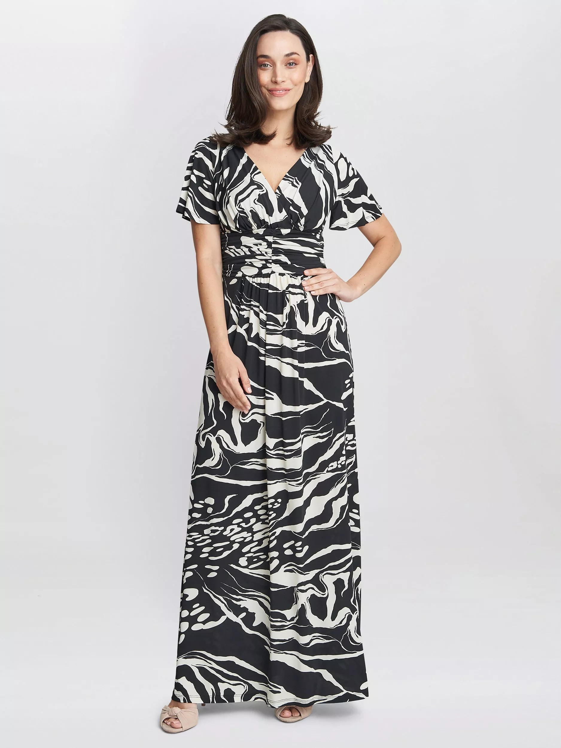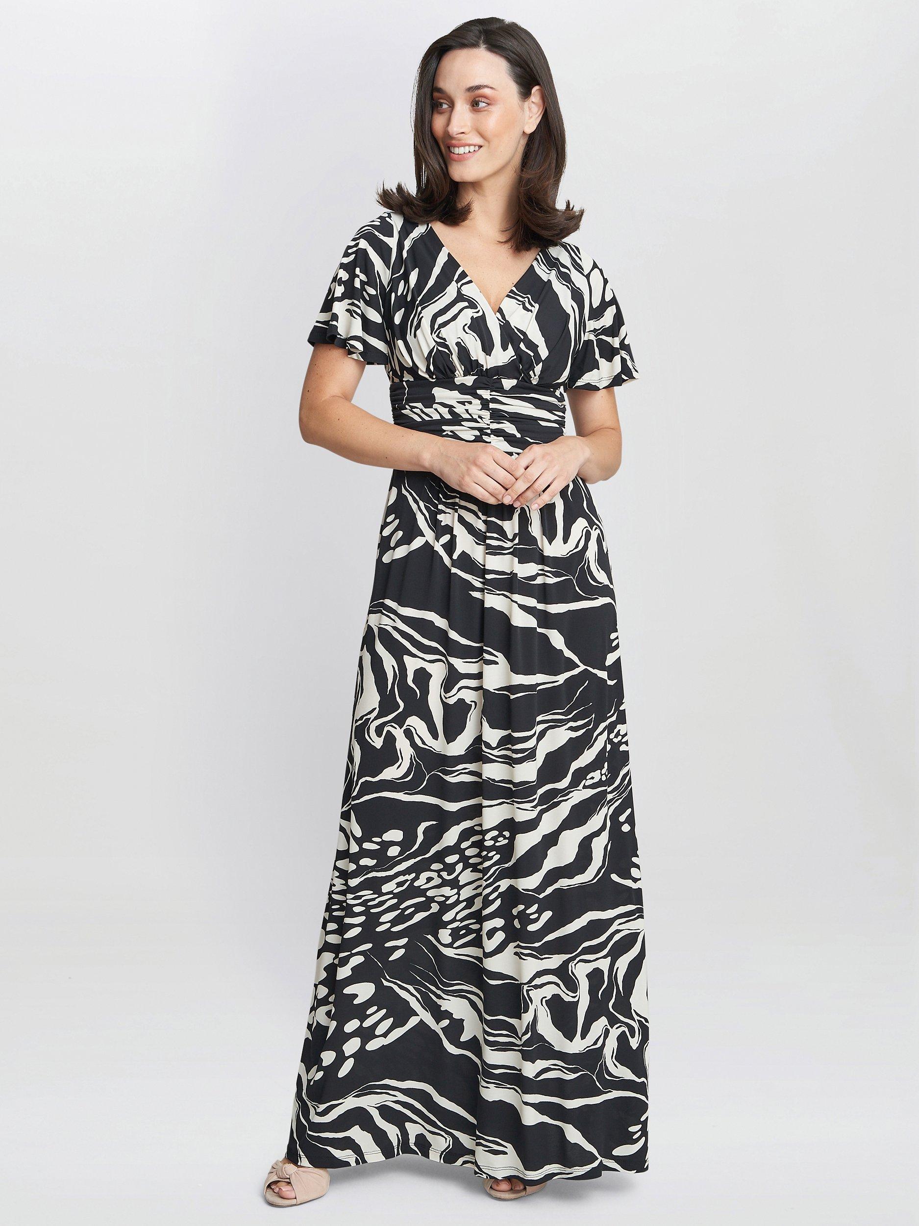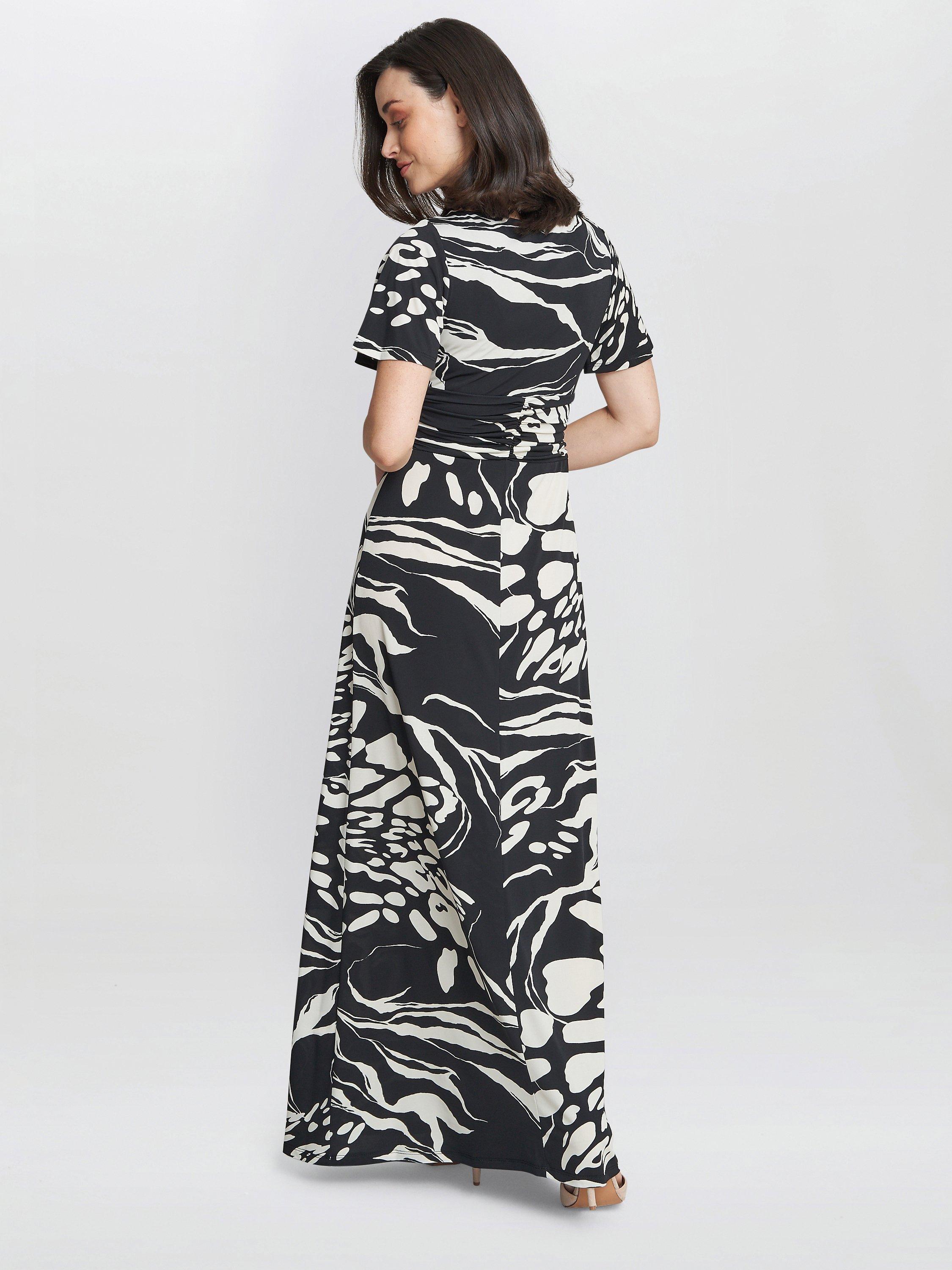 Flattering in all the right places, this floor-length dress from Gina Bacconi is crafted from a blend of fabrics. With a crossover v-neckline and short flutter sleeves, this style is dipped in abstracts.