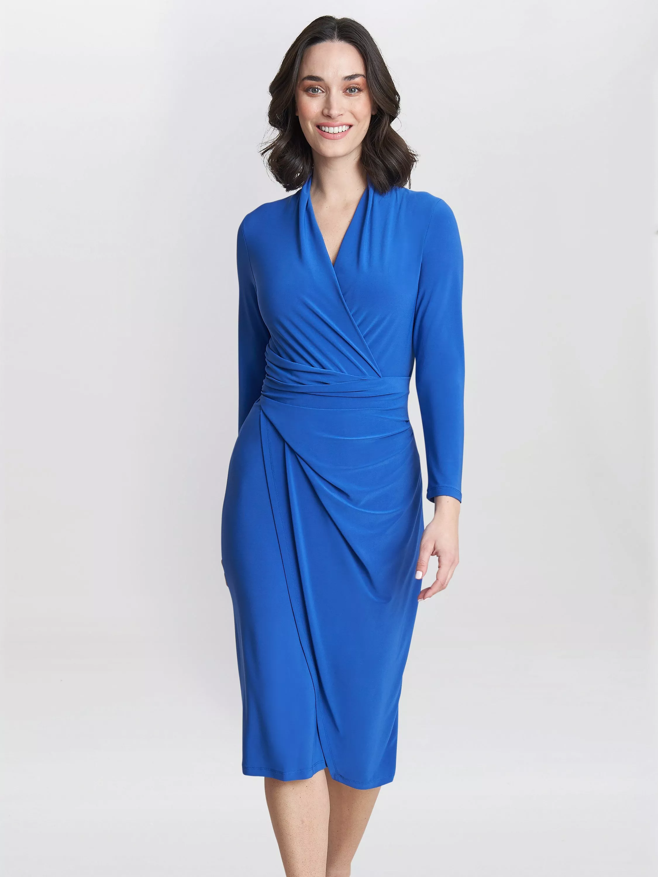 In a shape that really flatters, this knee length dress from Gina Bacconi is crafted from a blend of fabrics. A classic option thanks to the wrap over neckline and cropped sleeves, this style transforms a simple design into a stand out.