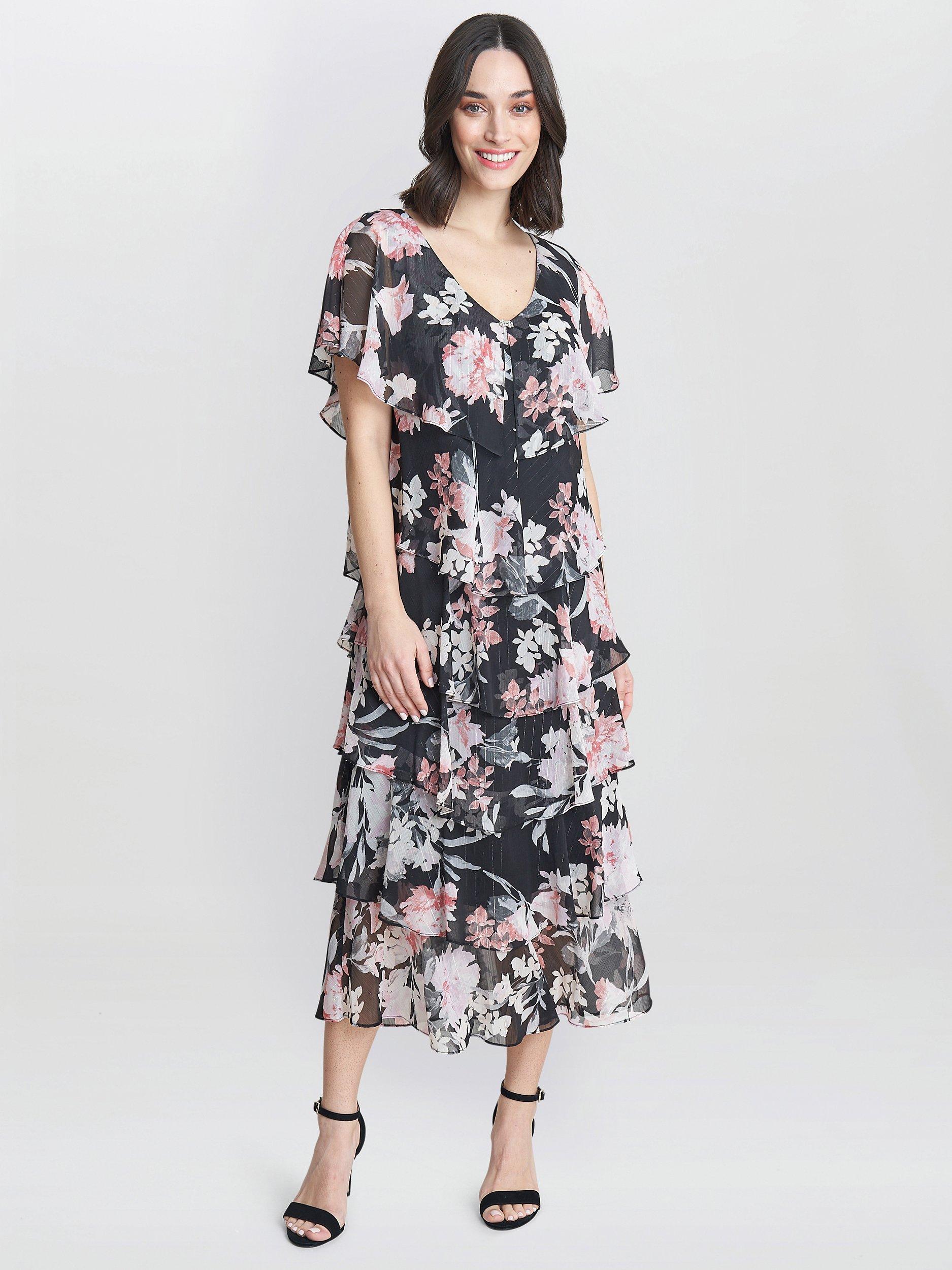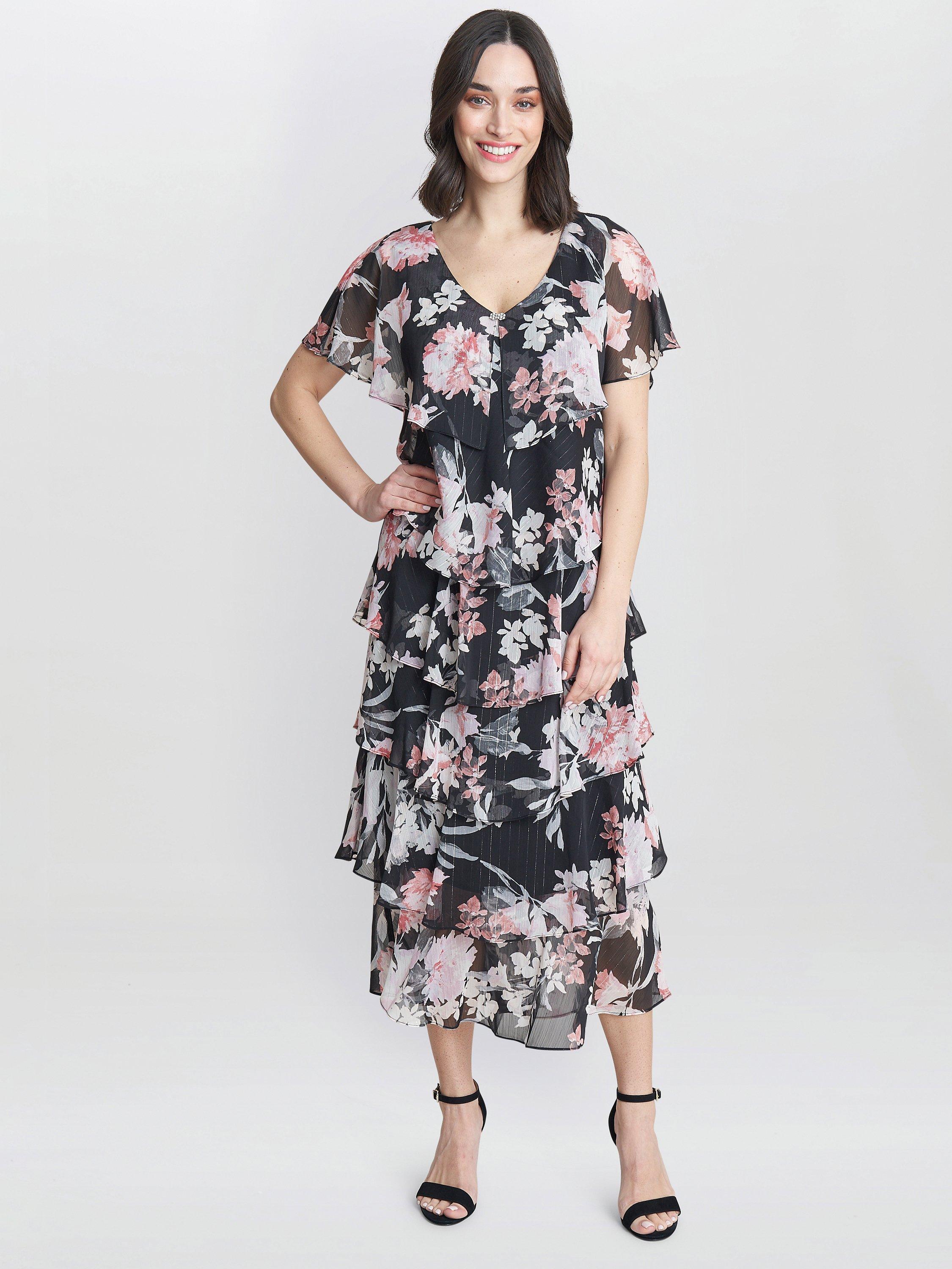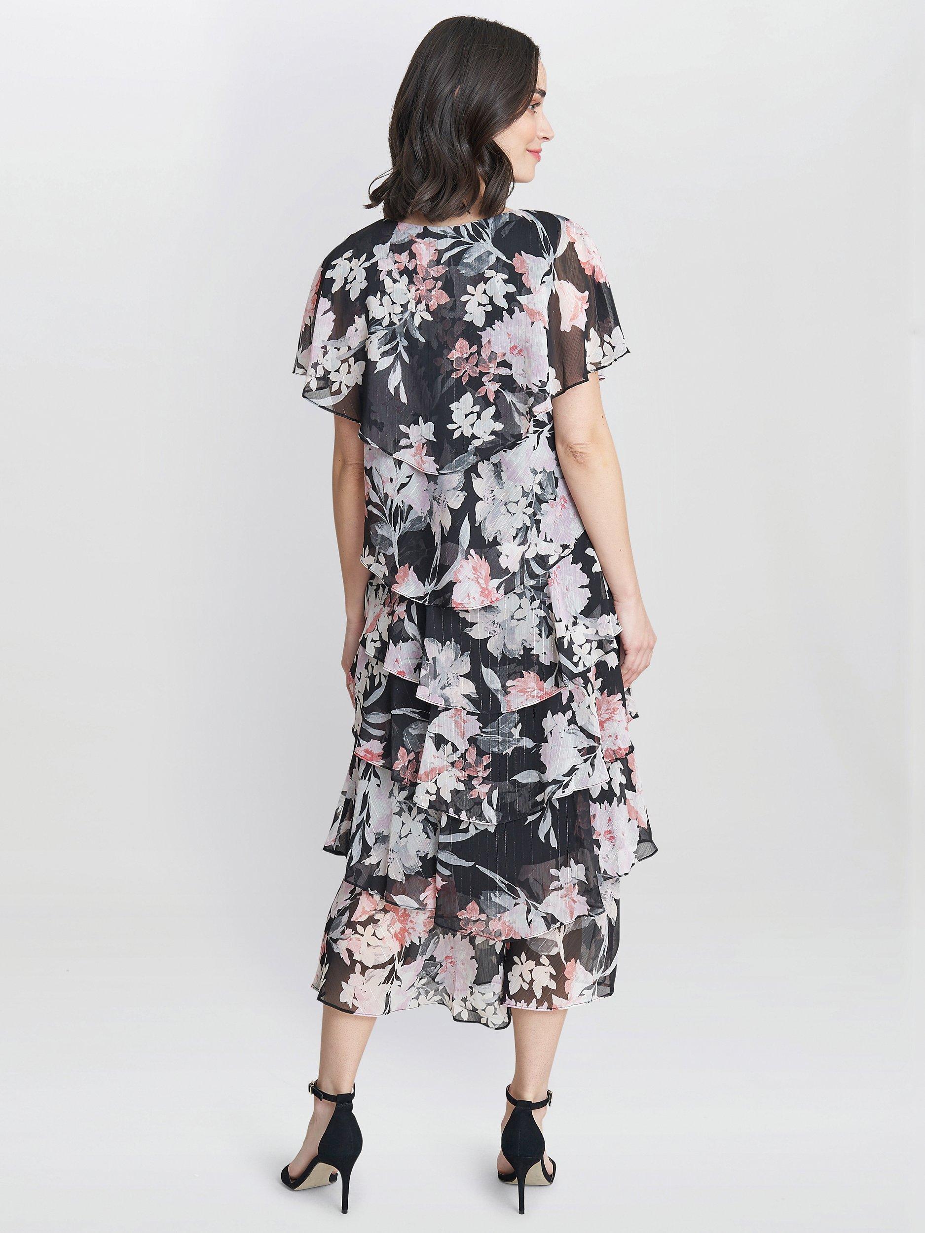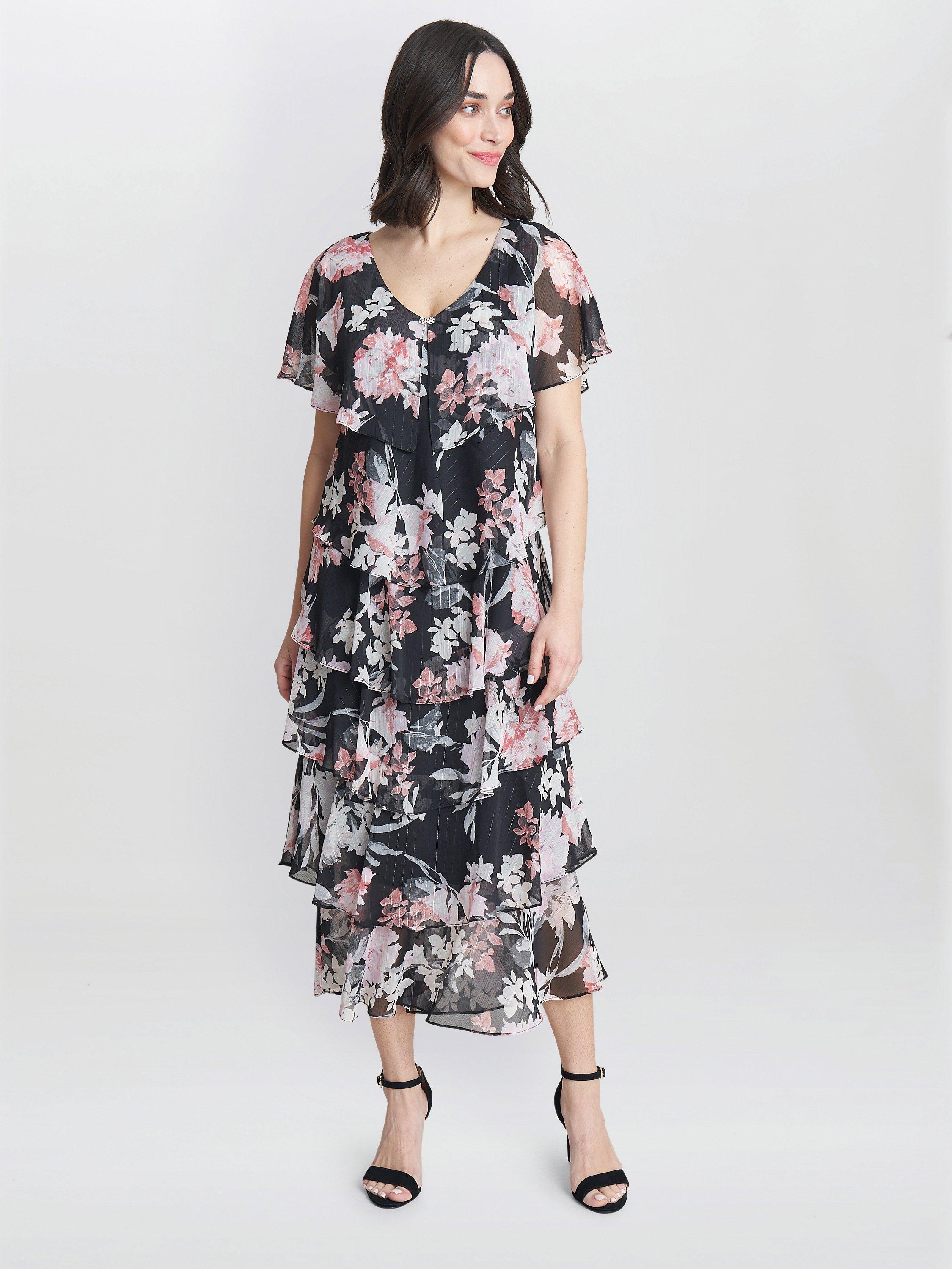 Your favourite tiered style in a longer midi length! Fashioned in a beautiful floral print with a delicate metallic thread this is a perfect addition to your wardrobe!