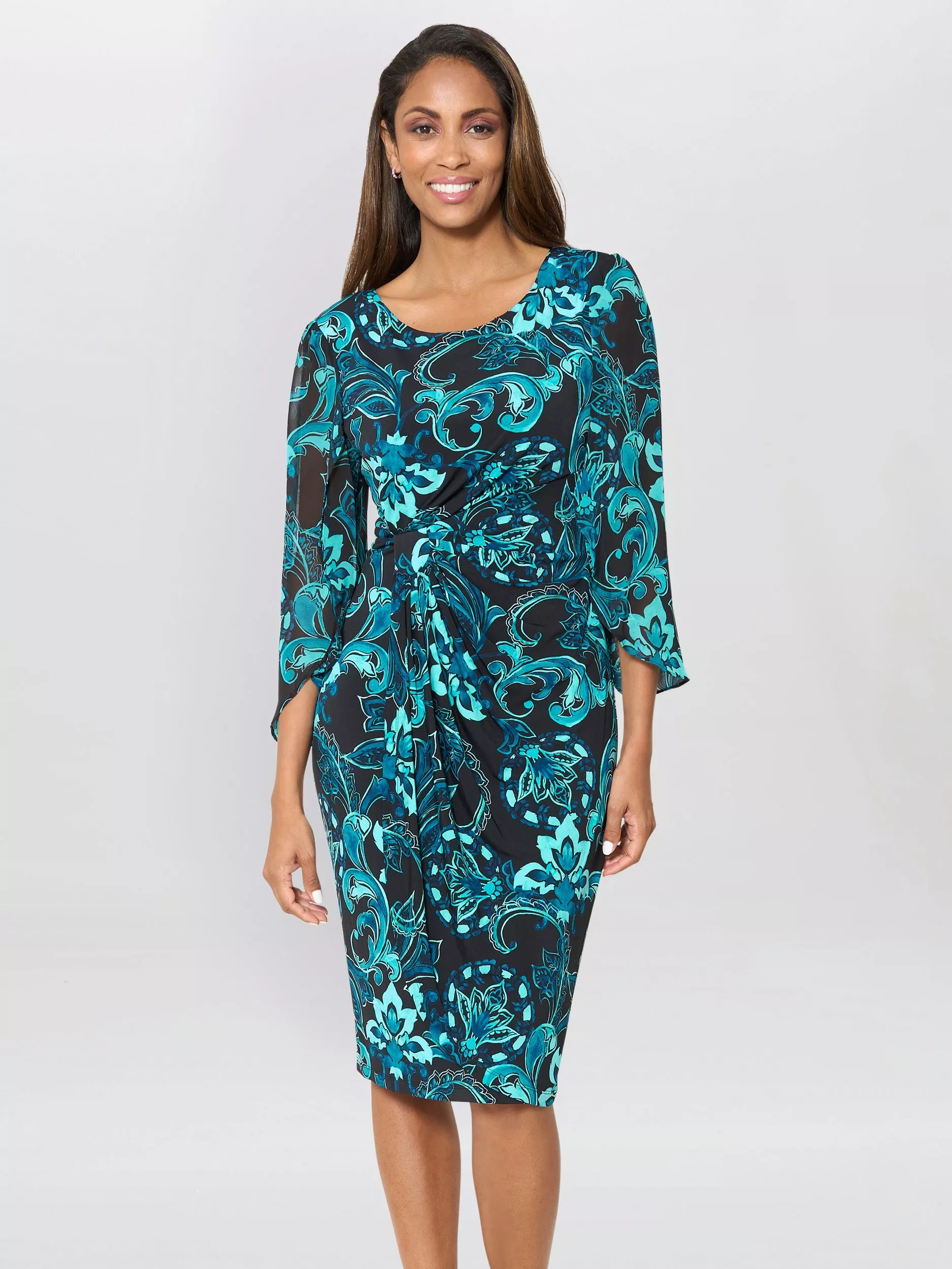 Framed with a round neckline and three quarter sleeves, this dress is made from a soft stretchy jersey fabric for all-day comfort. Designed with a gathered drape at the waist to create a flattering silhouette, it is finished with a fresh botanical print.