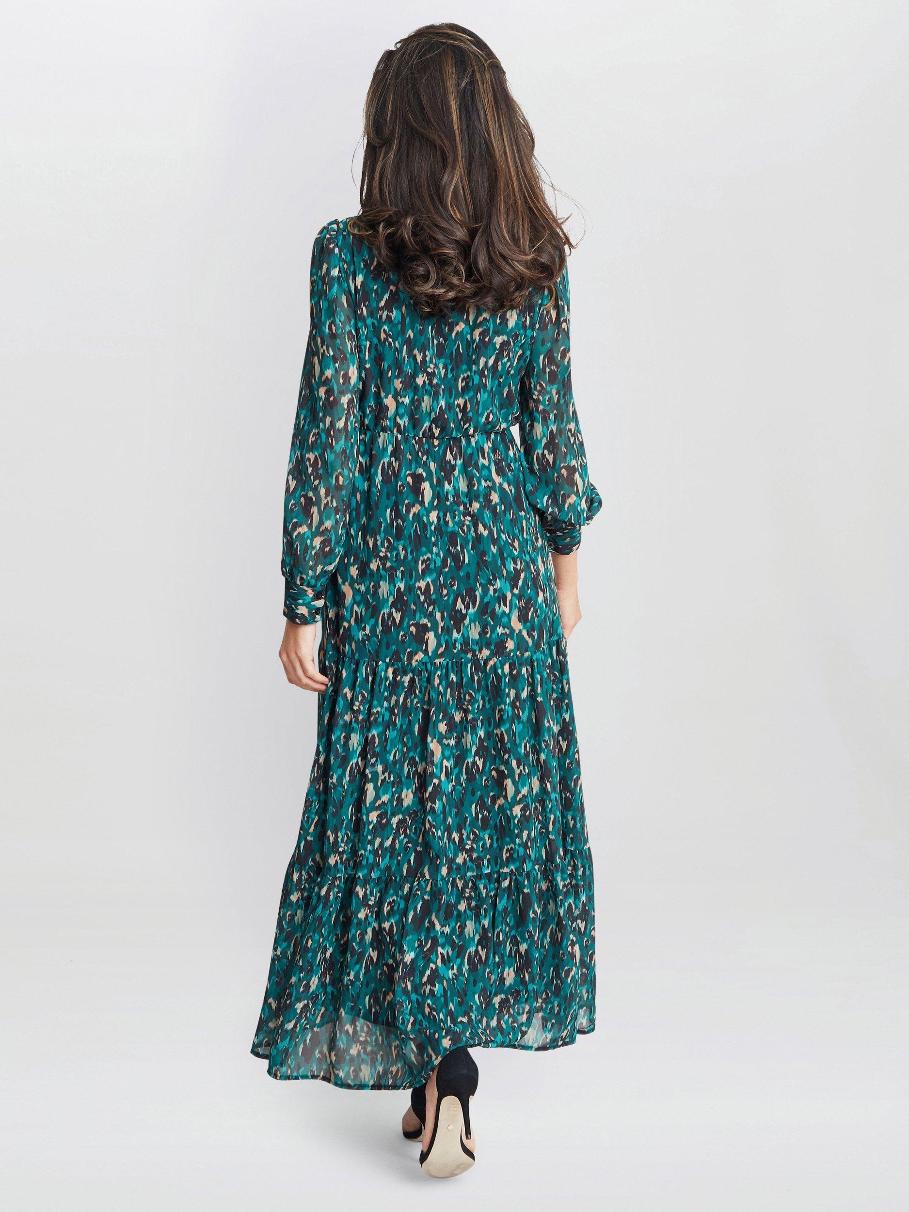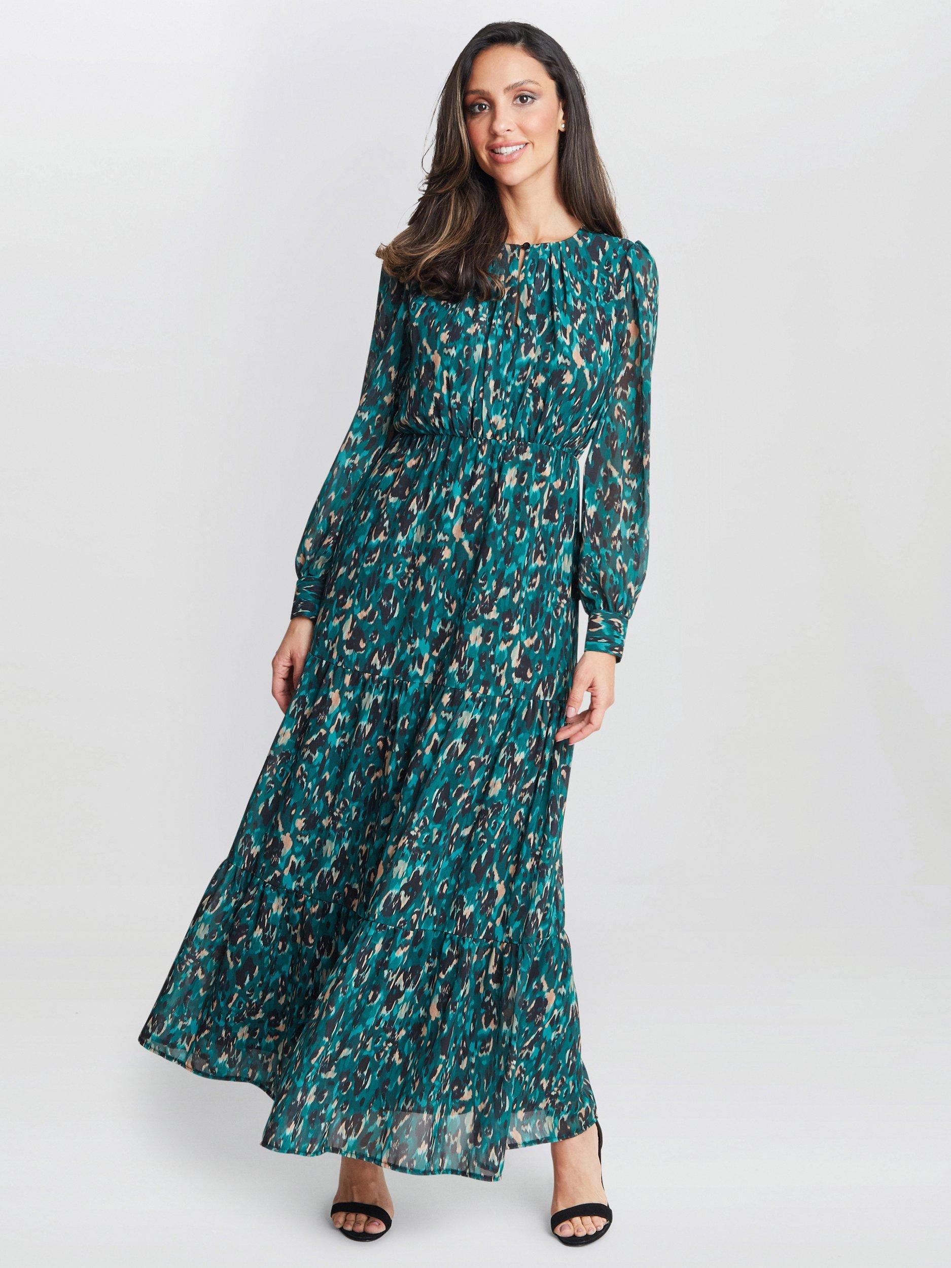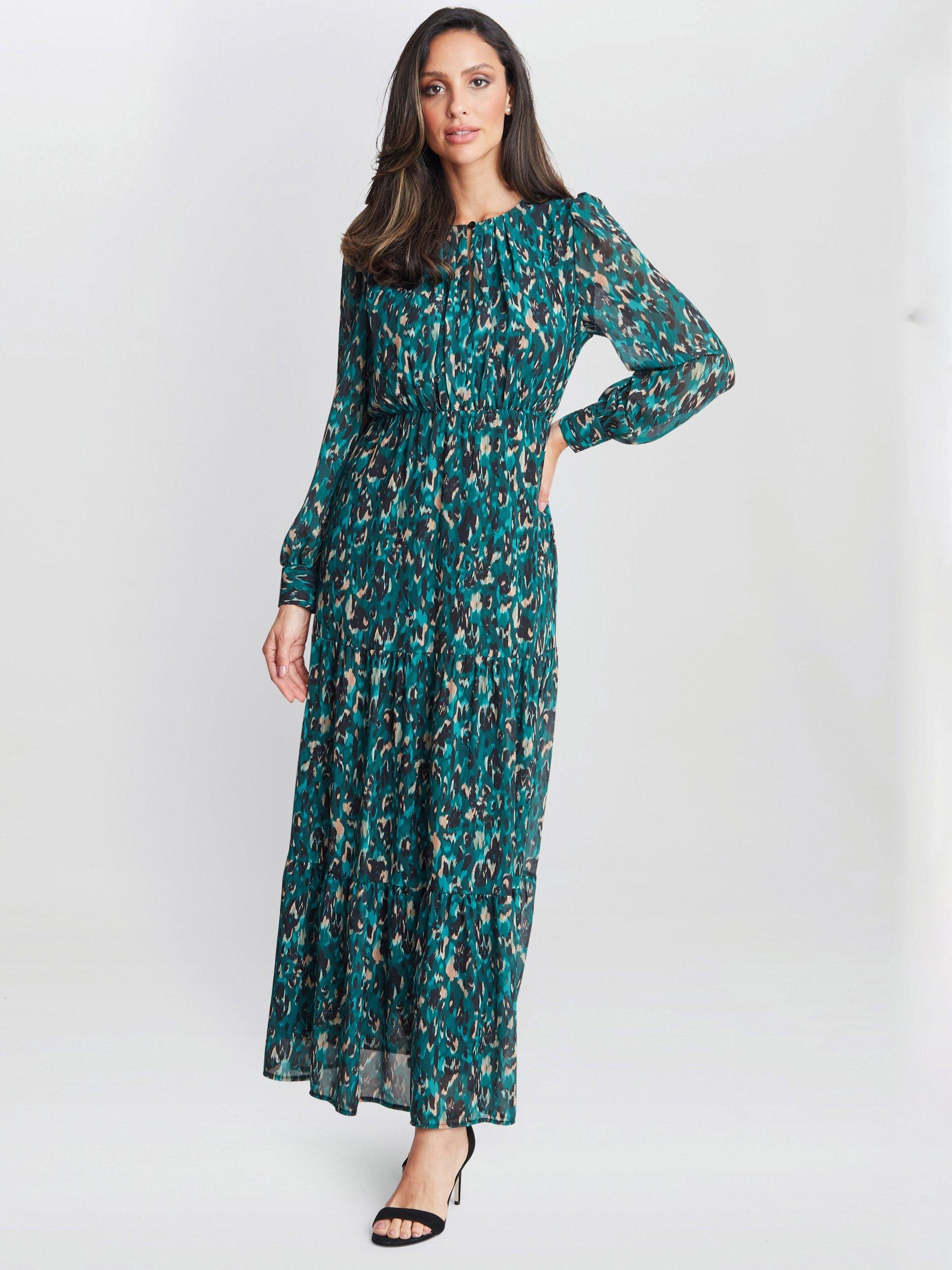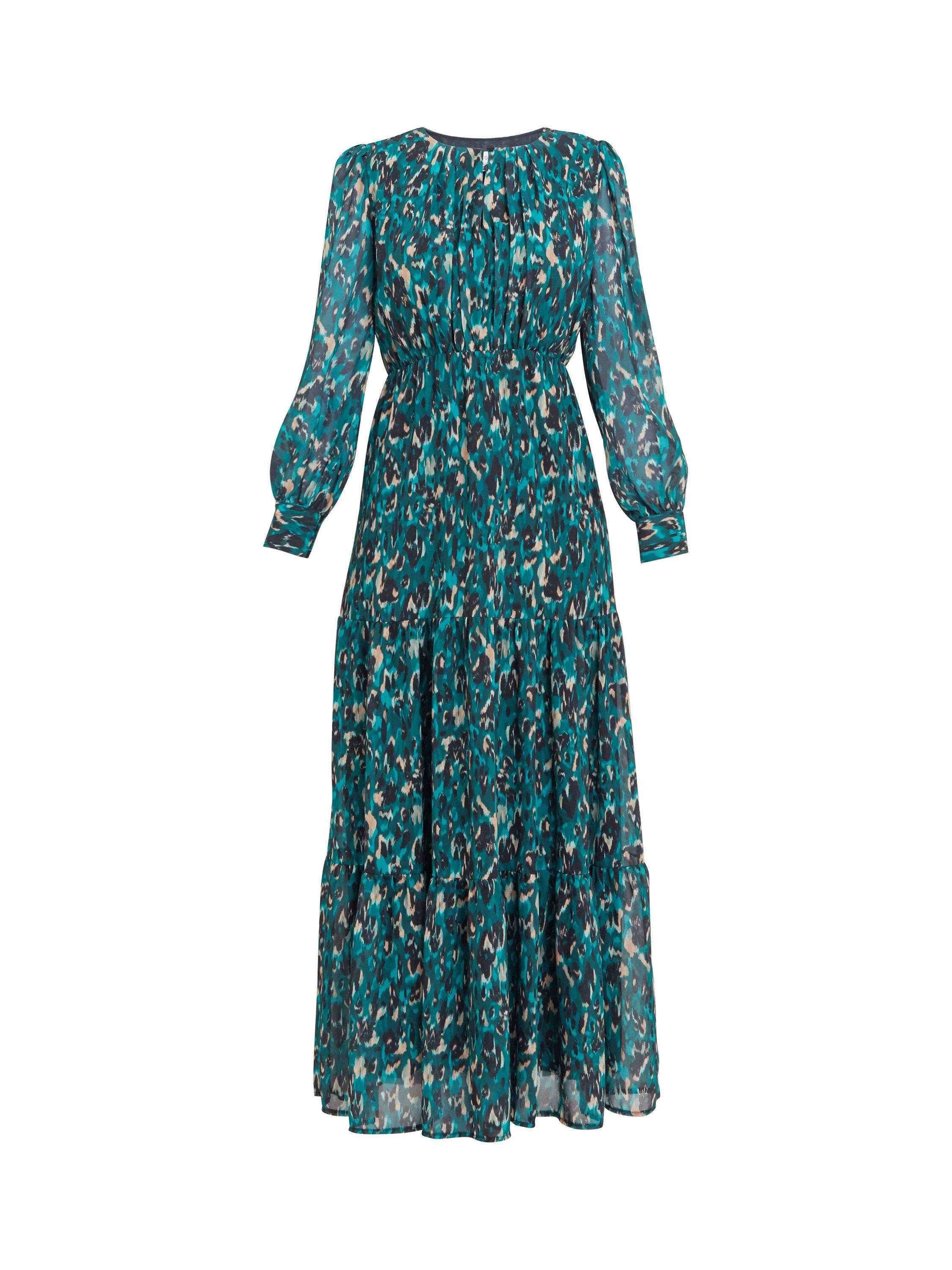 Easy day to evening chiffon dress in a summery print. This dress features a buttoned front neck and cuffed long sleeves, it has a full skirt and an elasticated waist for ease. Dress up or down with heels or flats.