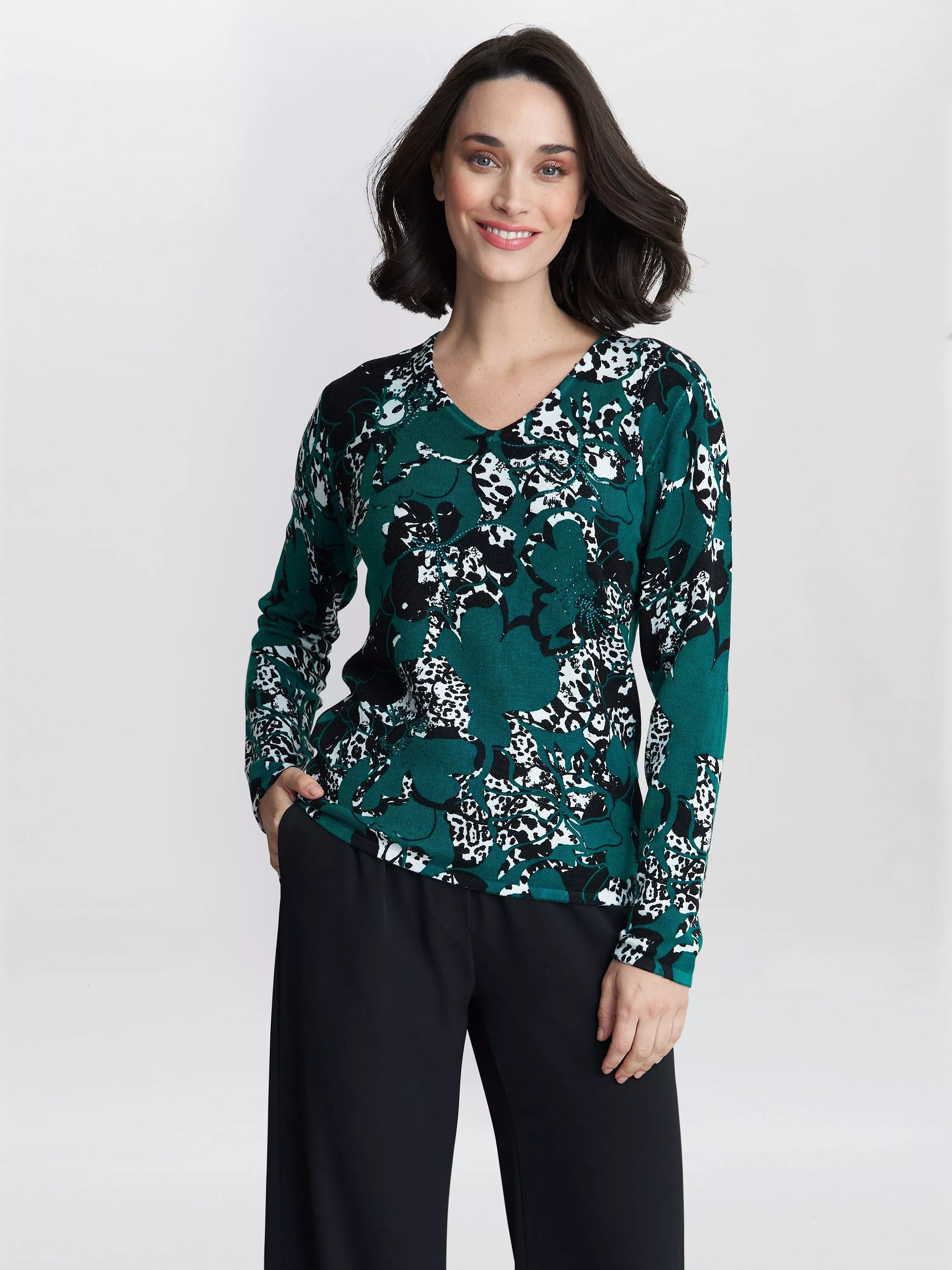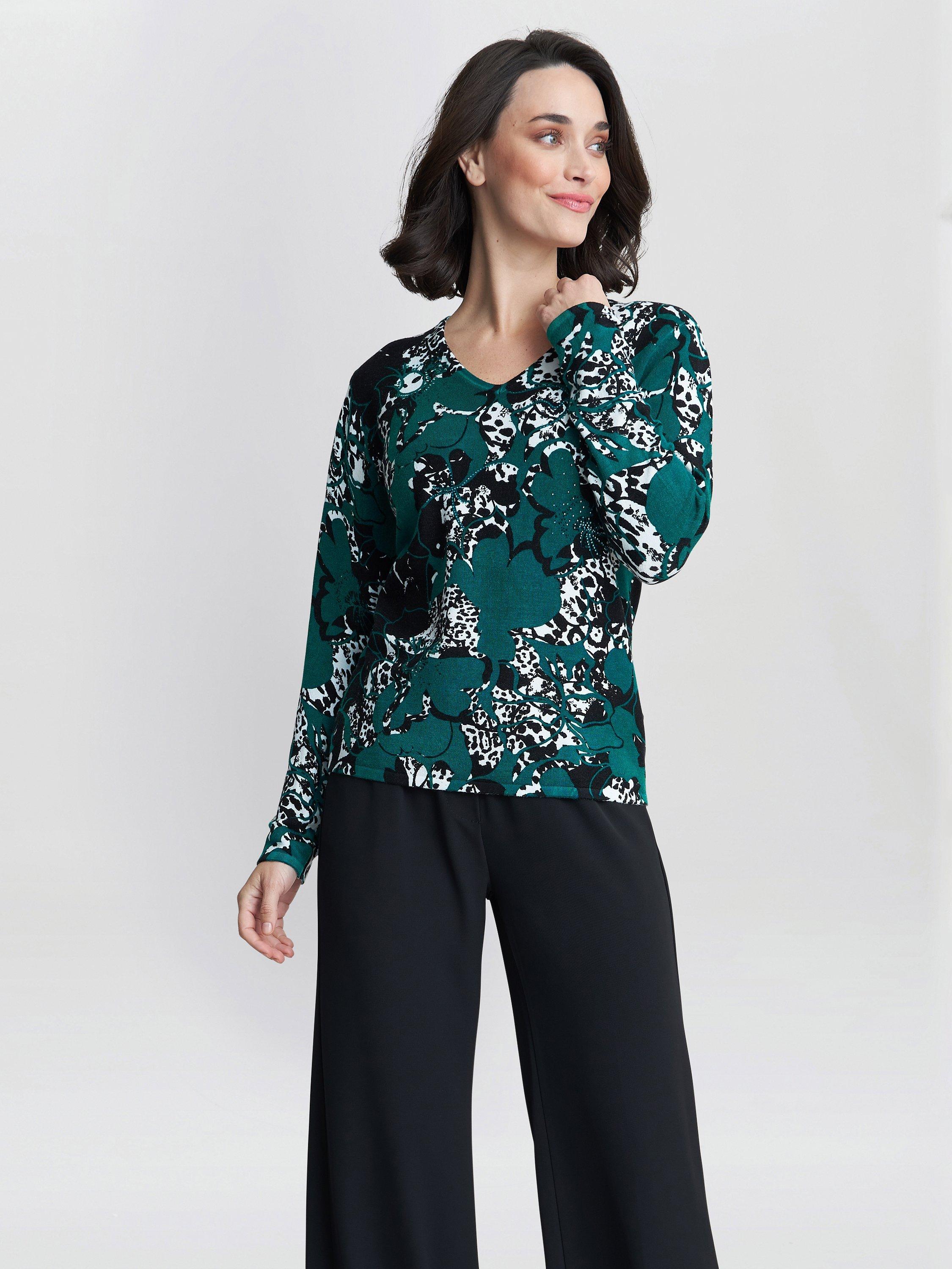 Perfect to dress up or down this season, this jumper comes with a beautifully abstract and vibrant print throughout. Finished with a simple and classic v-neckline.