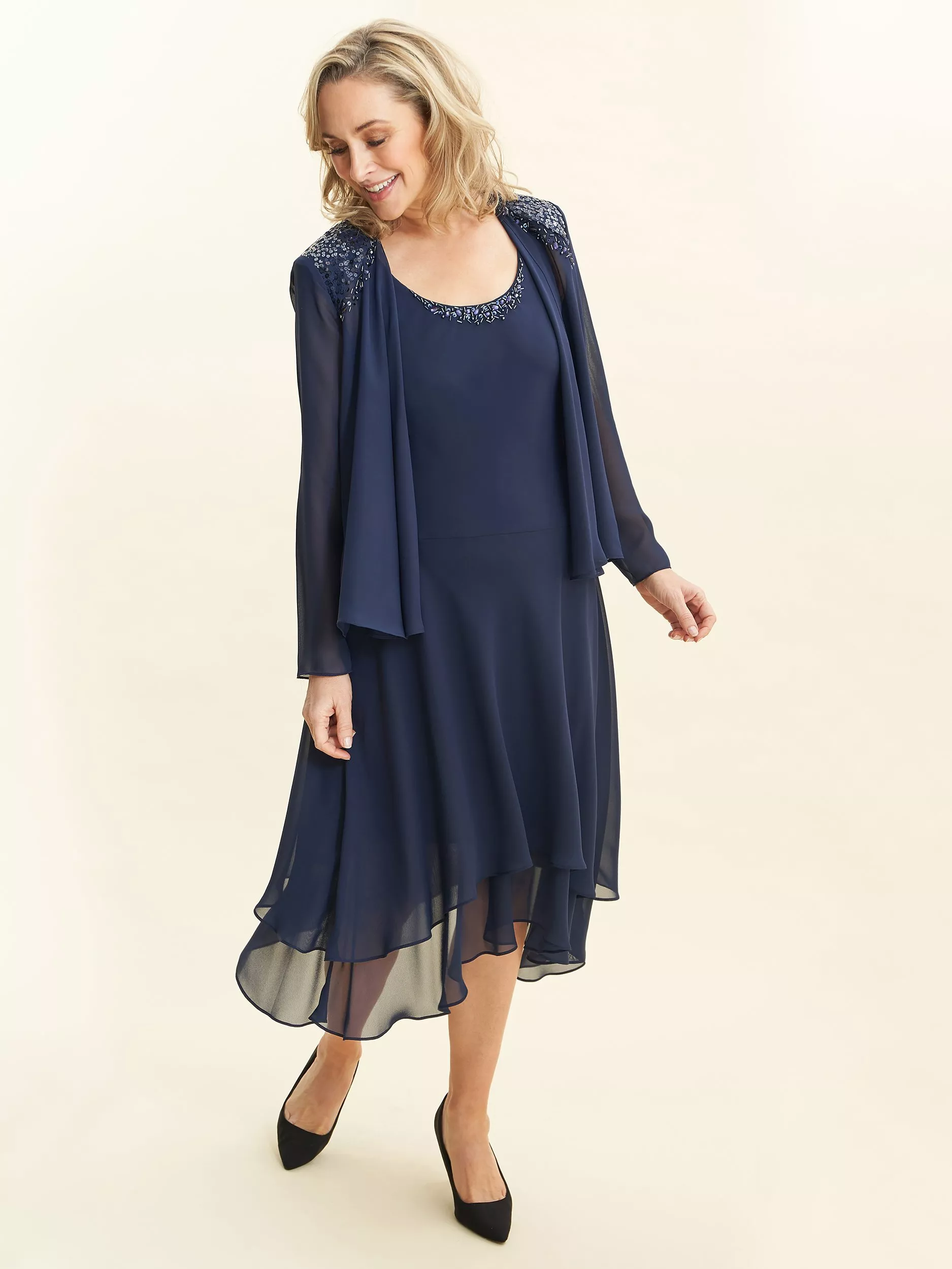 A stunning choice, this midi dress from Gina Bacconi is detailed with a beaded neckline and tiers of flowy chiffon. In a tank sheath silhouette, this style comes together with a matching lace-shoulder jacket.