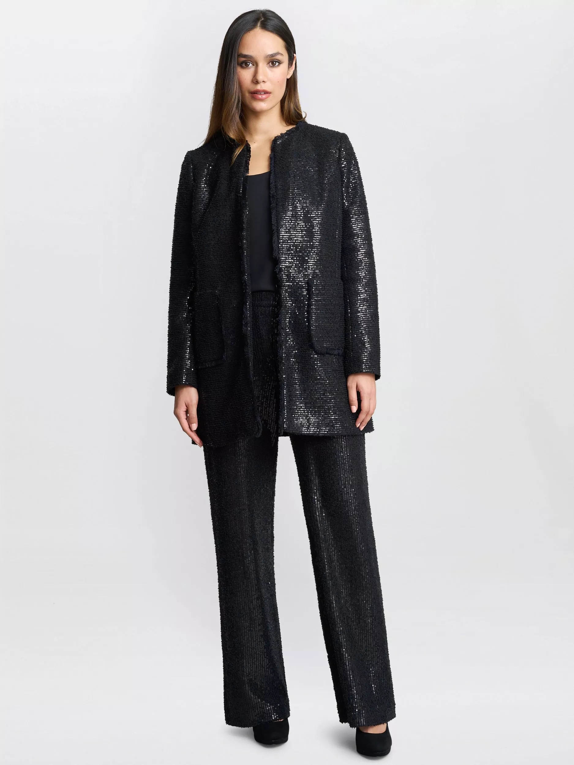 A beautiful knit sequin jacket in a long line shape. This jacket features a delicate fray edge and patch pockets. This jacket is unlined with no buttons.