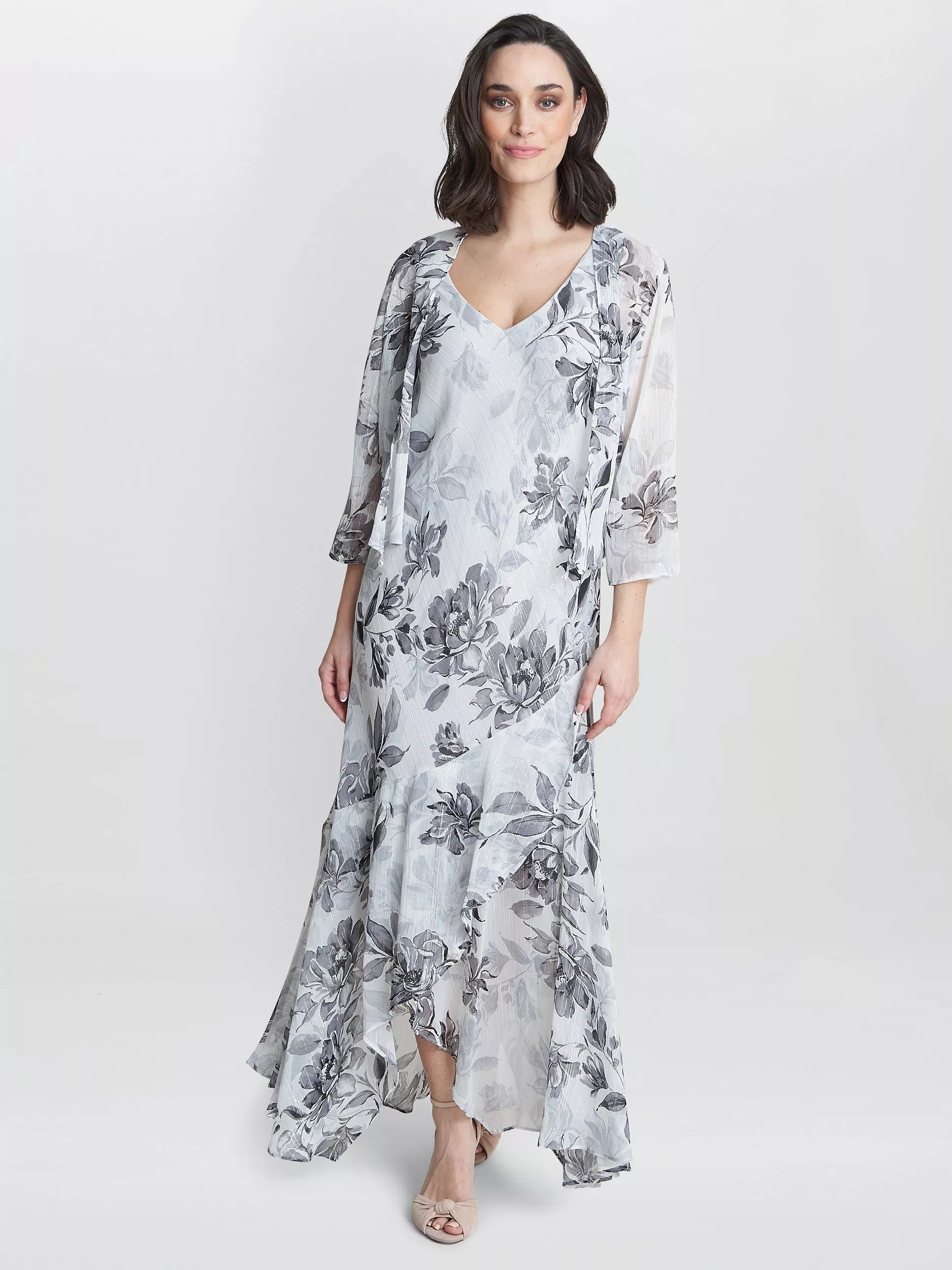 Crafted to a universally flattering silhouette, this delicate two-piece set from Gina Bacconi features a bias cut dress with a matching jacket cover up with small crystal waterdrop beads. Falling to the floor, it guarantees that if muted floral prints are your thing, you'll love this.