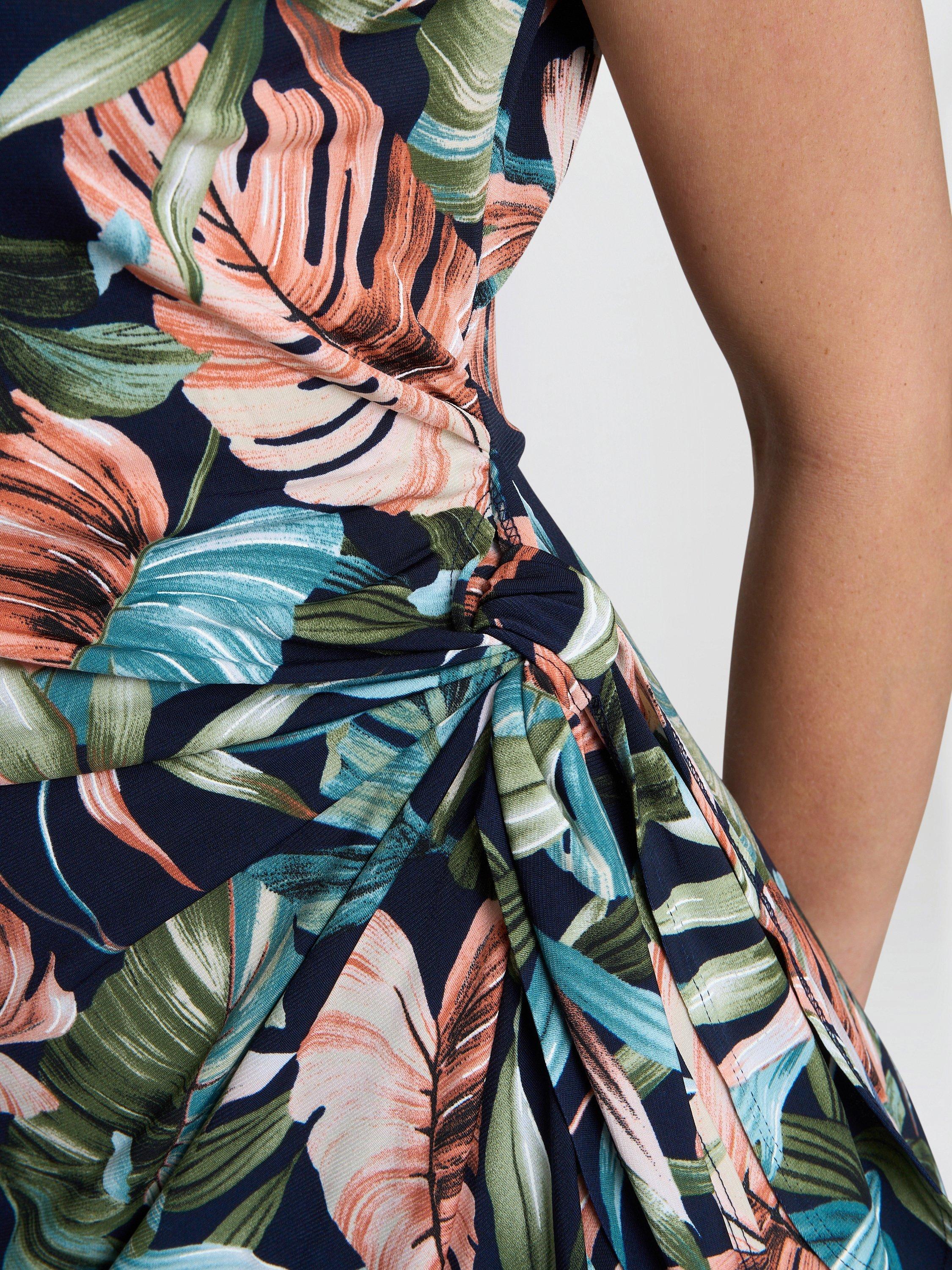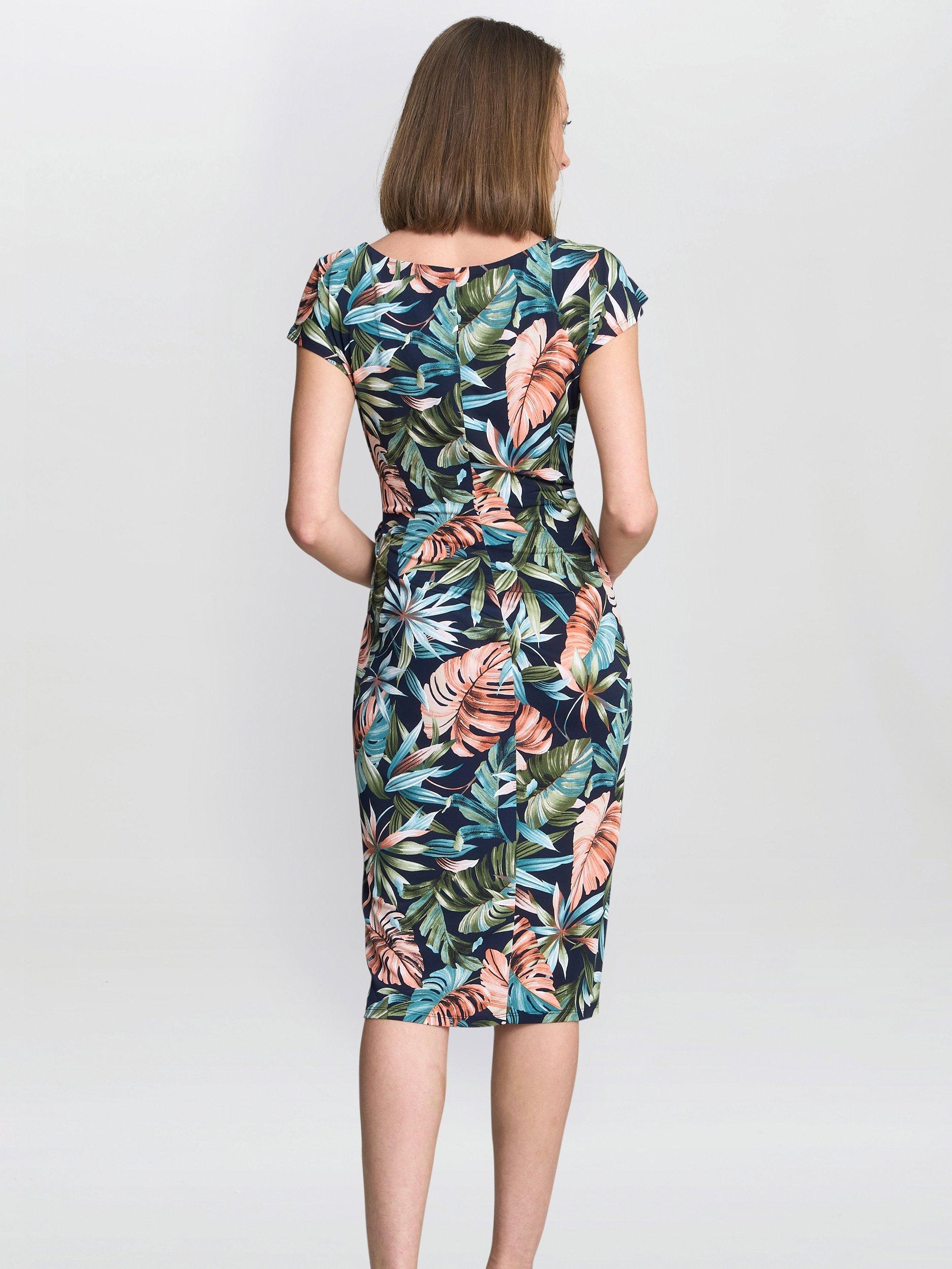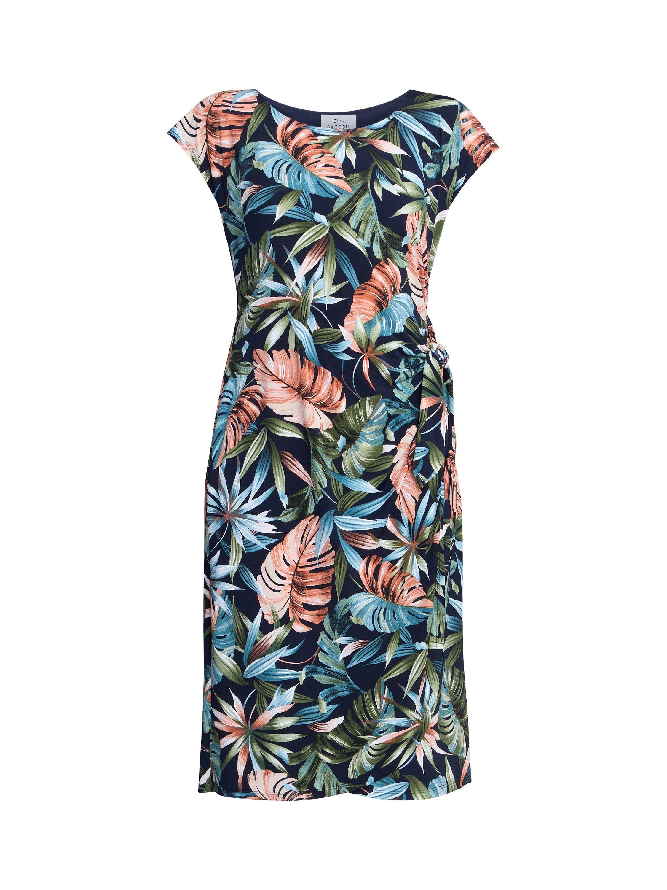 Effortlessly stylish and perfect for summer, this gorgeous jungle leaf print jersey dress combines comfort with charm. Featuring a flattering wrap-style skirt and a classic cap sleeve bodice, it's an easy go-to for relaxed days out or chic lunches with friends.