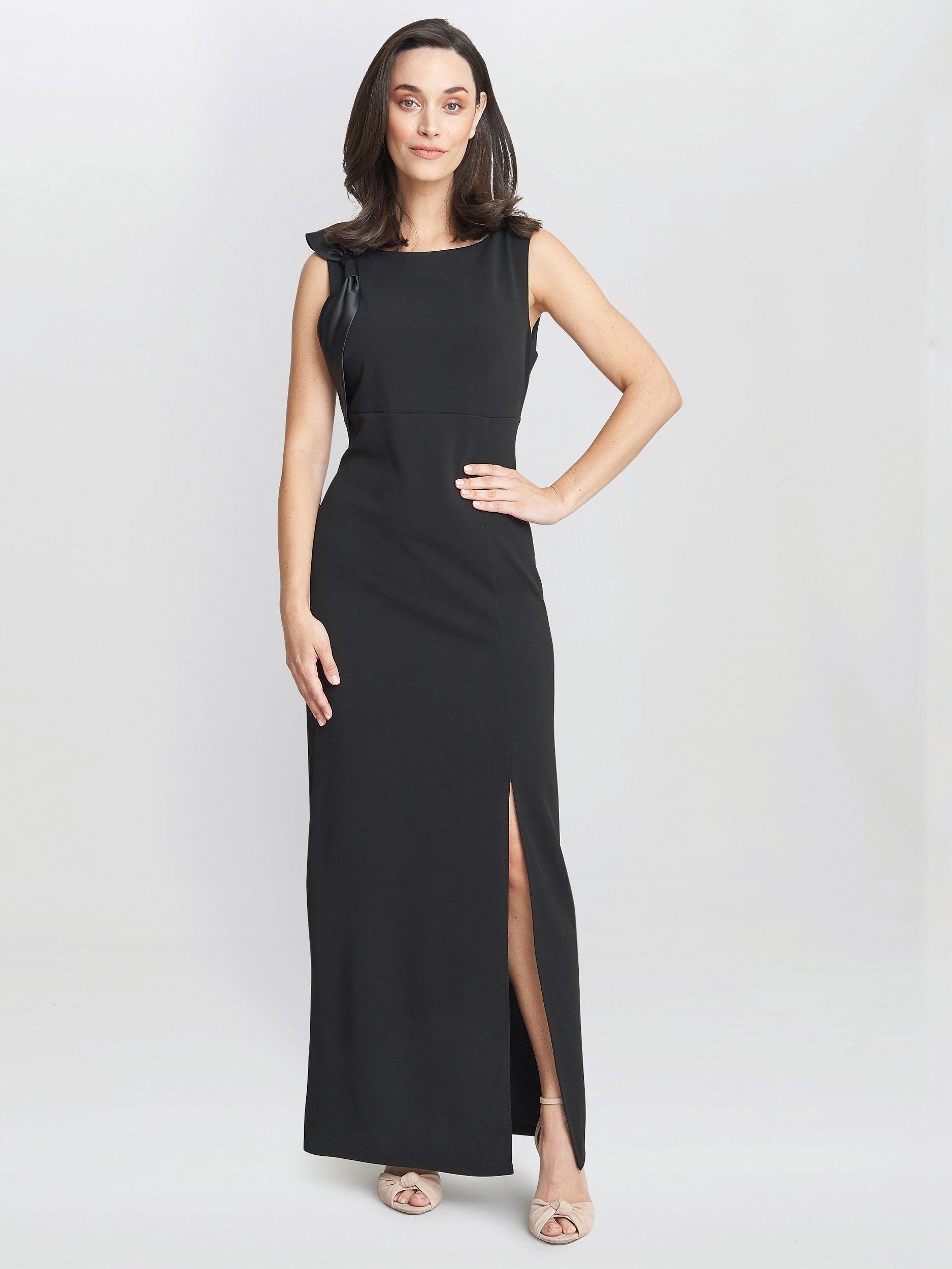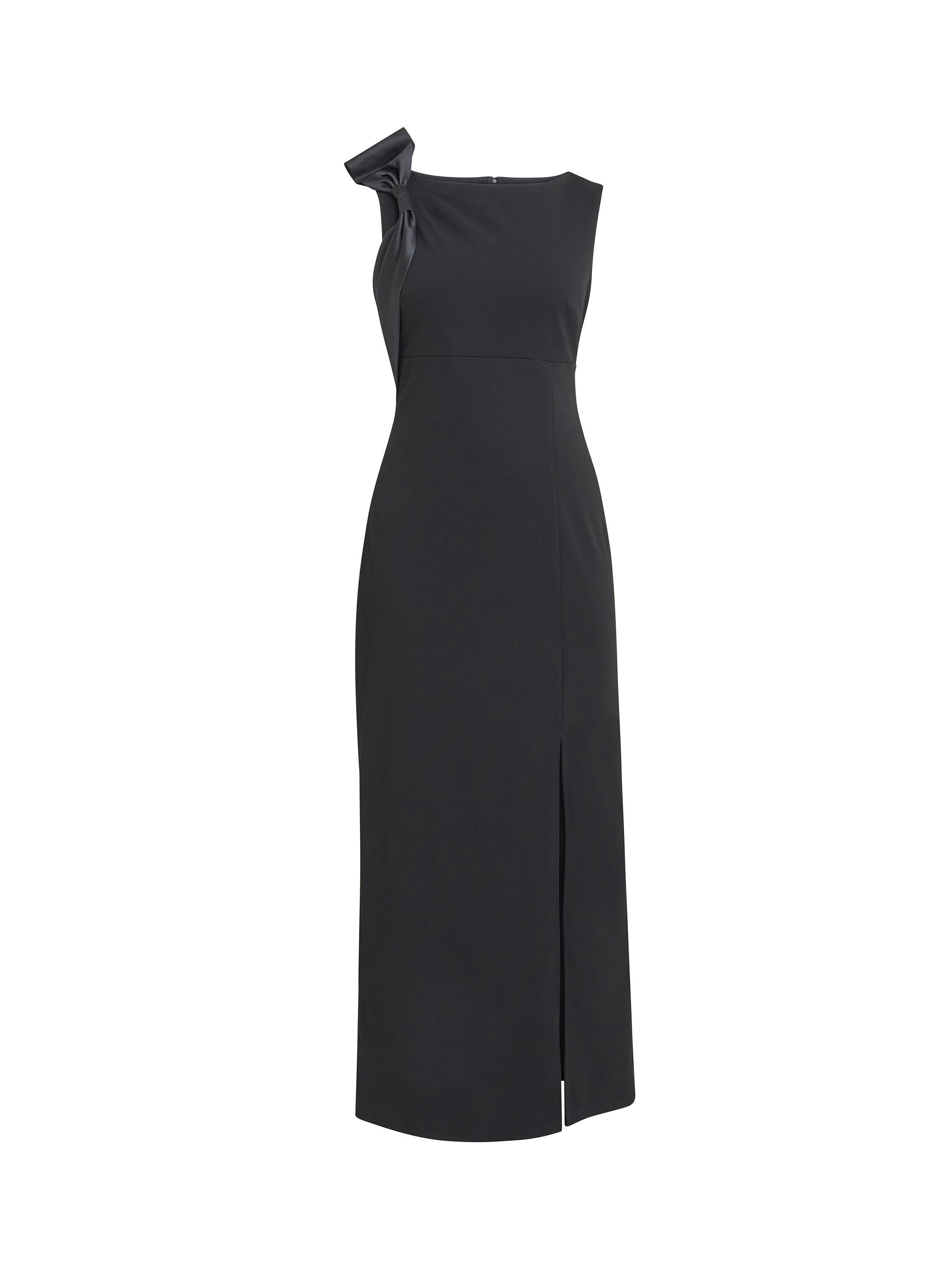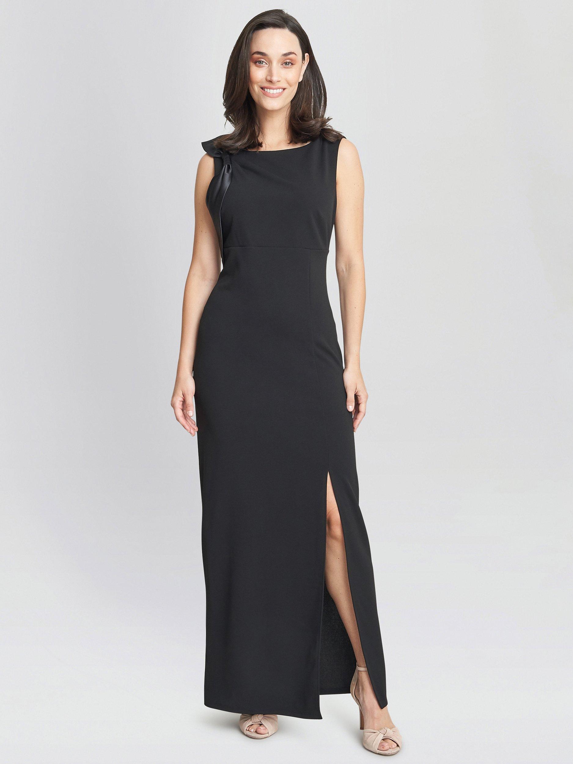 Sculpted with tailoring lines and defined with a satin bow accent on one shoulder, this elegant dress from Gina Bacconi parades a bateau neckline on a sleeveless bodice. Flourishing a full back with a concealed zipper closure, a high slit dominates the skirt as it forms a sheath silhouette that brushes at the ankles. Pair with sparkling accessories.