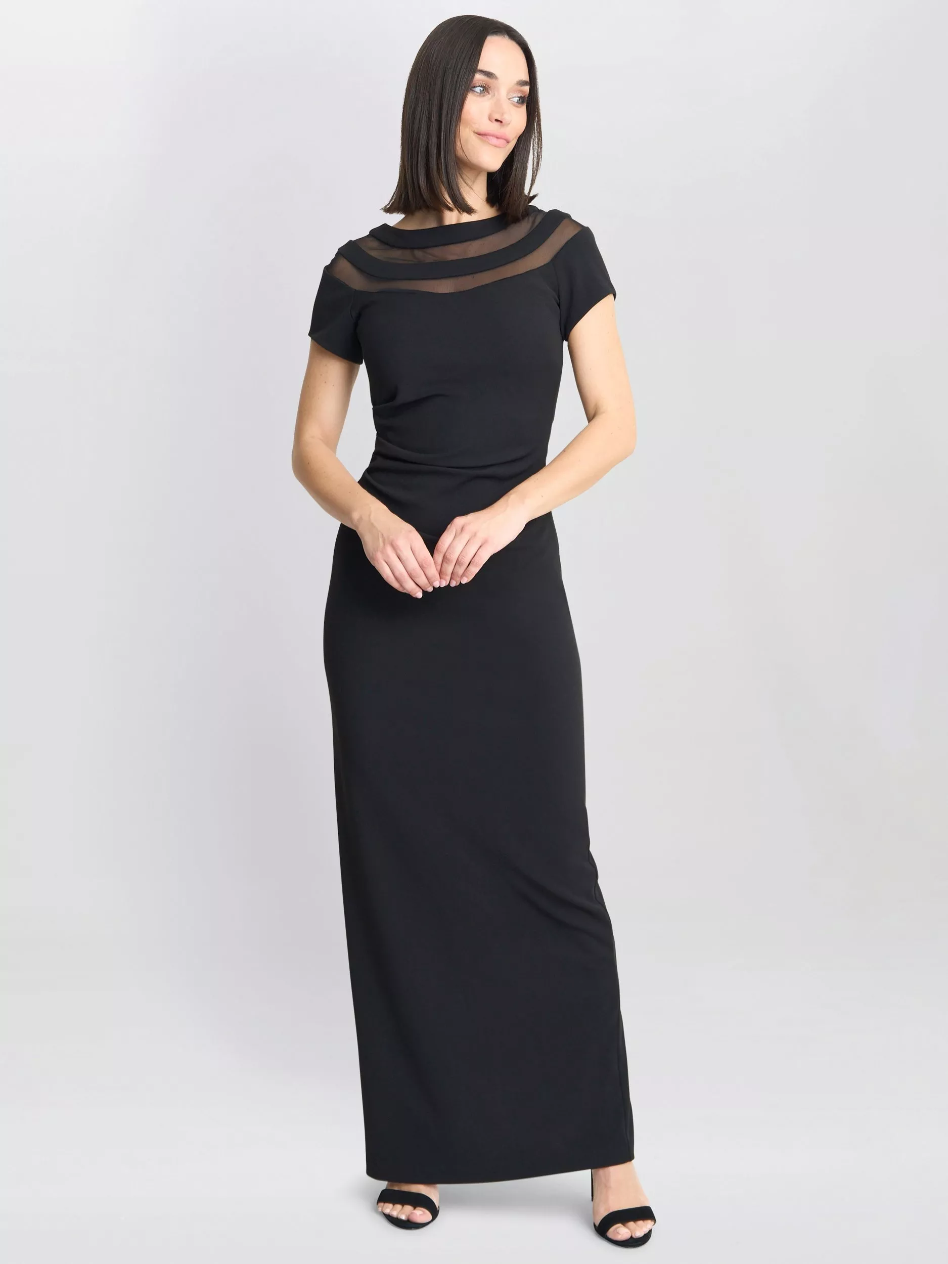 A simple yet glamourous dress by Gina Bacconi. This dress features at-shirt shape, illusion neck line and back rushing. This dress is lined.