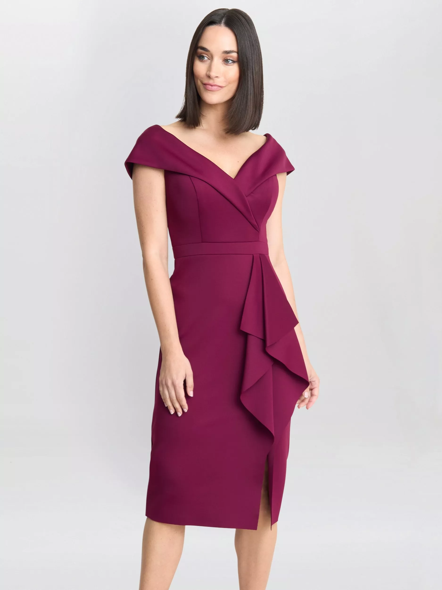 A elegant wide v-neck dress with a cascadding frill at the left hip. This dress can be worn fully off the shoulders. This dress is lined.