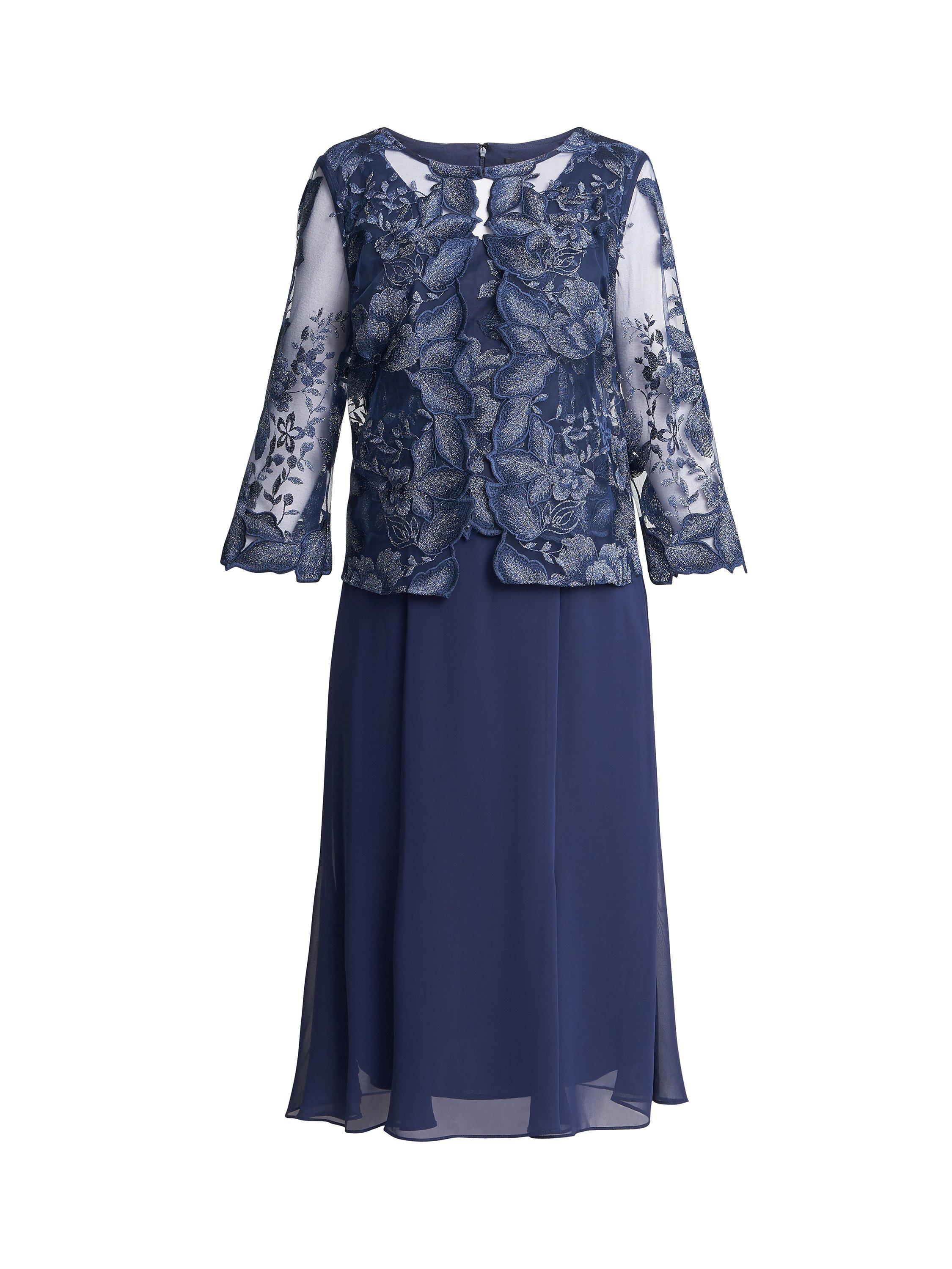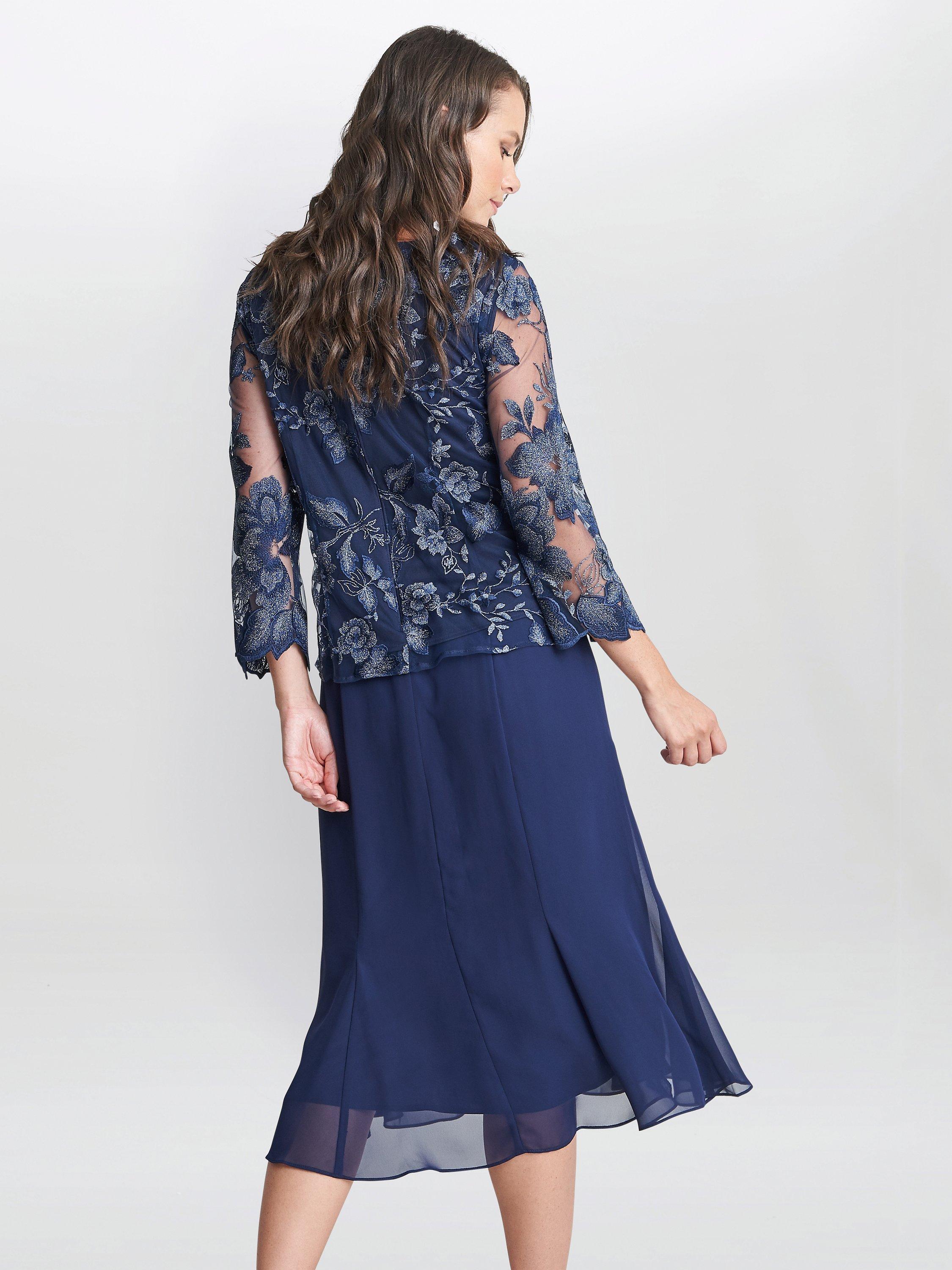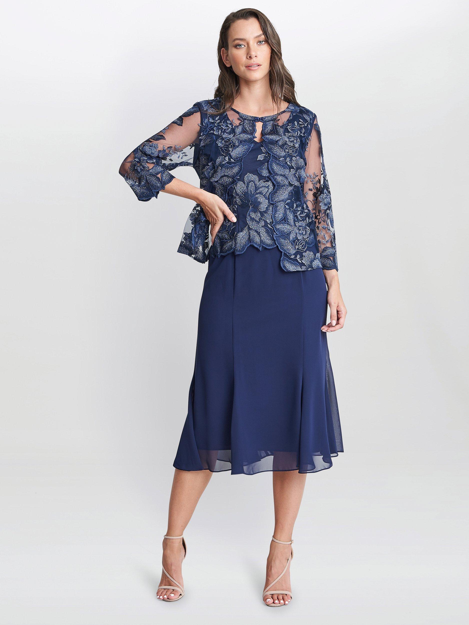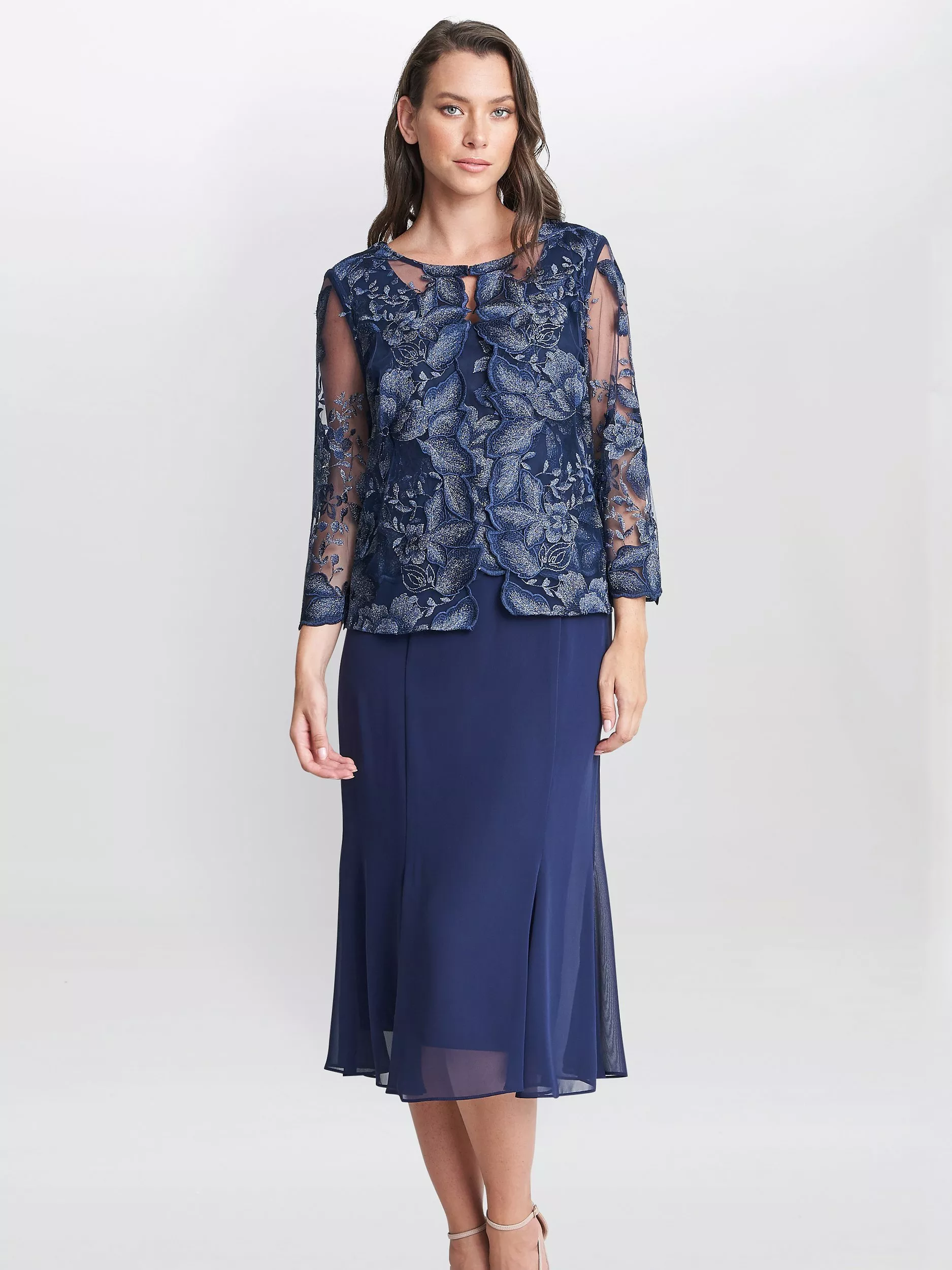 In an A-line silhouette with a floral lace overlay, this midi dress by Gina Bacconi complements bold accessories with its plain canvas.
