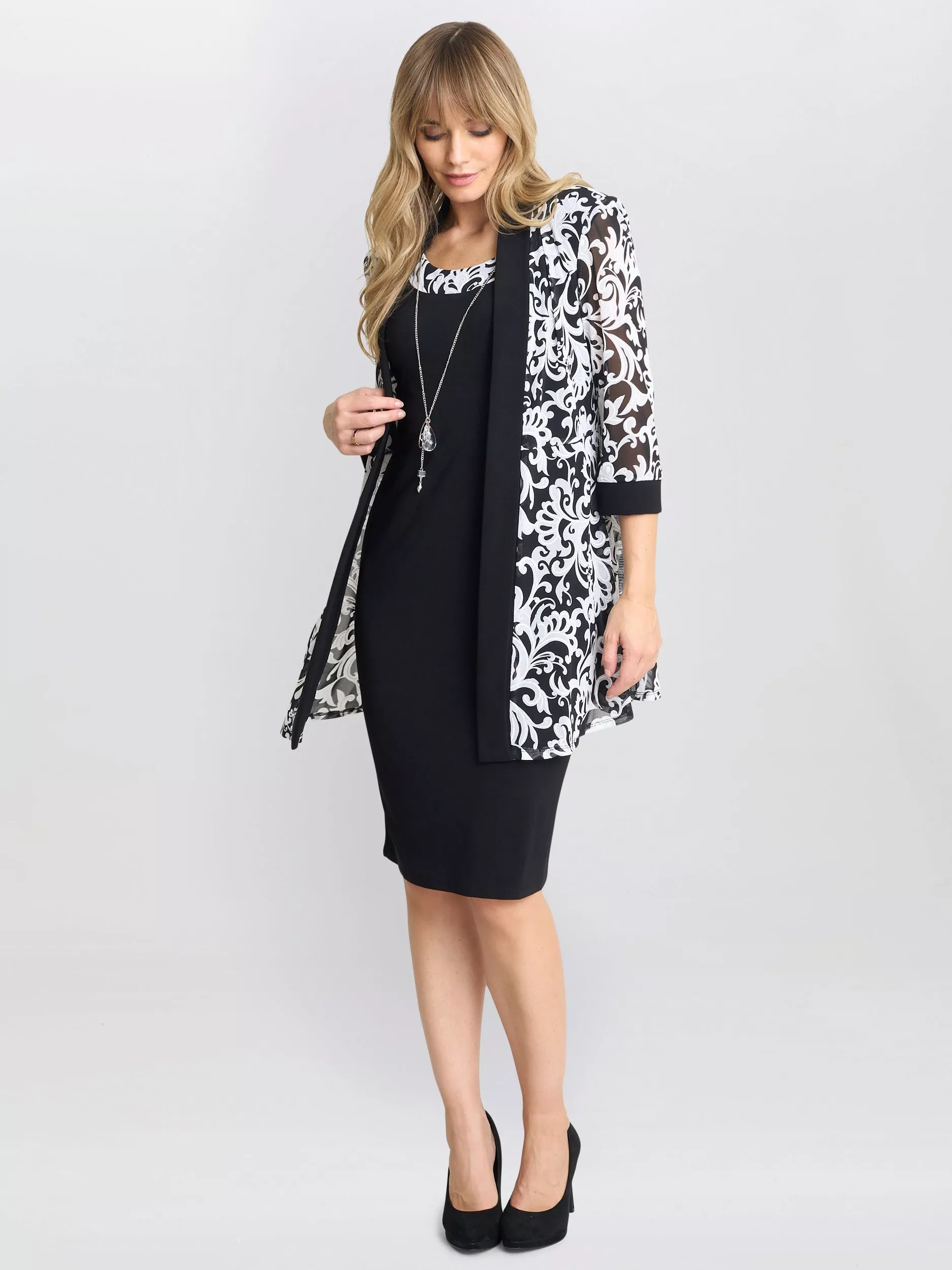 Strike a pose in this print 2-piece dress and jacket ensemble. Wearable and comfortable this look oozes style and elegance. The simple sleeveless jersey shift dress has the jackets print fabric around the neckline and a detachable necklace. The simple, swing jacket is in a soft mesh and has cuffs and edging with a print body. This dress is unlined and slip on, it measures 102cm from high shoulder point.