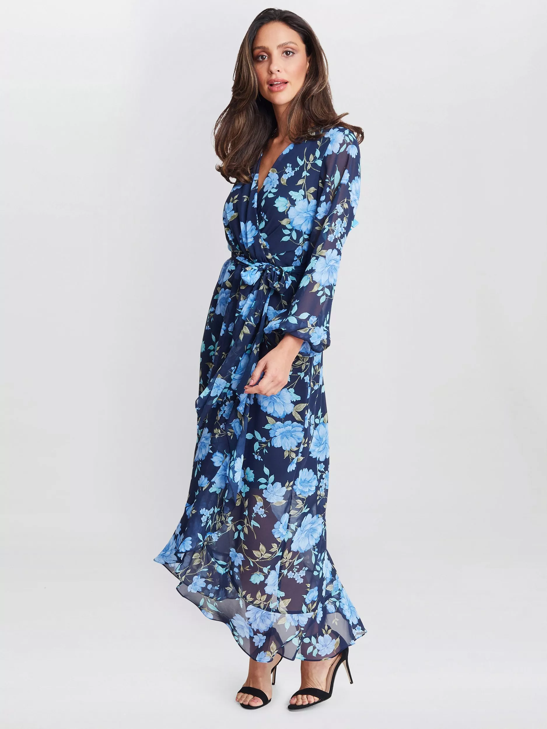 This beautiful faux wrap floral dress is perfect for day to evening. If features a delicate frill hem and high low effect. Dress up with heels or throw on boots for a day look. The sleeves have and elastic cuff.