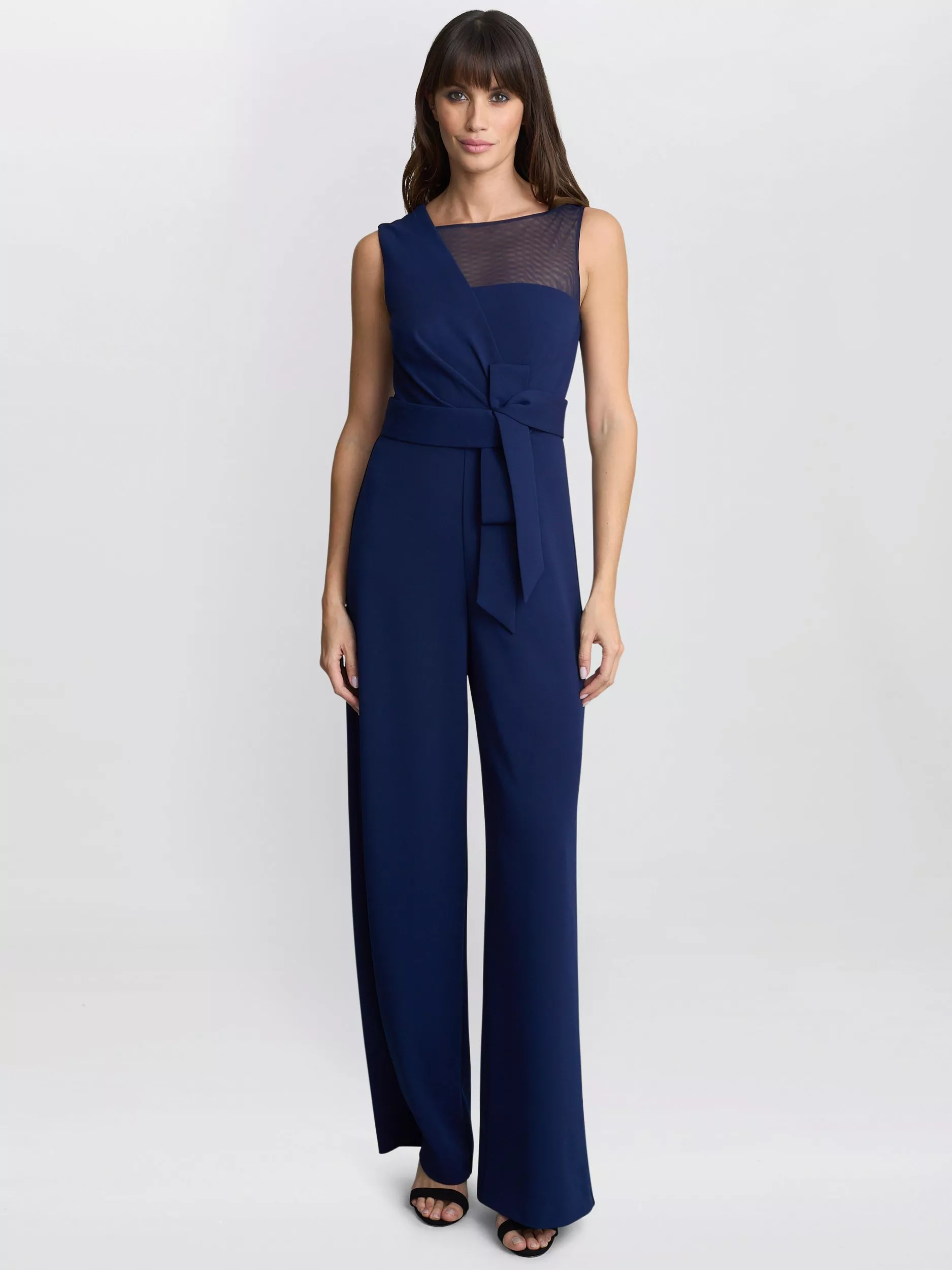 This elegant soft stretch crepe jumpsuit sure is a winner for any occasion. Featuring a sleeveless design with an asymmertical sheer mesh panel across the upper chest and shoulder, adding a touch of sophistication. The waistline is emphasized with a belt tied into a stylish bow.