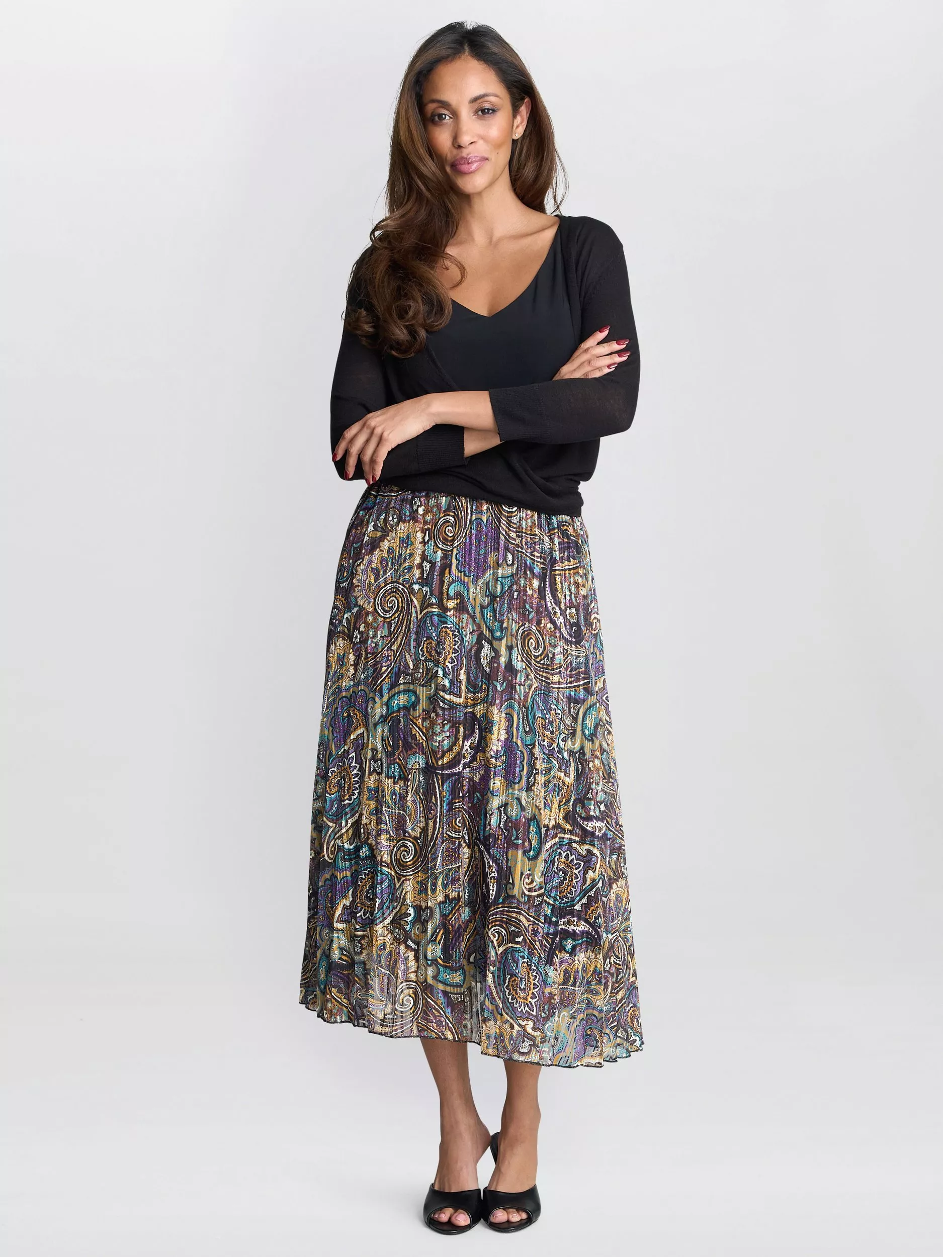 Balanced by a pleated A-line, this midi skirt from Gina Bacconi is built with a mid rise and paisley print. Fastens with a zip.