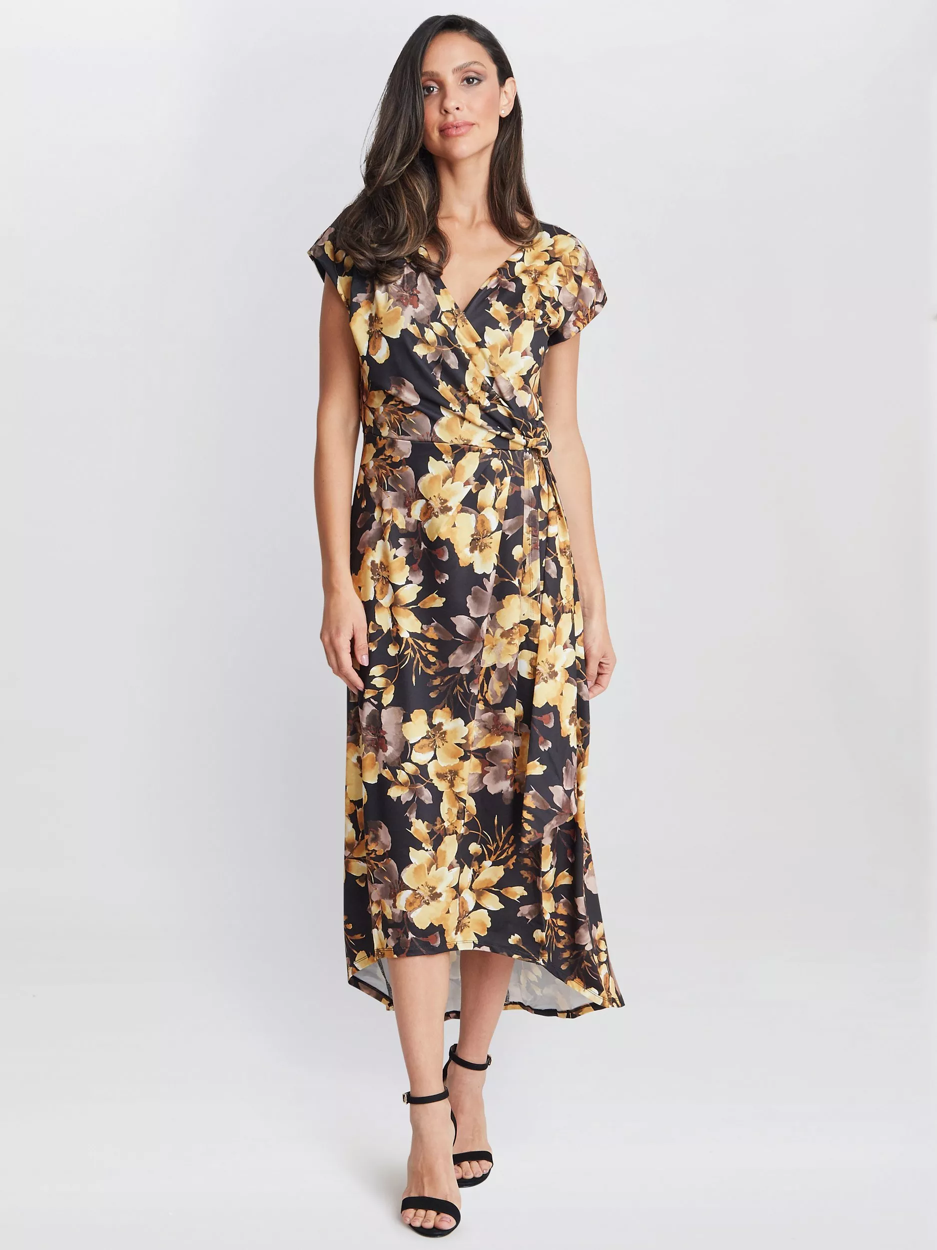 This hi-low floral, faux wrap dress features an elasicated waist for easy wear. This dress is elegant and flattering, in a great winter floral print! Wear with heels or boots.