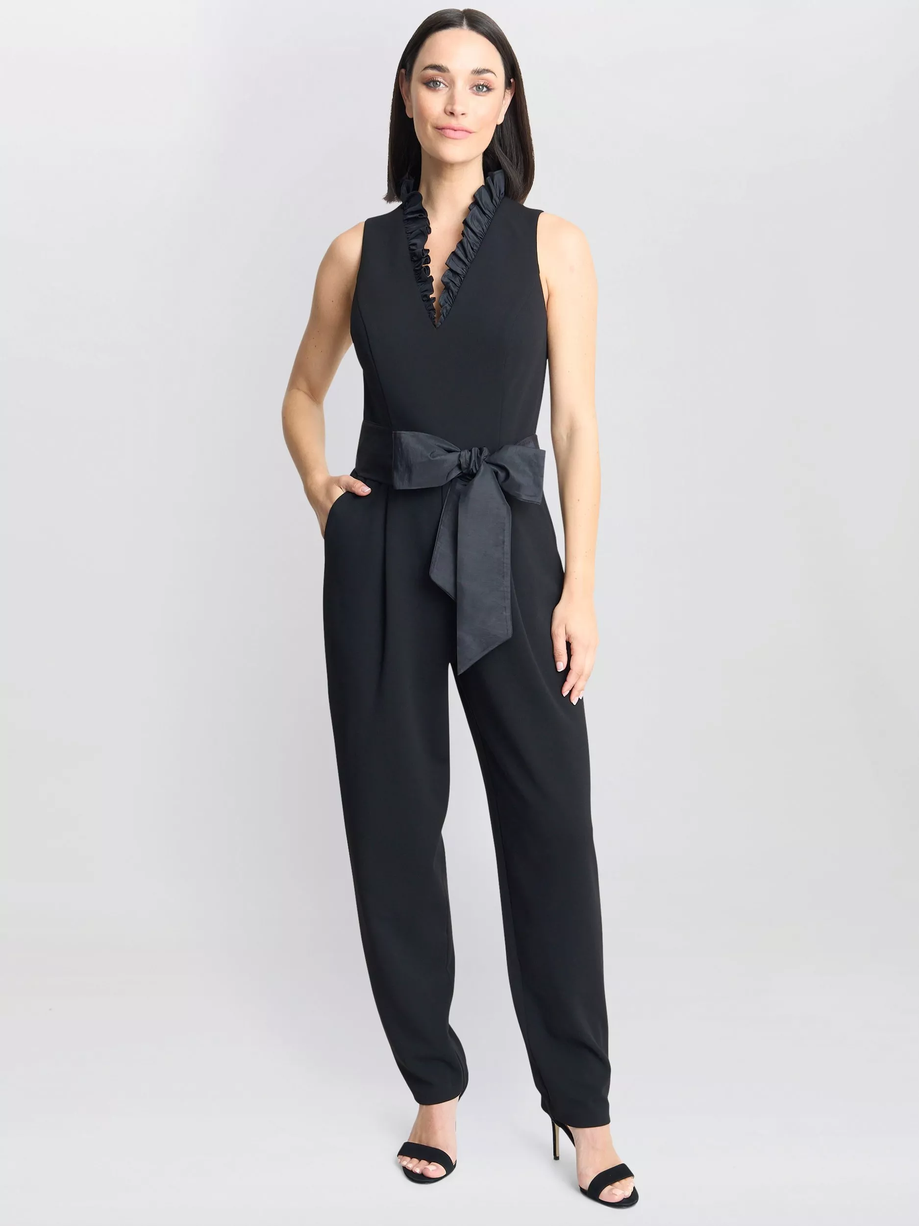 This chic Gina Bacconi jumpsuit features a sleeveless cut and a deep V- neckline with ruffled detailing for a sophisticated touch. The waistline is emphasised with a belt tied into a stylish bow, adding a flattering silhouette. The leg design is straight, offering a timeless and versatile look. The jumpsuit is unlined and back features a zip.