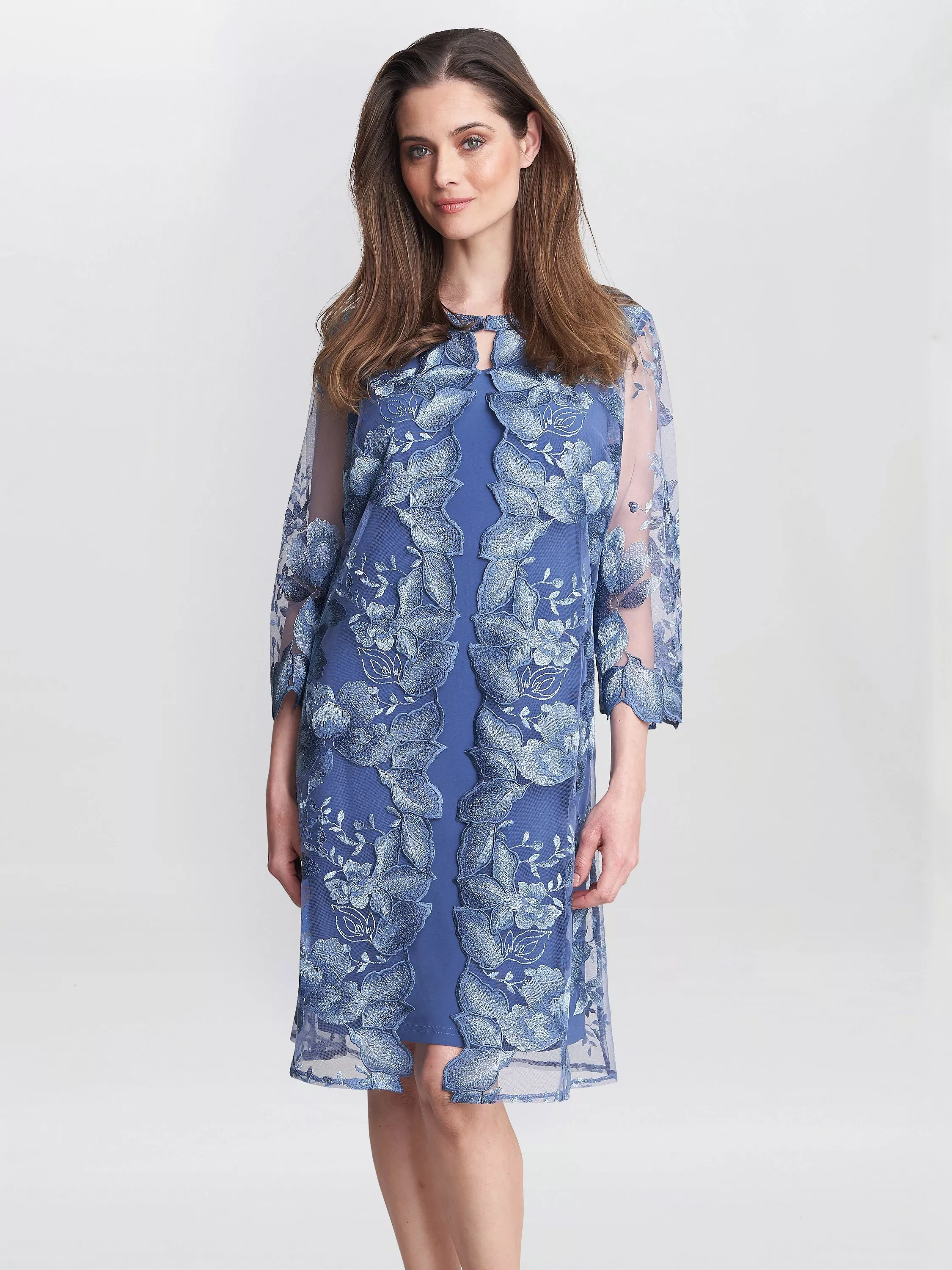 A fuss-free choice thanks to the shift cut, this knee length dress from Gina Bacconi is crafted from a lightweight fabric. With a fuss-free round neckline and three quarter length sleeves, this style has an embroidered design.