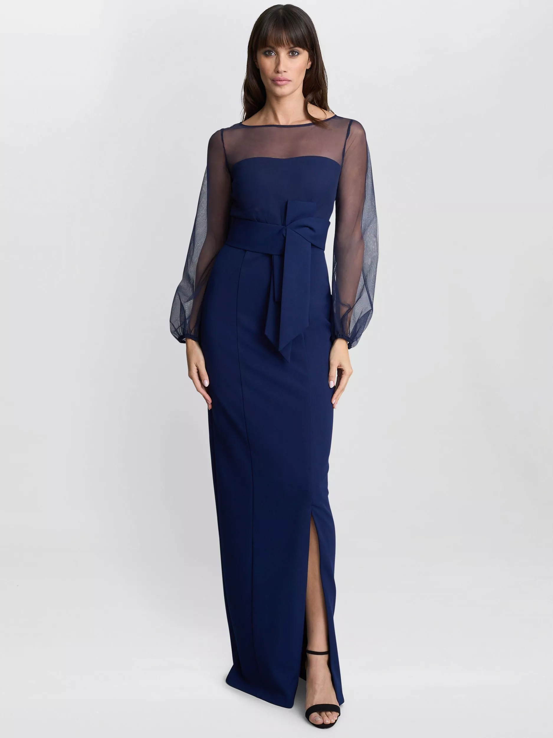 This Gina Bacconi maxi dress sure is a winner for any special occasion, featuring a sophisticated design. It has sheer long sleeves and a sheer collar that adds a delicate, feminine touch. The waist is cinched with a fabric tie belt for a flattering silhouette. The dress falls to a maxi length, with a front slit that adds a hint of glamour.