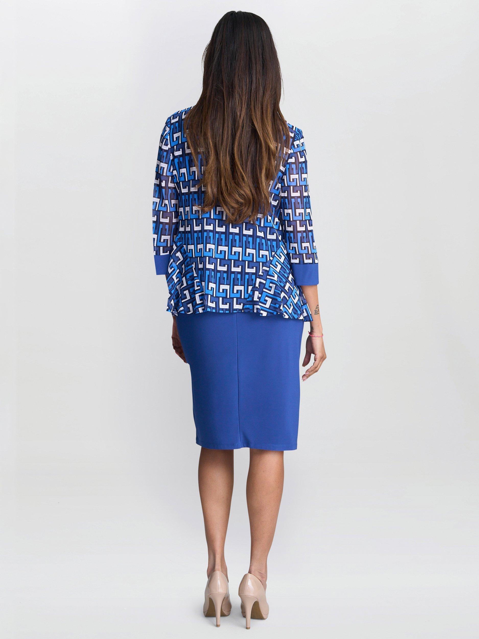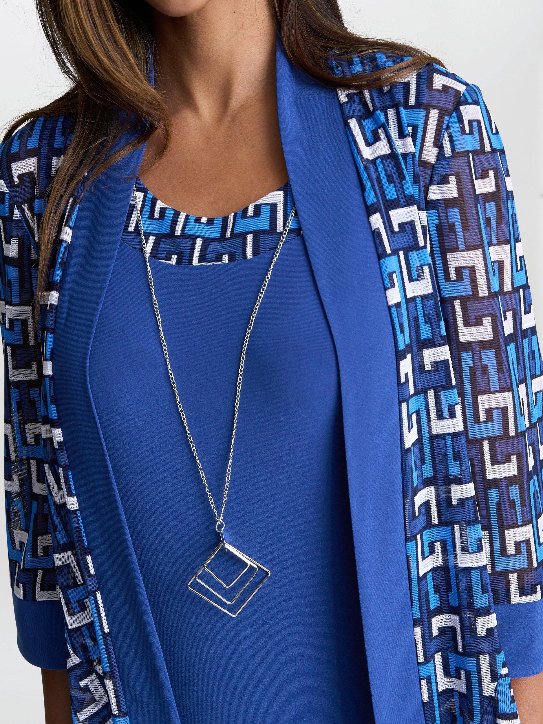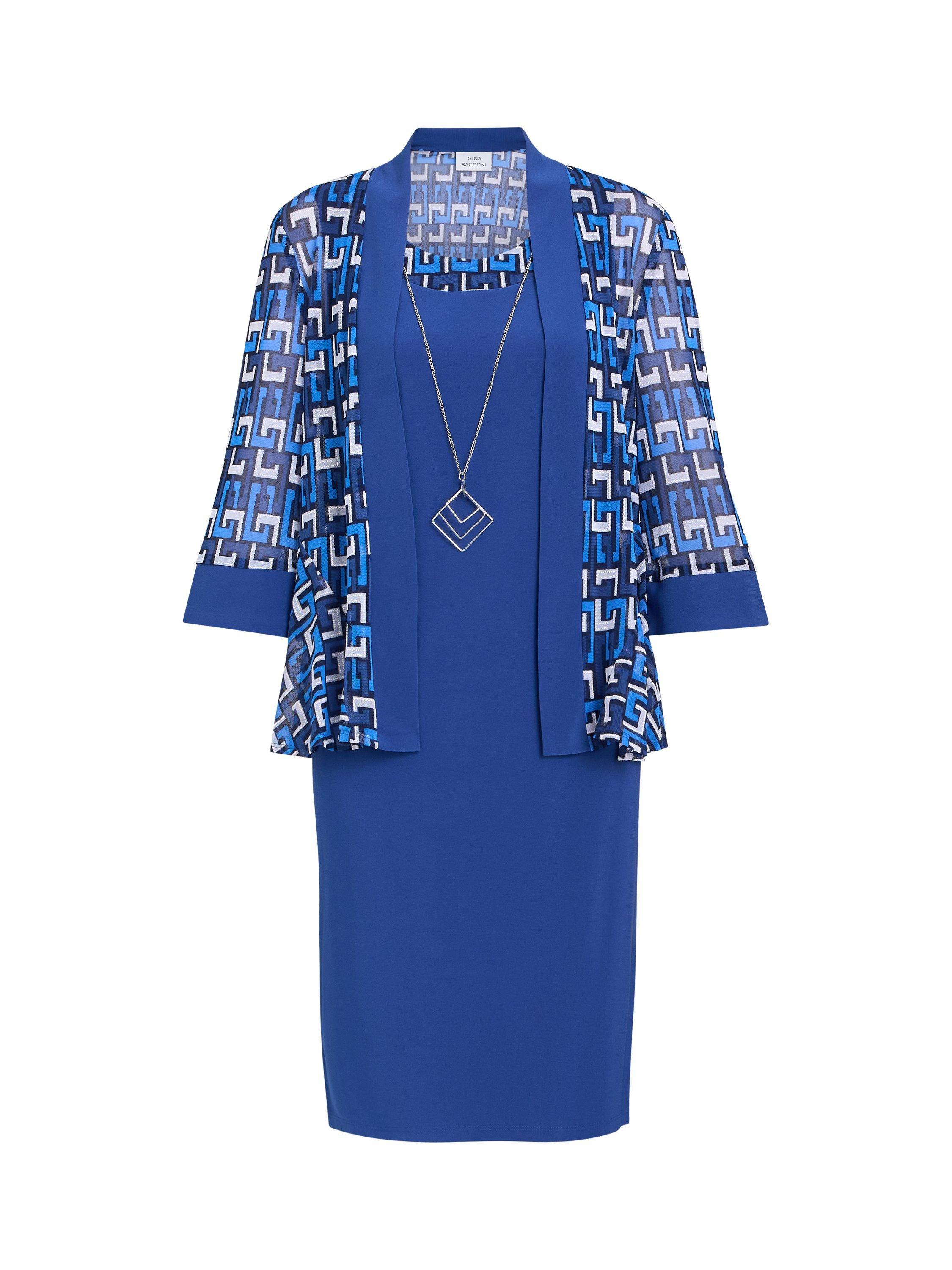The Sofia print dress and jacket is a knee-length, dress with an abstract design jacket. The dress is sleeveless and has a round neckline. The jacket is lightweight, open front, and features a three-quarter sleeve design.