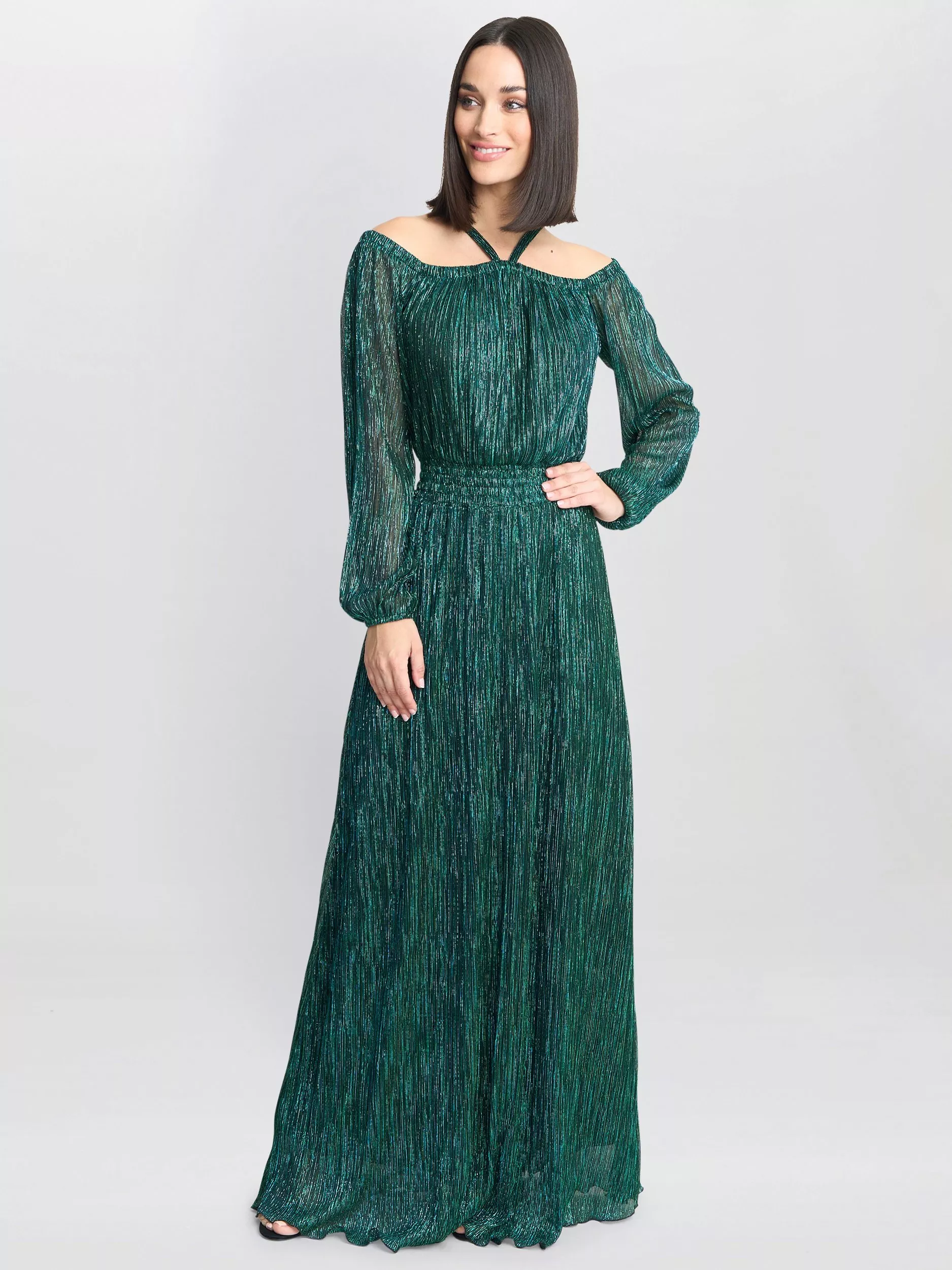 The metallic plisse off the shoulder Sylvia dress is sure to be a hit! The off the shoulder style is balanced with small neck straps. This gives a modern and stylish look, as well as a secure wear! This dress has an elastic sheered waist and no zip. The body and skirt are lined, the sleeves are unlined.