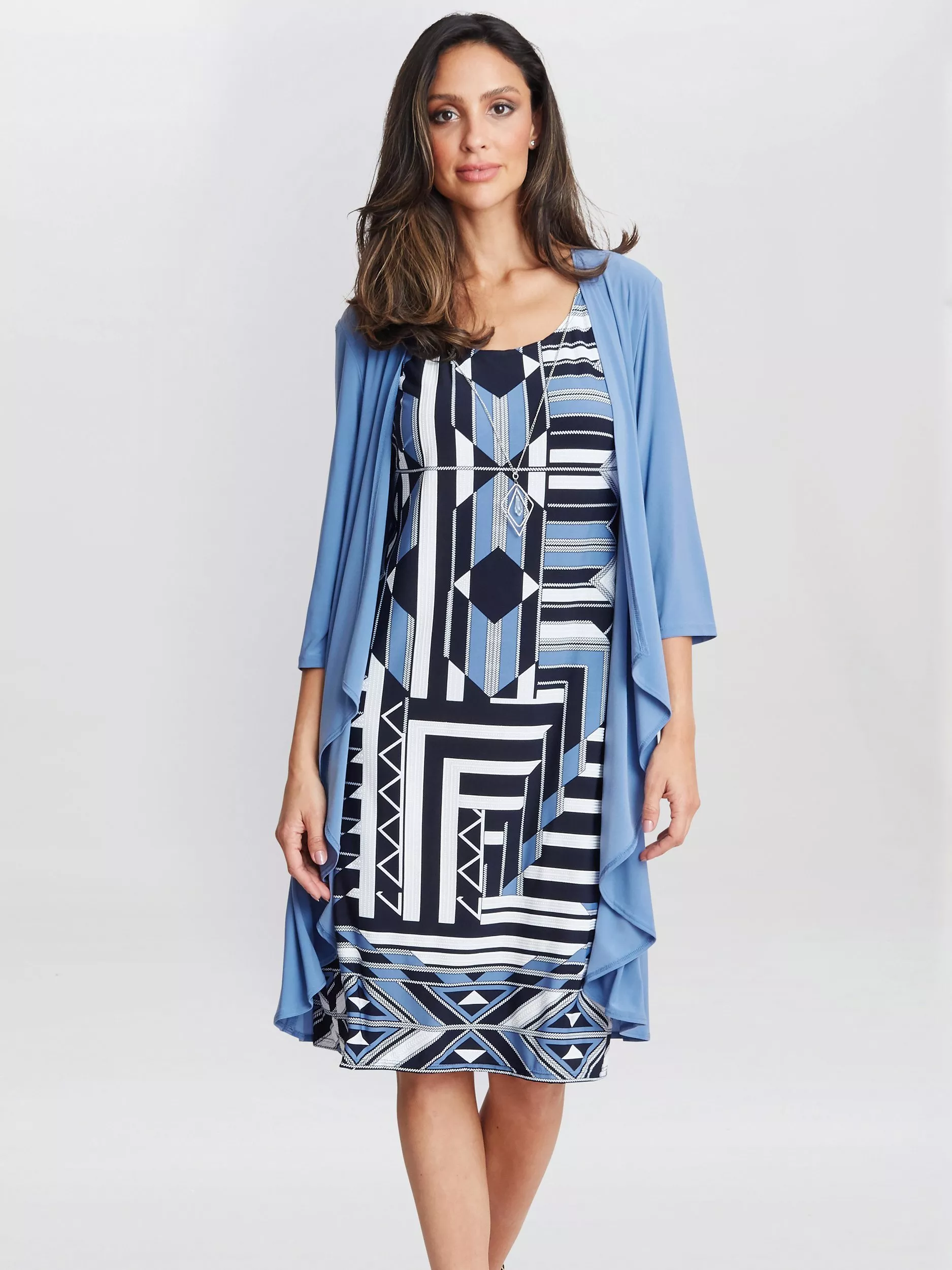 Style you don't need to think about. This ensemble includes a sleeveless jersey dress which comes with a detachable necklace, as well as a coordinating jersey jacket that's cut with a waterfall front and 3/4 length sleeves. Made from a soft fabric with stretch for comfort, it's easy to throw on and features a bold, geometric print.