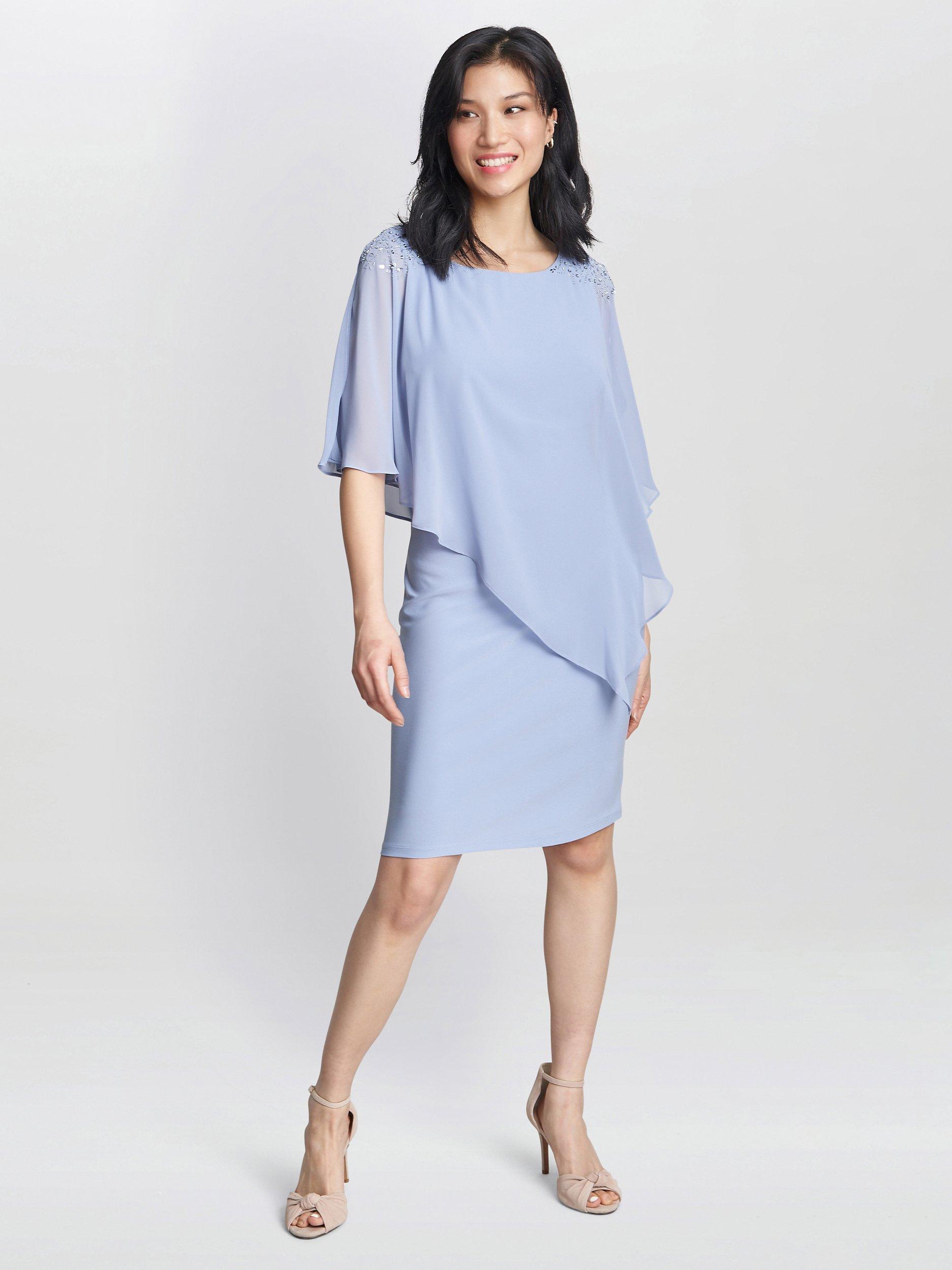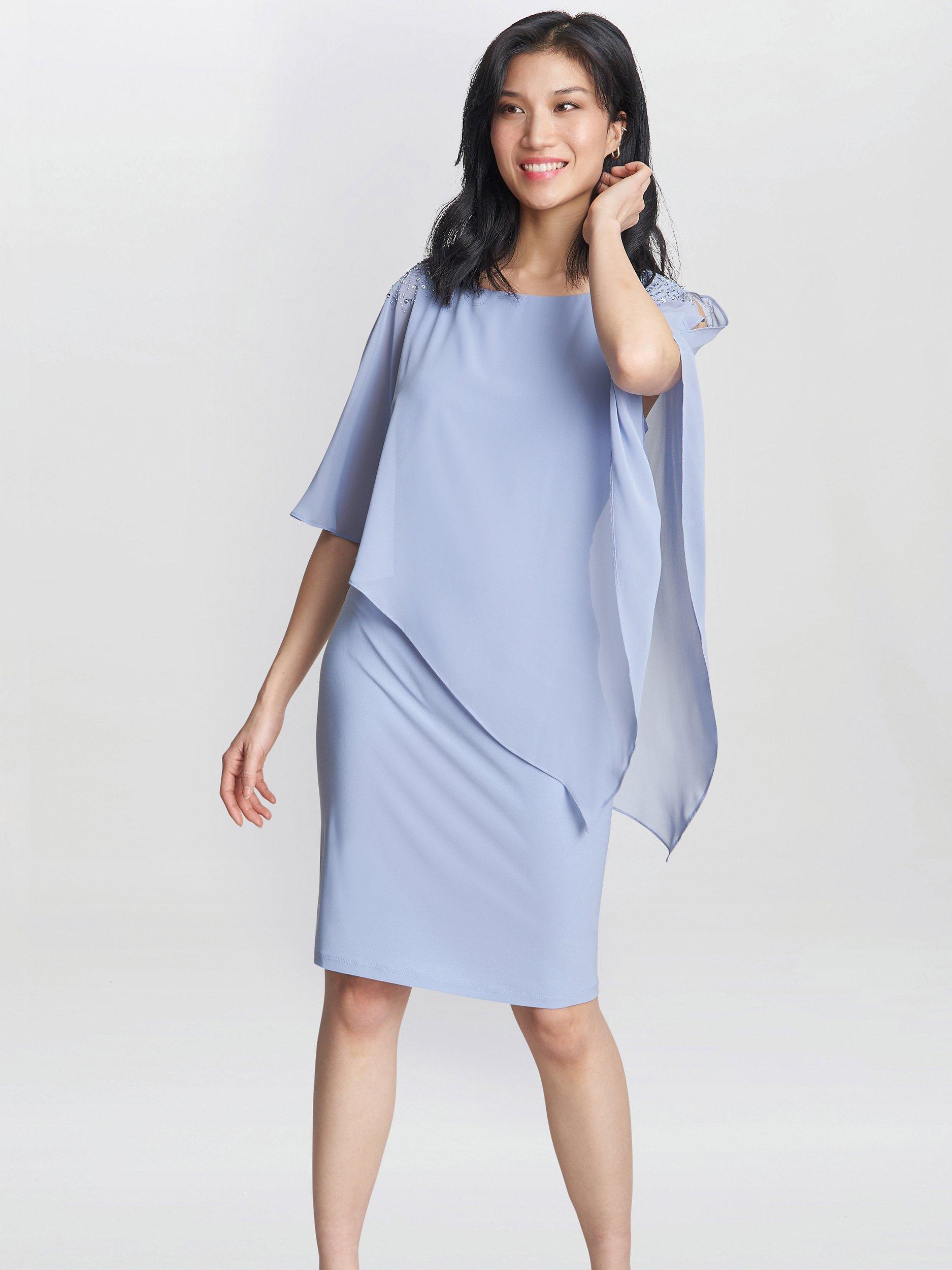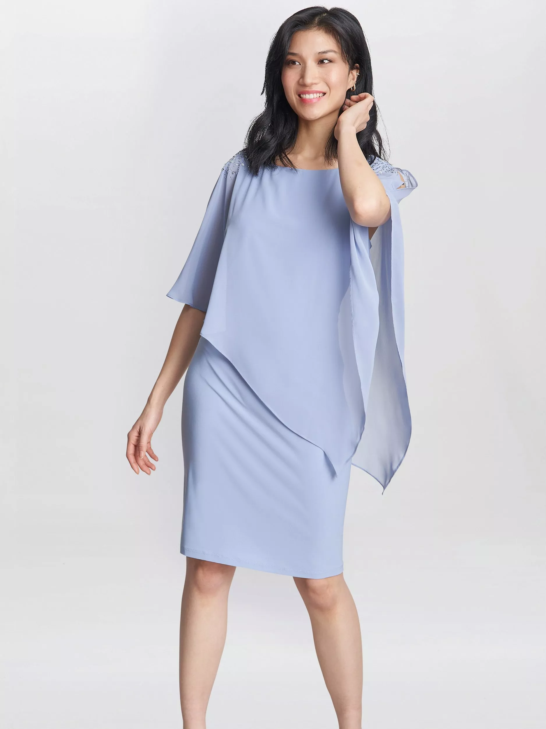 Sprinkled with beadwork on the shoulders and parading a split cold shoulder detail, this dress features a sleeveless bodice with a jewel neckline. The shift skirt sculpts into a knee length hemline. Unveil an sophisticated style in this Gina Bacconi evening dress.