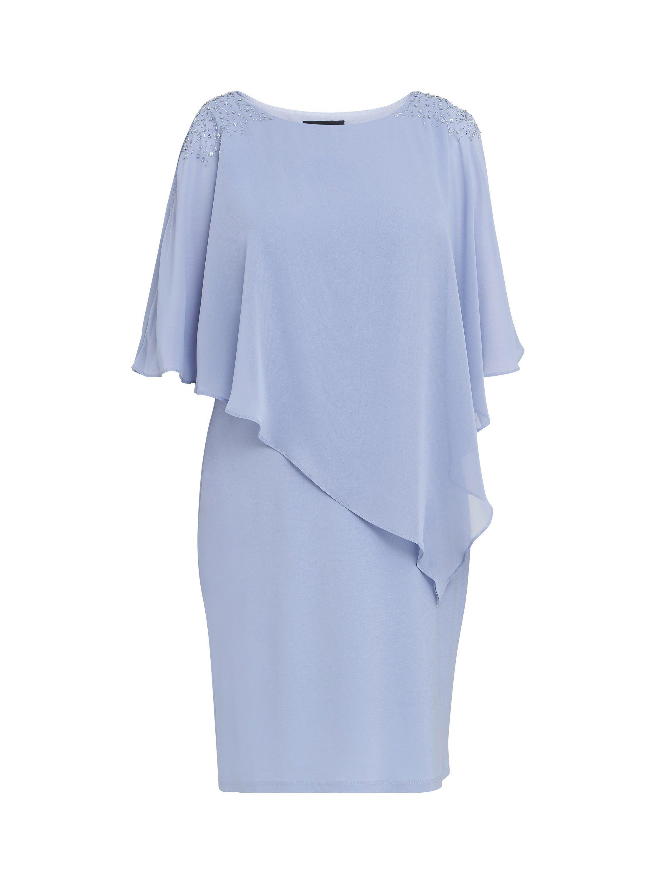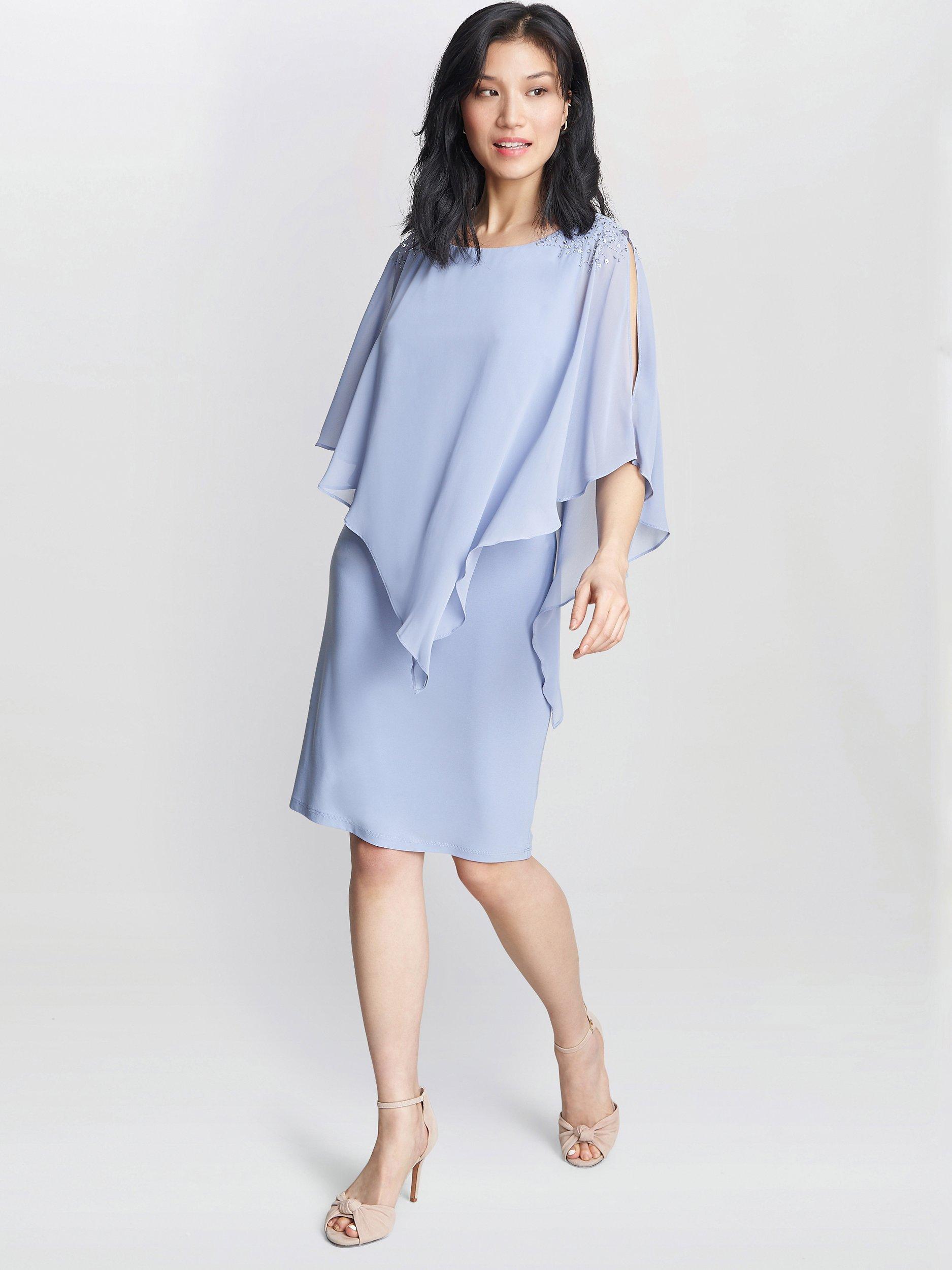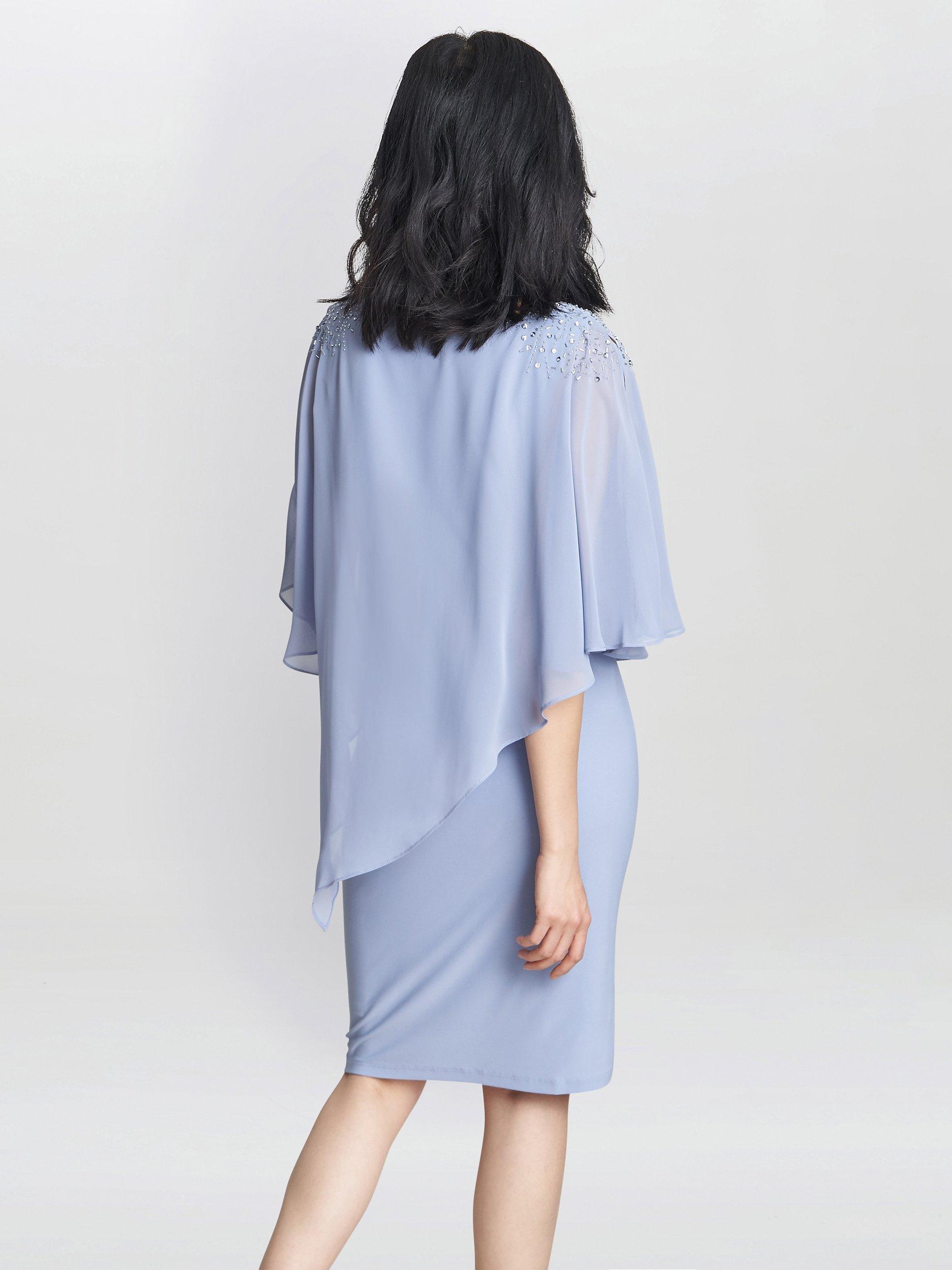 Sprinkled with beadwork on the shoulders and parading a split cold shoulder detail, this dress features a sleeveless bodice with a jewel neckline. The shift skirt sculpts into a knee length hemline. Unveil an sophisticated style in this Gina Bacconi evening dress.