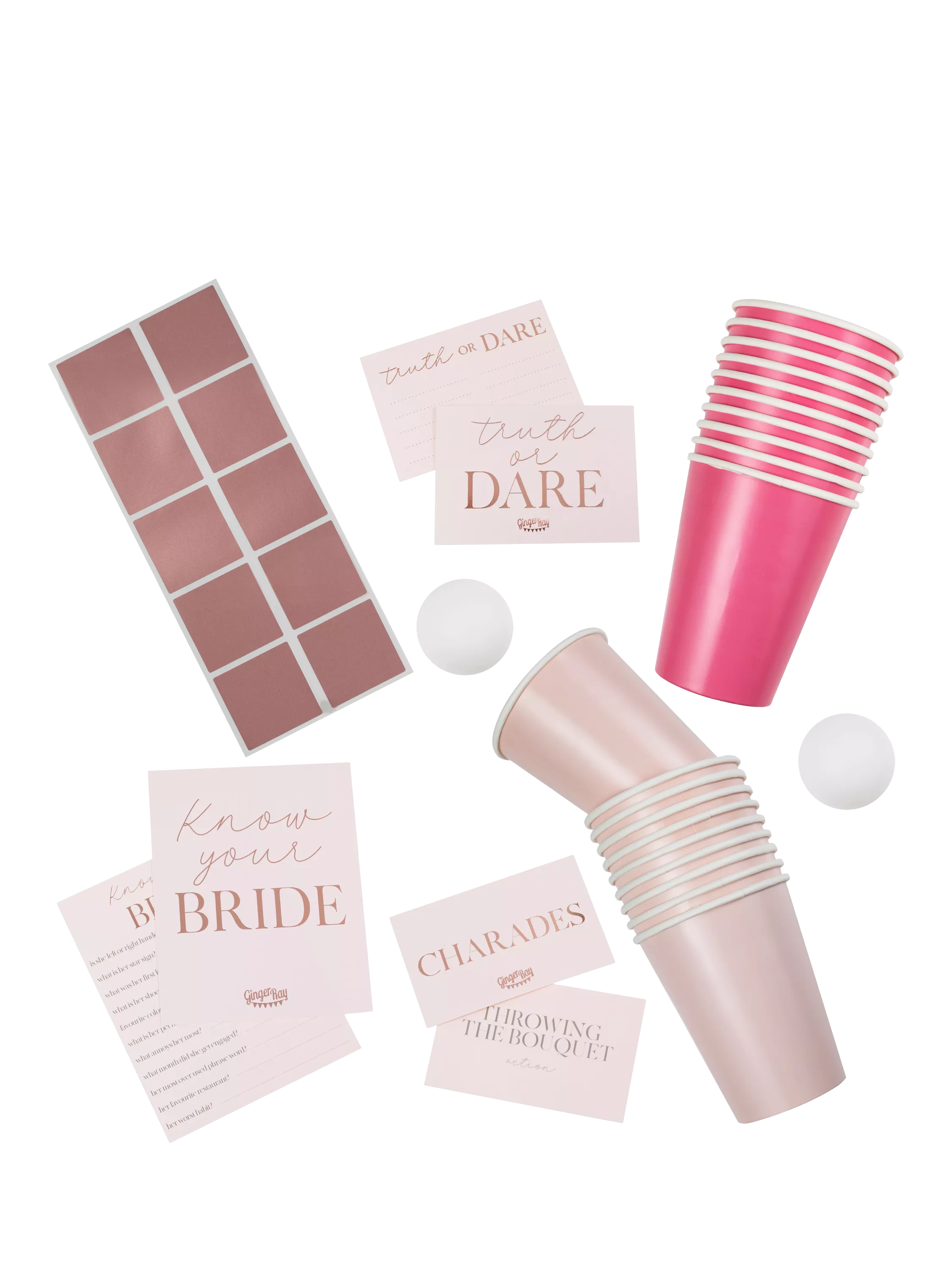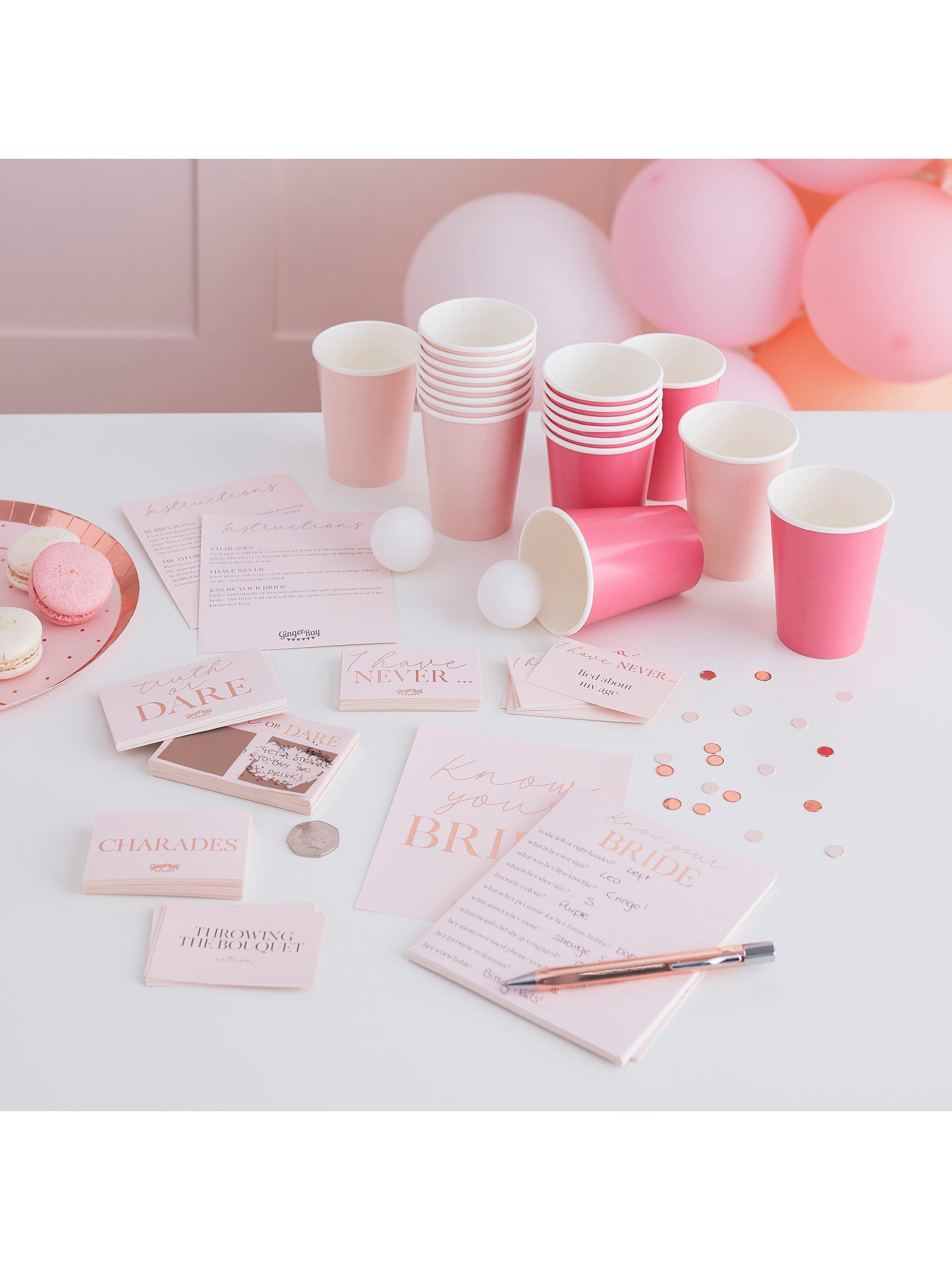 Each pack contains 5 fun hen party games including: 20 cups and 2 pong balls 20 I have never cards 20 charades cards 20 truth or dare cards 10 know your bride cards and 1 instruction sheet.