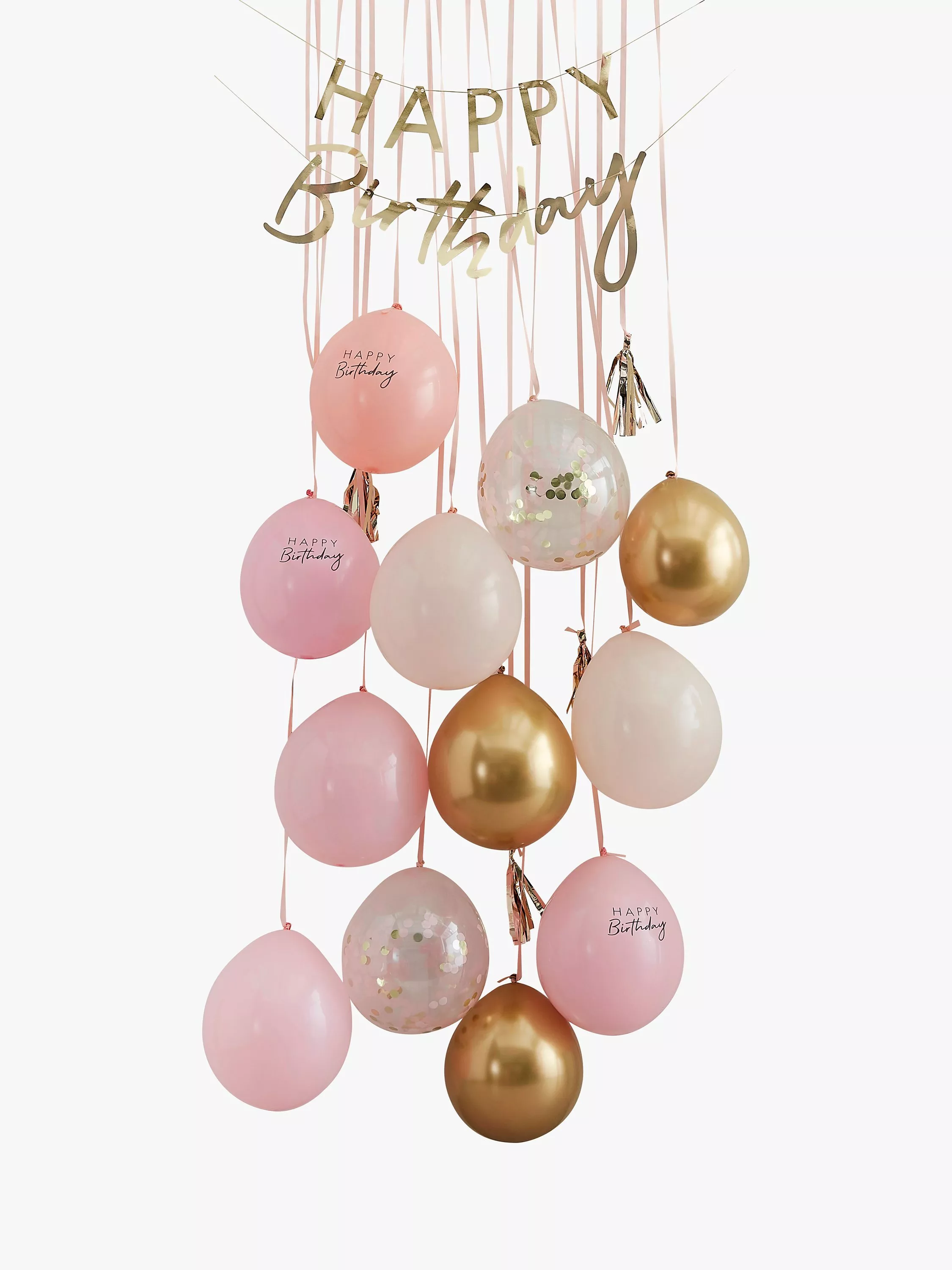 Each Balloon Door Kit contains party balloons bunting and ribbon to include: 1 x Gold 'Happy Birthday' Bunting spread across 2 x 1.5m lengths of gold string 3 x 12 Gold Chrome Balloons 3 x 12" Peach Balloons 3 x 12" Pink Balloons 3 x 12" Pale Pink Balloons 2 x 12" Clear Balloons with Pink Tissue and Gold Confetti 3 x 12" 'Happy Birthday' Printed Balloons (one in each colour)- peach pink and light peach. 14m of Peach Ribbon to hang the balloons to your door 4 x Tassels in gold Elastic bands and glue dots included for easy assembly.