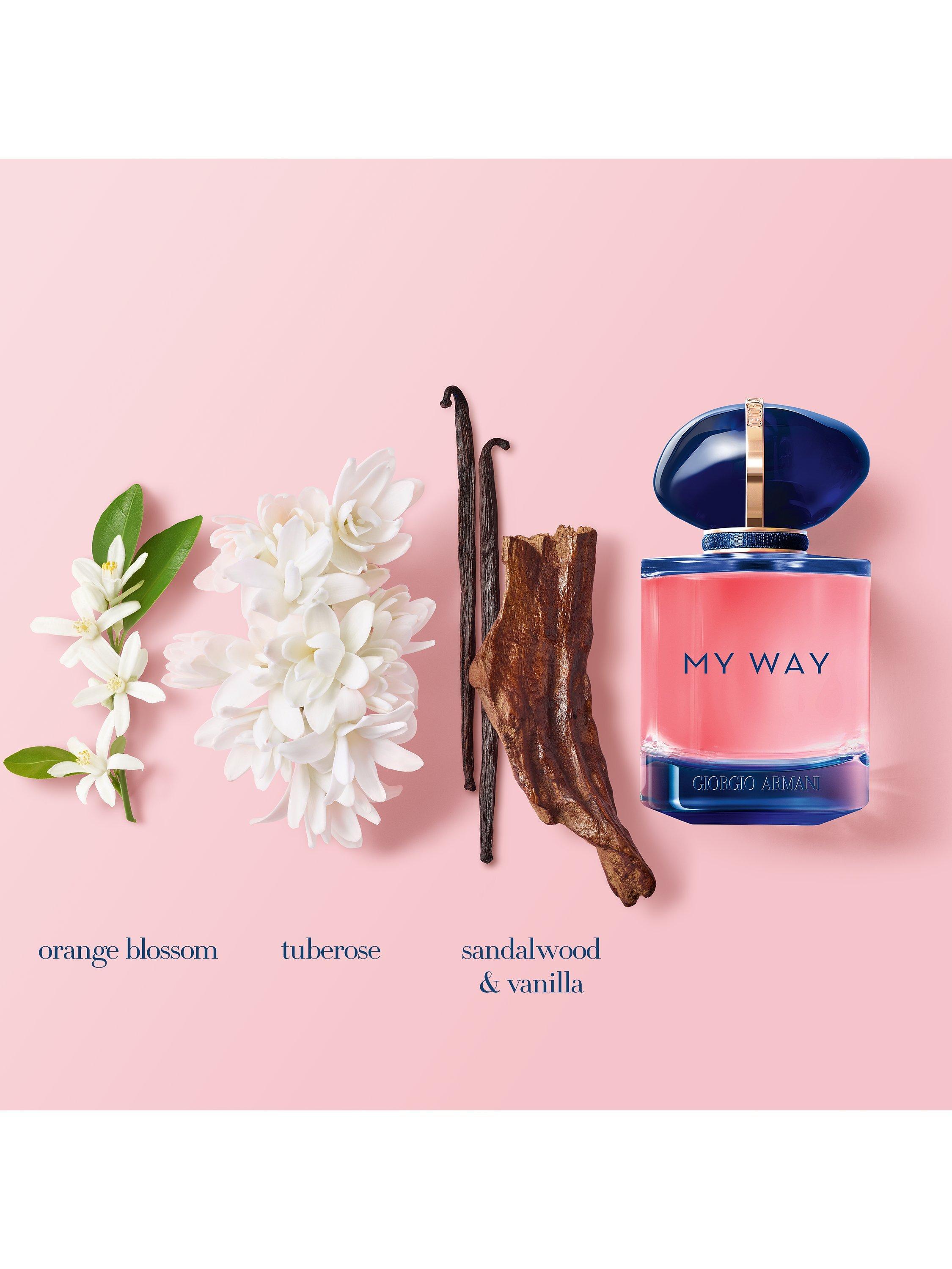 My Way intense is an invitation to a journey of self-discovery, meaningful encounters and amplified experiences. An amplified florality on an addictive woody trail, made of consciously sourced ingredients. The scent opens with bright notes of orange blossom from Egypt. A new intense heart of tuberose from India unveils a creamy and velvety facet of the floral signature. At the base of the fragrance, the sandalwood from New Caledonia takes an addictive creamy turn, as it meets a voluptuous Vanilla from Madagascar.
