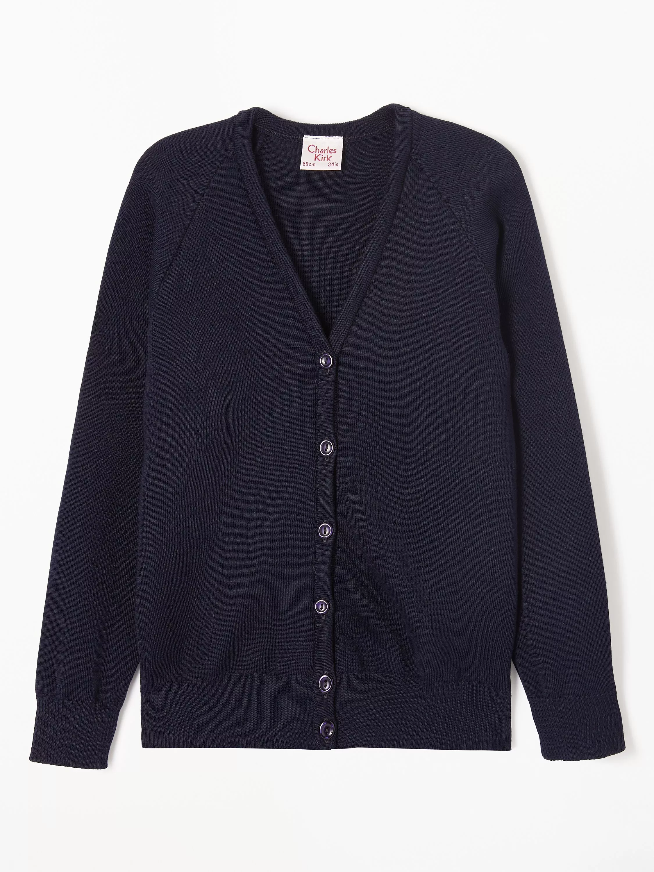 Plain navy school cardigan with a v-neck, ribbed trims and six front buttons.