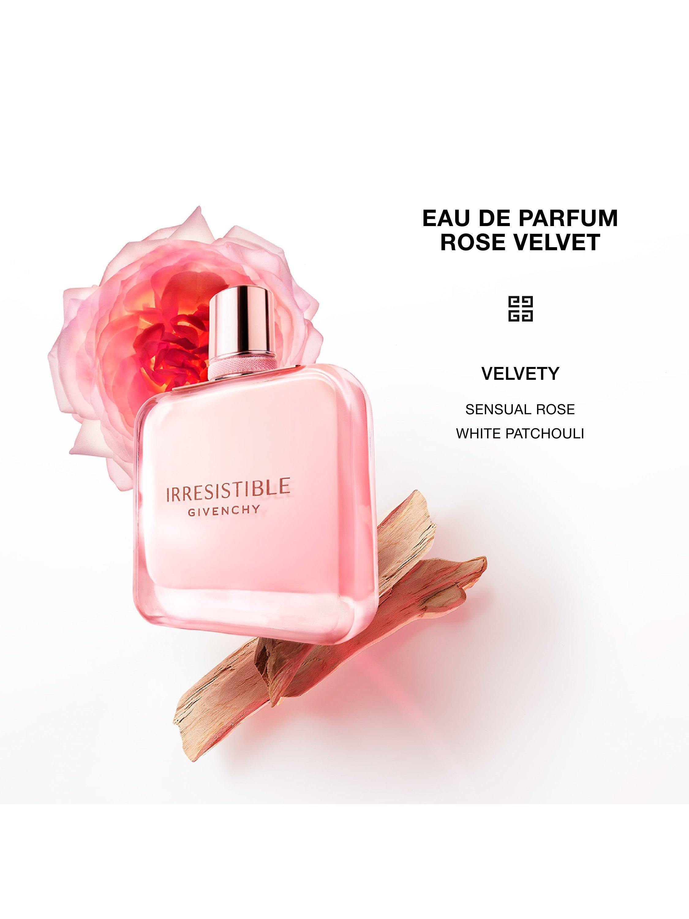 Velvety Rose is enveloped in elegant White Patchouli to create the new addictive floral perfume for women, Givenchy Irresistible Eau de Parfum Rose Velvet. A captivating fragrance in which tenderness is the new bold.