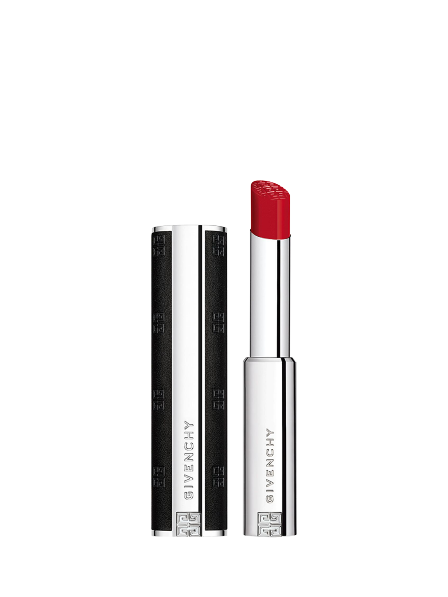 A couture accessory: Le Rouge Interdit Satin features an elegant design with a new sleeker and pocket-sized silhouette. Made with genuine leather, the case is adorned with the iconic 4G monogram and a refined silver-toned edges. A true Givenchy couture accessory, the lipstick bullet is also delicately stamped with the 4G logo.