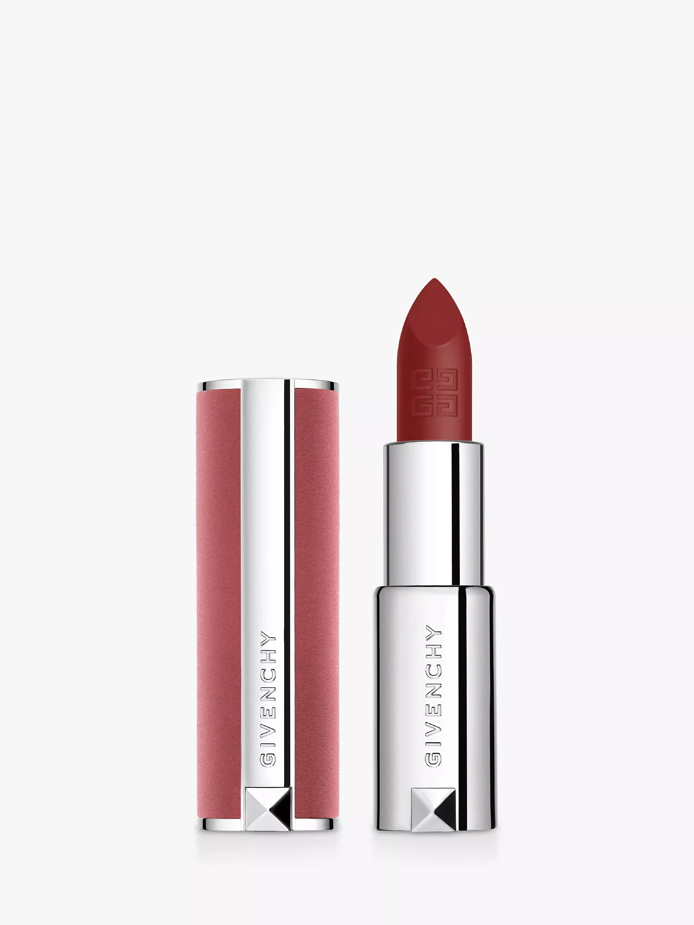 Dressed in a sumptuous pink velvet case, Le Rouge Sheer Velvet lipstick boasts a breakthrough luxury refill mechanism, making it the first refillable Givenchy fashion accessory.