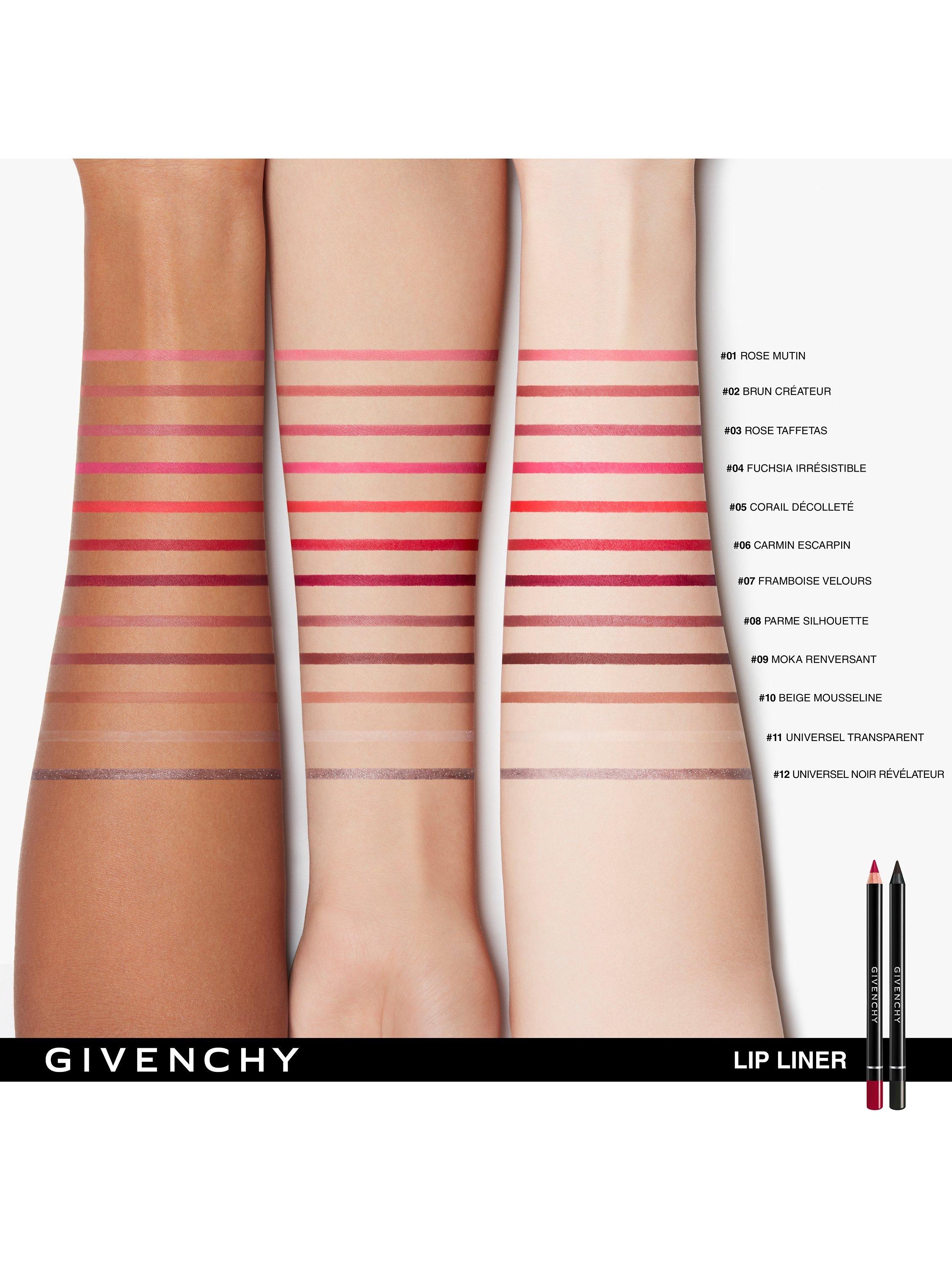A palette of 10 colours matches the Givenchy lipstick range. For greater versatility, the Universal liner works with any shade. Carnauba and Candelilla wax ensure that the supple, creamy formula glides easily onto the lips.