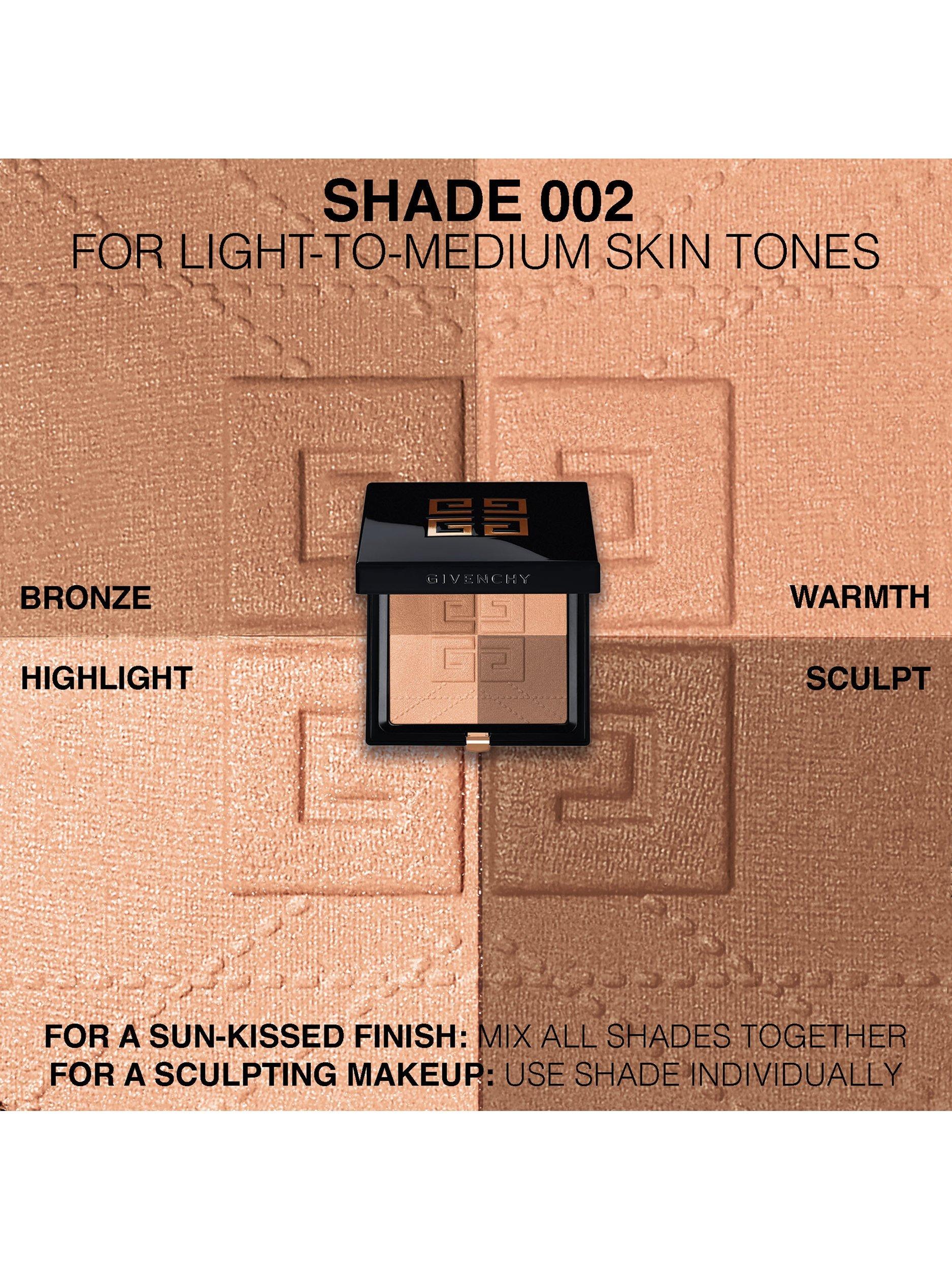 Givenchy Prisme Libre 4-colour expertise: A combination of 4 complementary colours blended into a bronzing powder to bronze, warm, sculpt and highlight for a matte, sun-kissed effect that instantly beautifies the complexion without any textured effect.