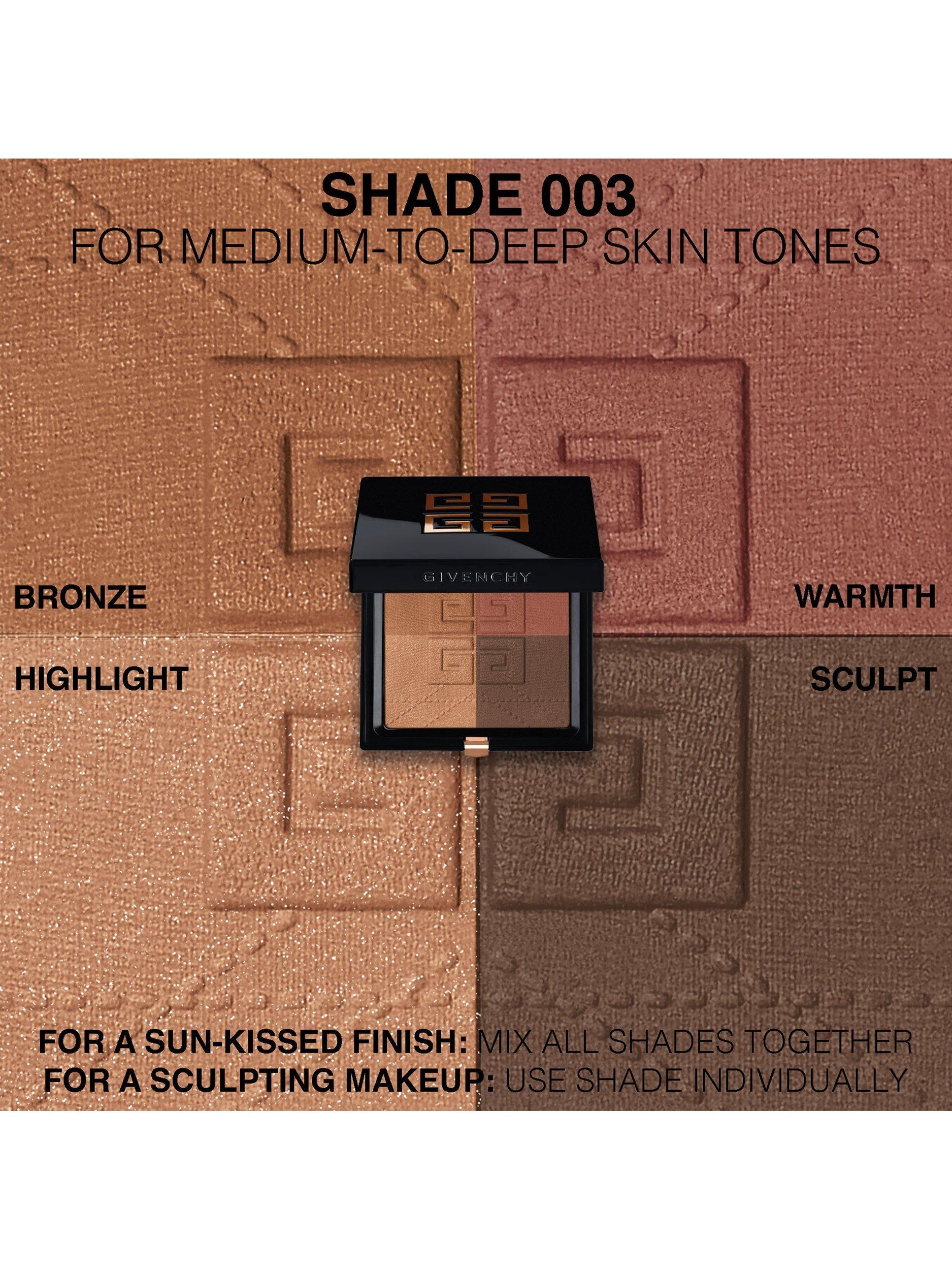 Givenchy Prisme Libre 4-colour expertise: A combination of 4 complementary colours blended into a bronzing powder to bronze, warm, sculpt and highlight for a matte, sun-kissed effect that instantly beautifies the complexion without any textured effect.