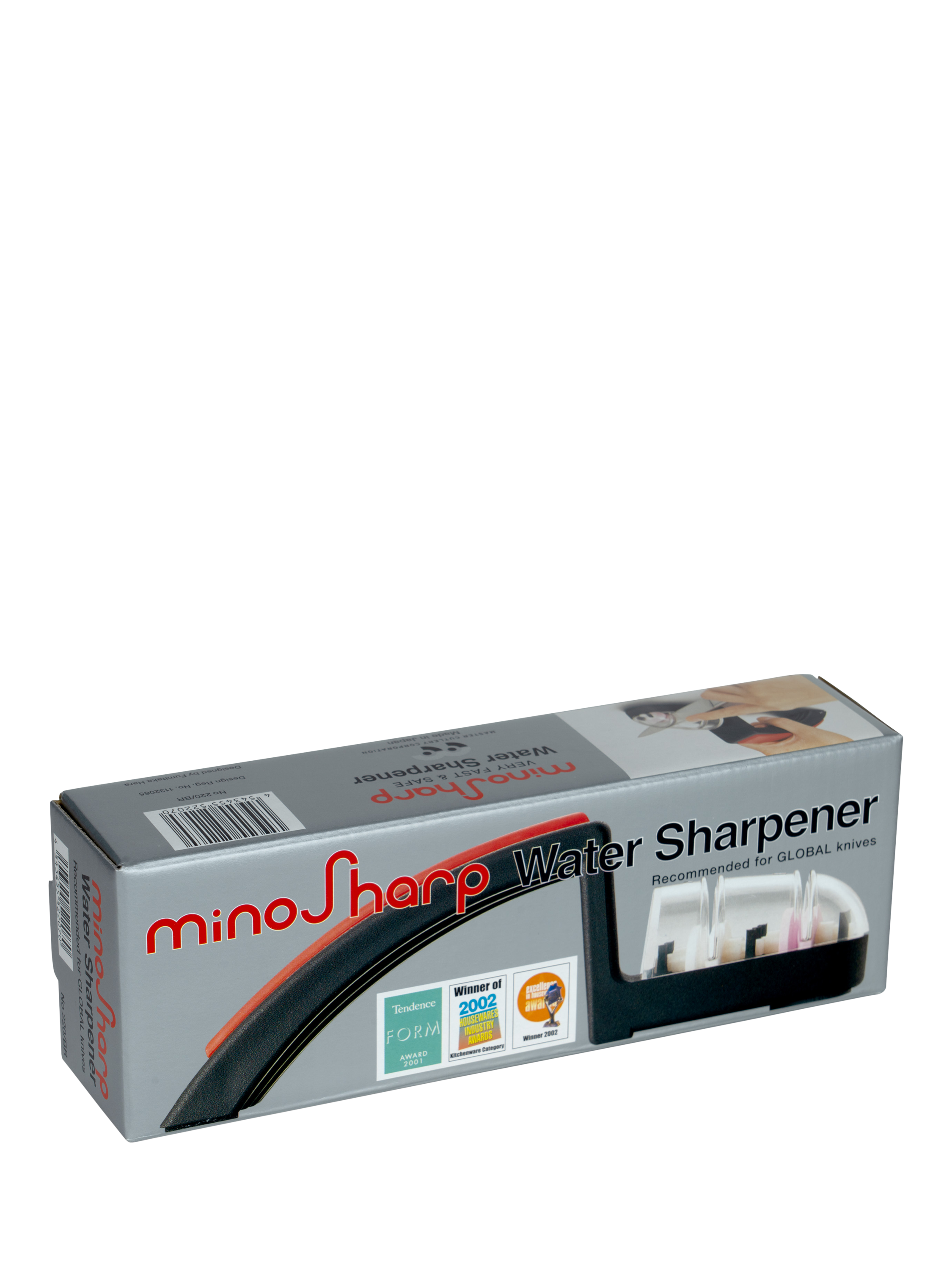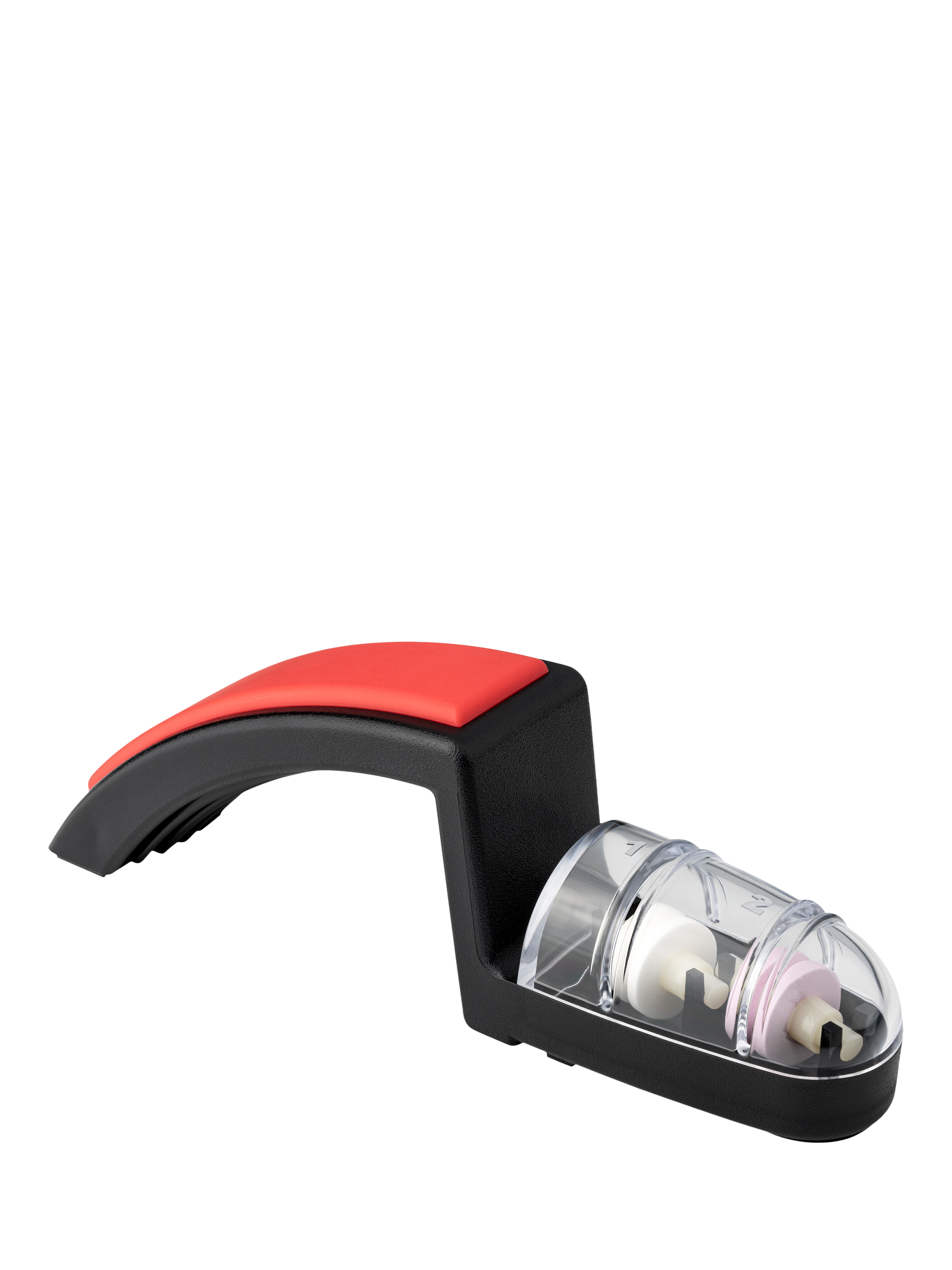 The Shinkansen knife sharpener has two sets of ceramic sharpening wheels, coarse and medium, and is easy to use. Just pour water into the reservoir, then draw the knife through each set of wheels.