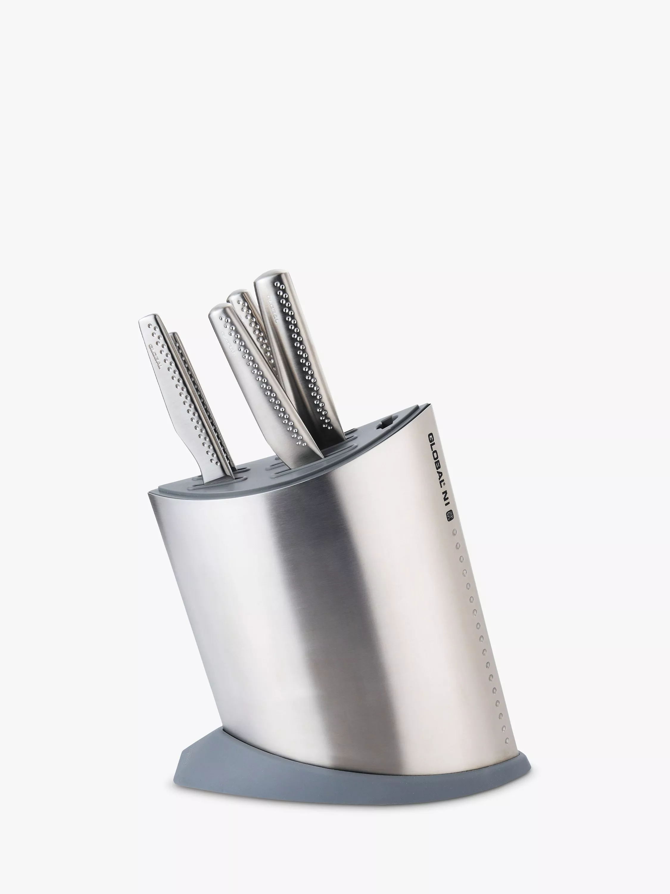 This 6 piece knife block set includes one of each of the following knives: 20cm Cook's knife, 21cm Bread knife, 21cm Carving knife, 9cm Paring knife and 11cm Utility knife - for use in all types of food preparation. There is also a further slot suitable for a matching Global sharpener or kitchen scissors.