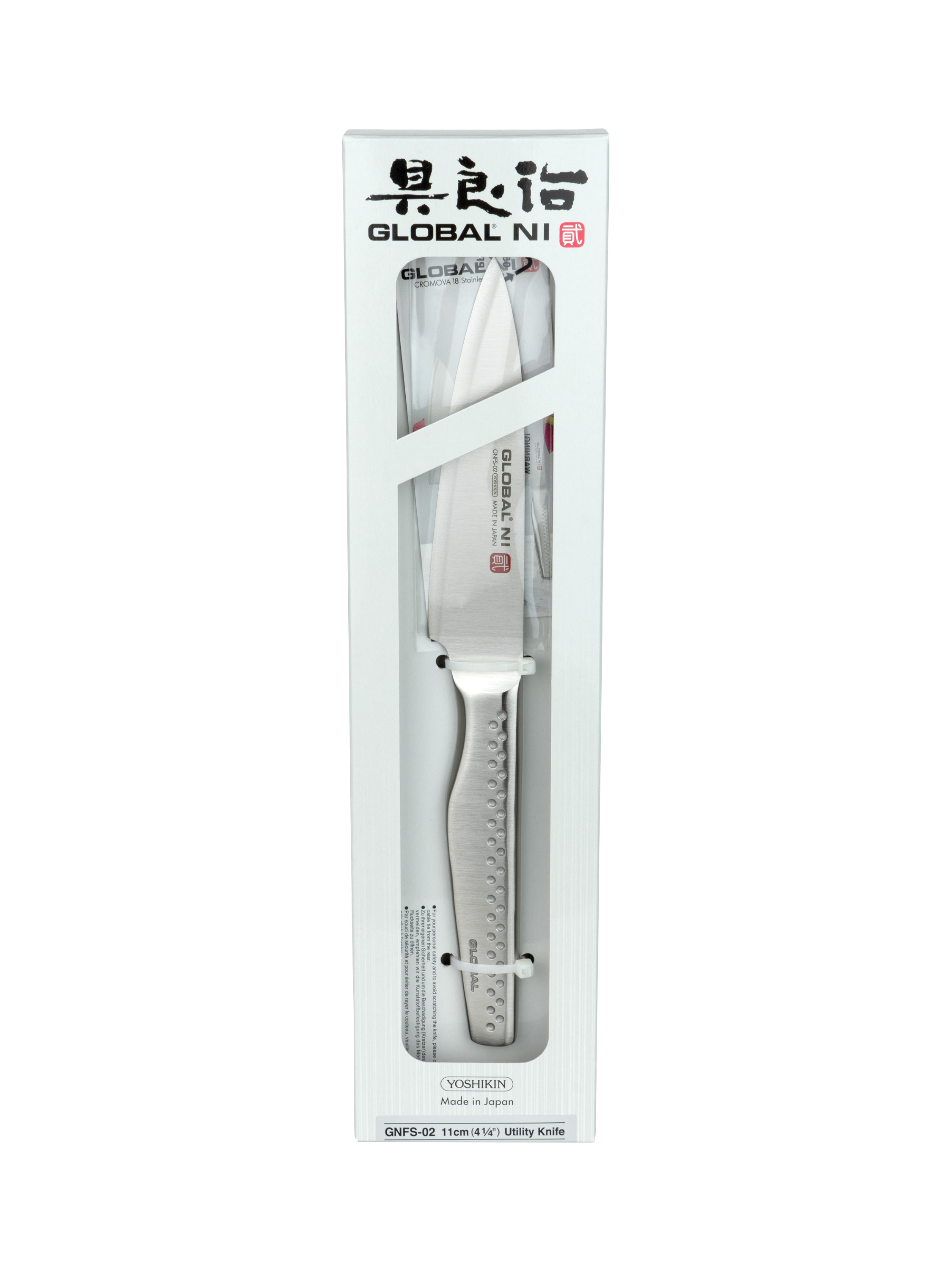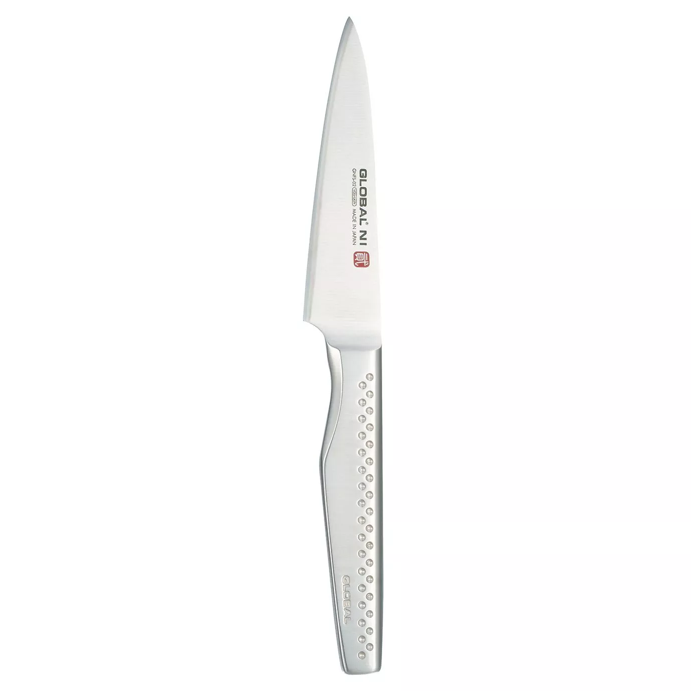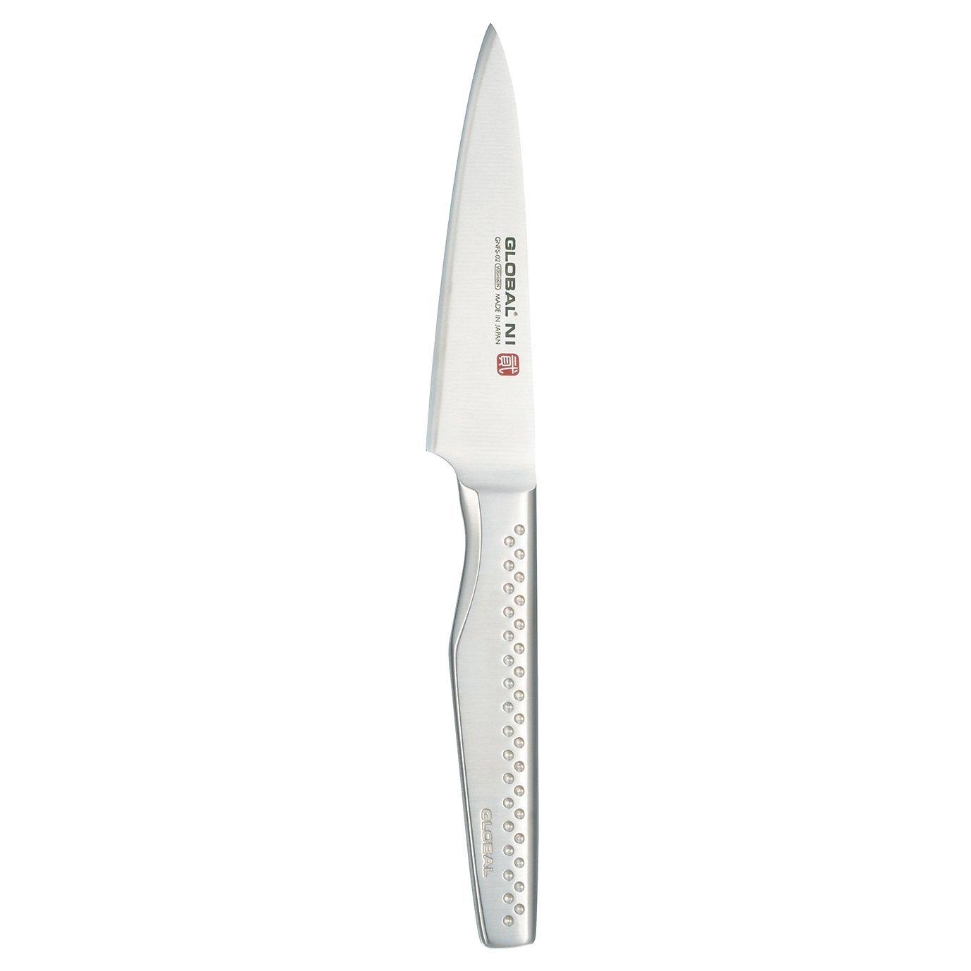 The Global NI knives have a thicker 2.4mm blade, with a razor sharp finish, sleek design and are lightweight and perfectly balanced. The knives have a longer textured handle, designed for comfort and ease of use. The utility knife is a small all purpose knife used for slicing fine meats and soft vegetables.