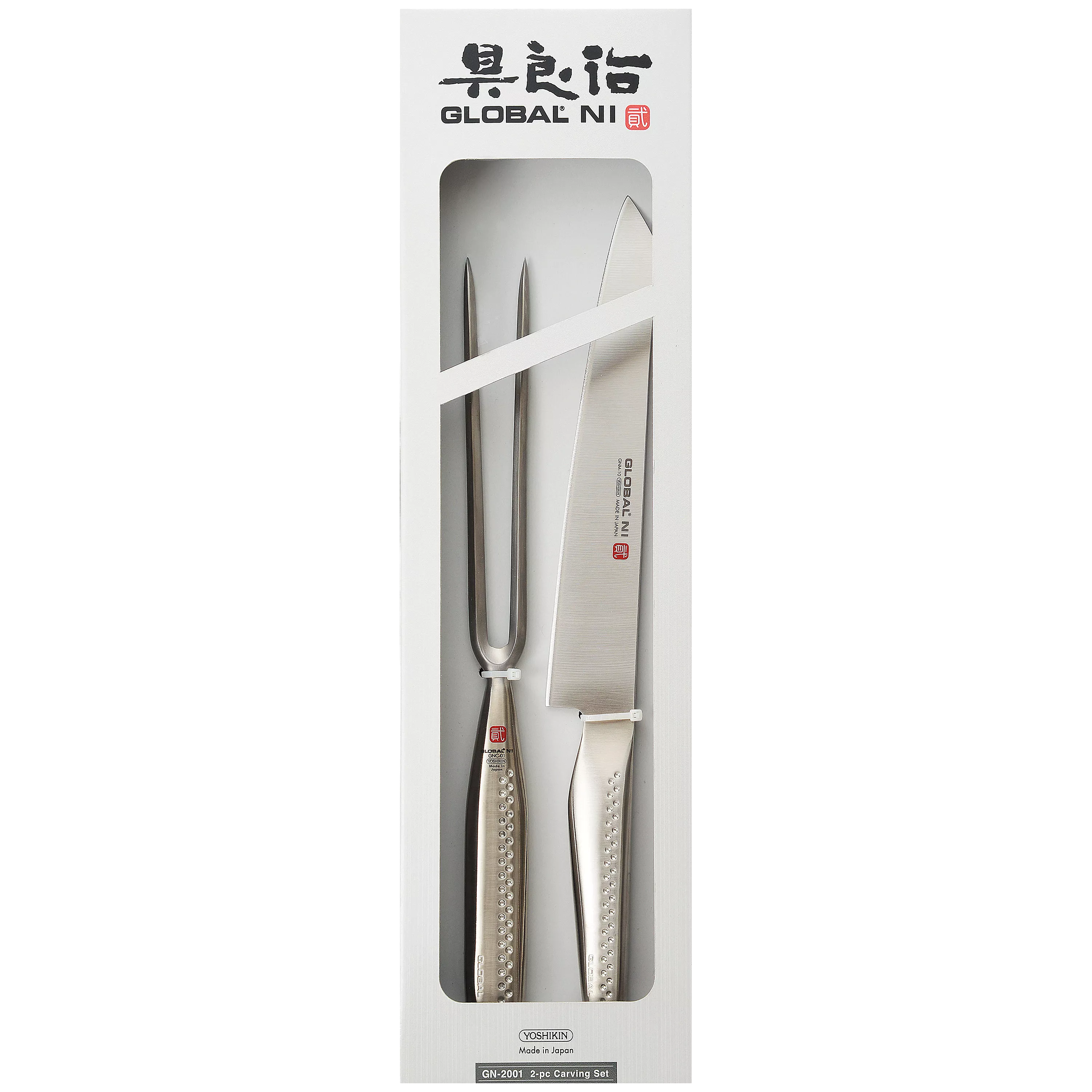 Just like a professional, you'll enjoy carving a joint with this set that includes a 21cm carving knife and forged carving fork. Both are well balanced in the hand with a contemporary look and feel achieved by Japanese industrial designer Komin Yamada for the Global Ni range.