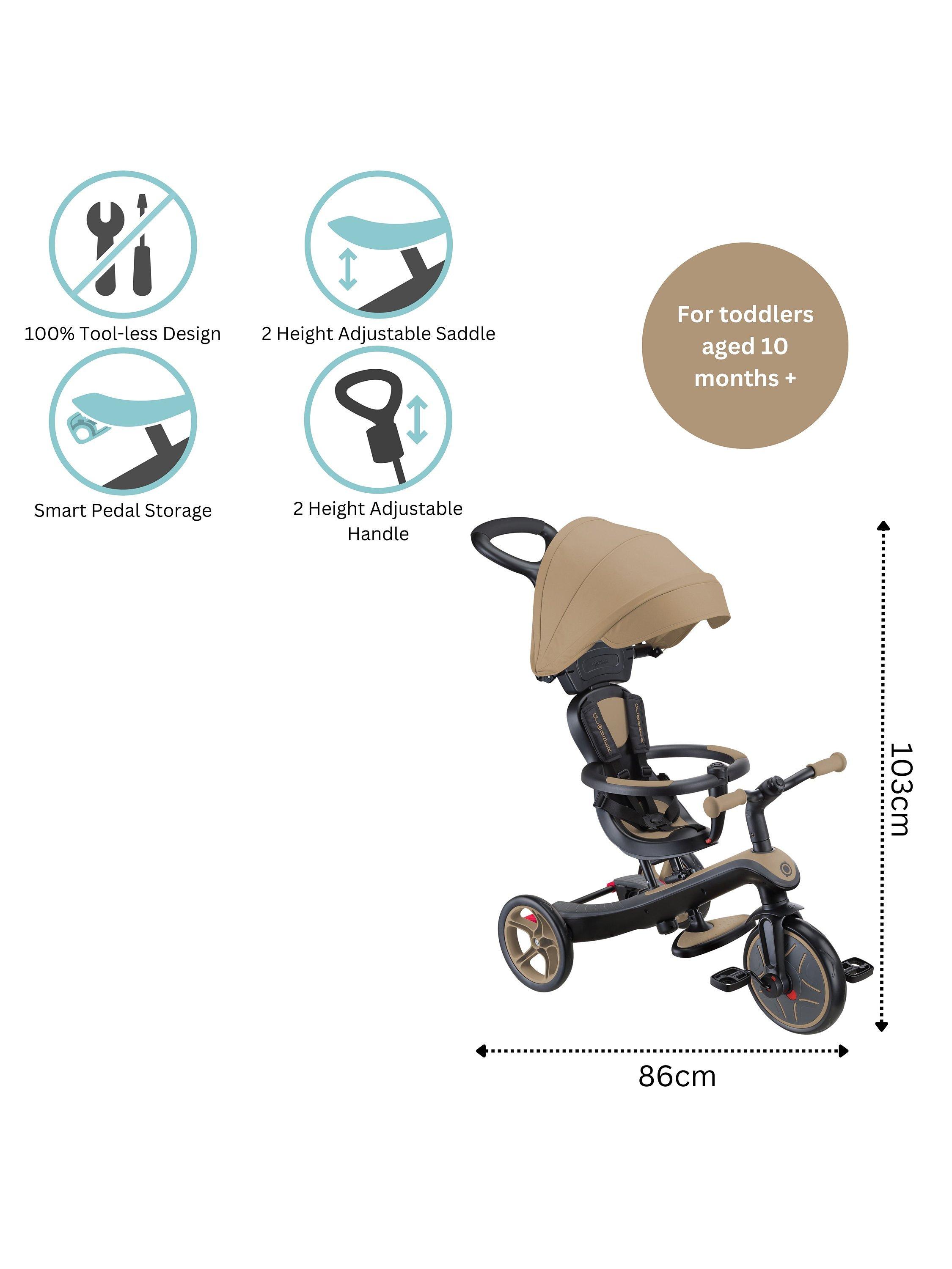 The Globber by Plum® Explorer Trike 4in1 allows for maximum product usage with an all-in-one baby tricycle for toddlers aged 10 months+ and balance bike for ages 2 to 5. When assembled as a toddler tricycle, it can be adapted for when kids develop. From Infant Trike when they are 10 to 36 months, to Guided Trike for 18 to 36 months, to Training Trike for 24 to 36 months – and for when they are ready, a Balance Bike for 2 to 5 years.