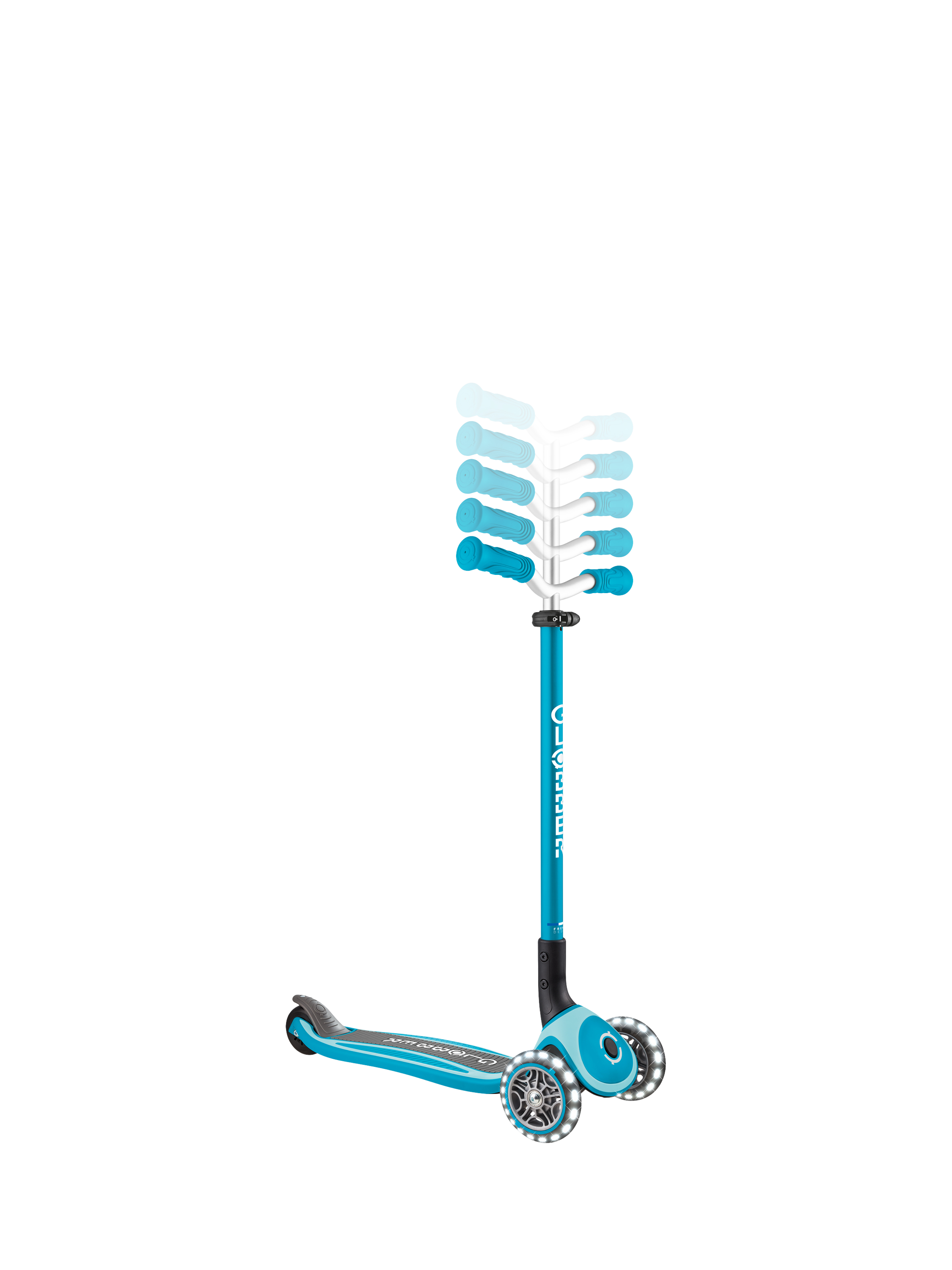 Master Lights comes with battery-free white LED front lights! Thanks to the dynamo lighting, the faster you go, the brighter the LED lights appear. The extra-long and wide bi-injection composite rear brake delivers on brake efficiency and prolongs wheel longevity. It comes with an extra-wide, anti-slip dual-colour composite deck with EVA foam that can support weights up to 50kg. With an adjustable 5-height T-bar, it’s perfect for adapting as your child grows. The dual-colour TPR grips offer both comfort and durability.