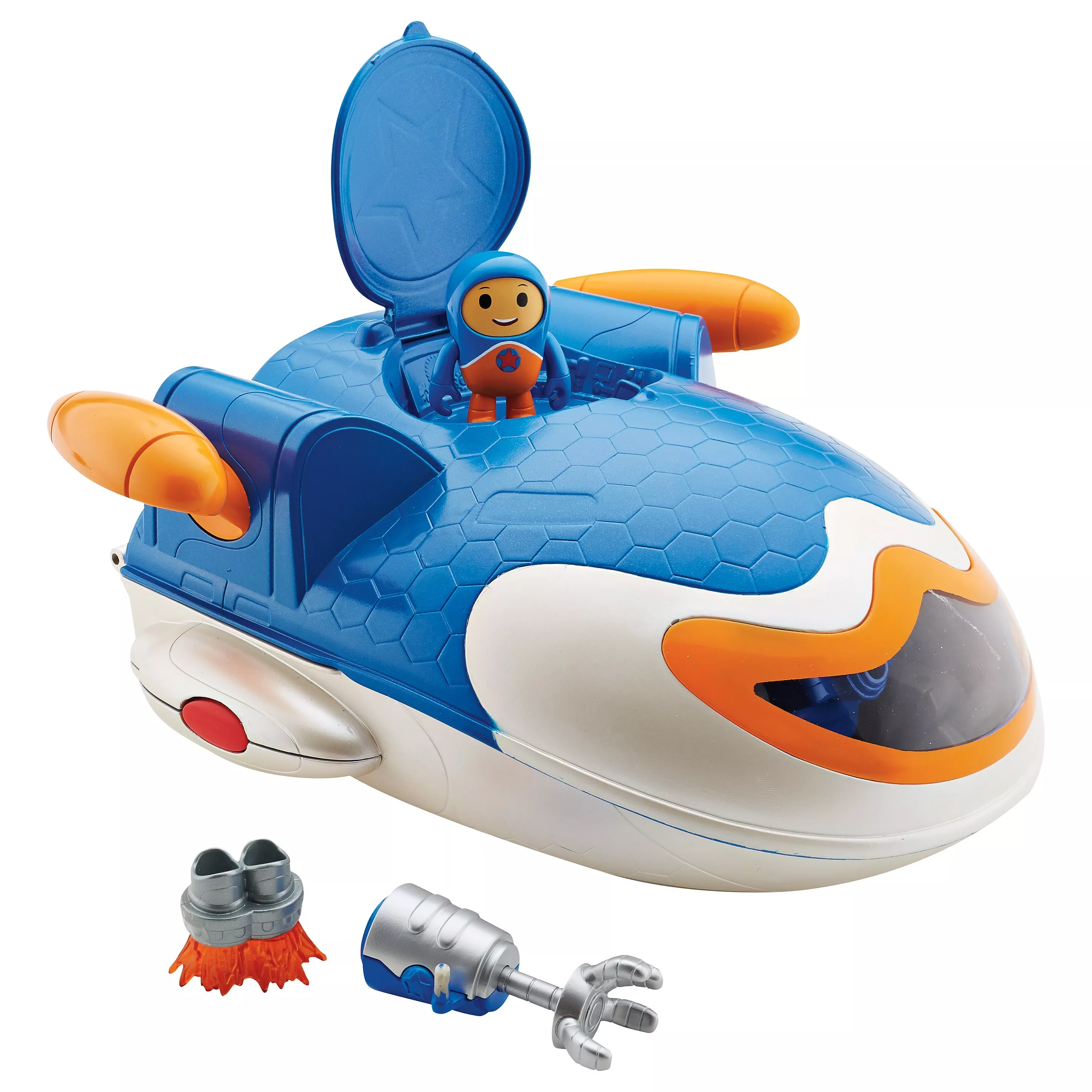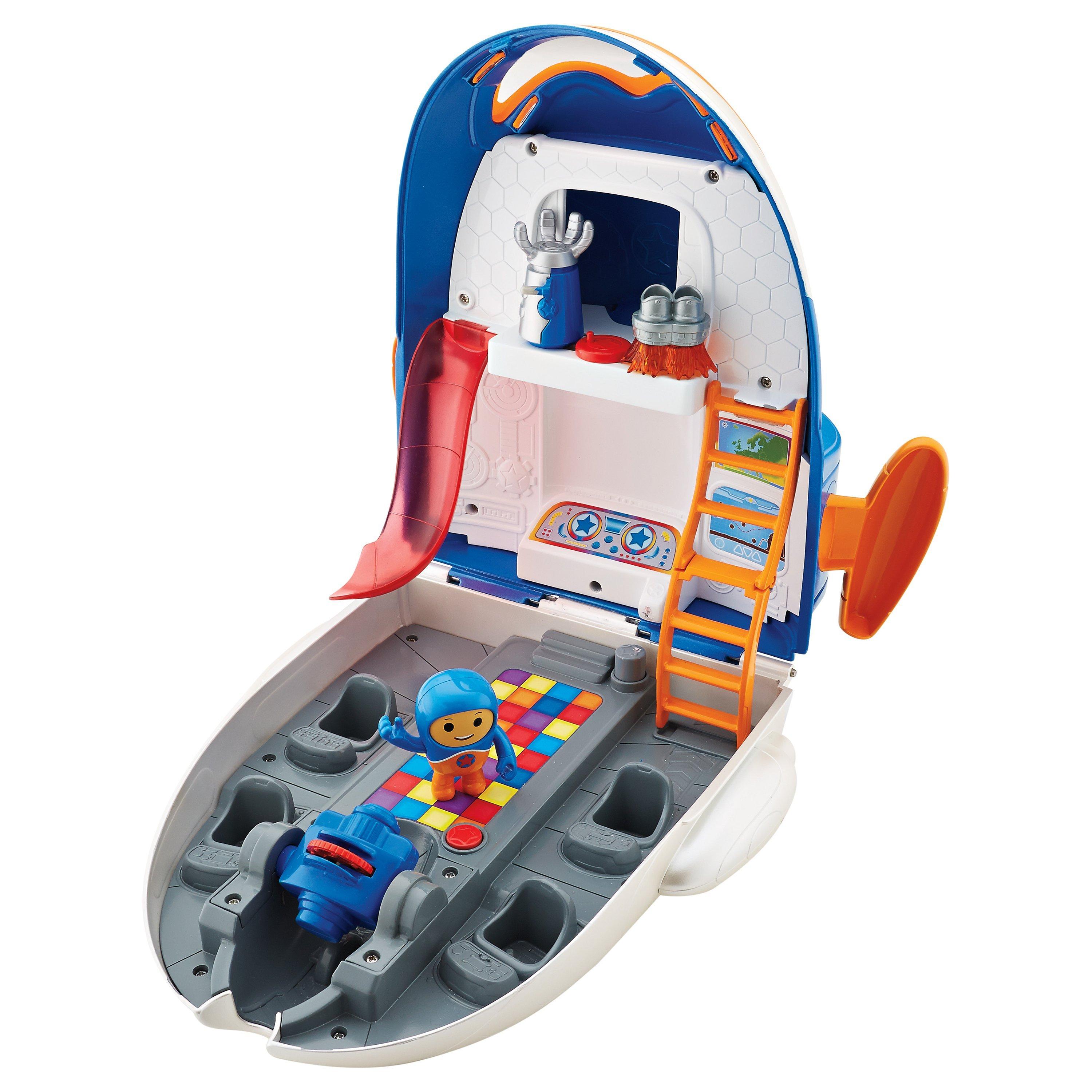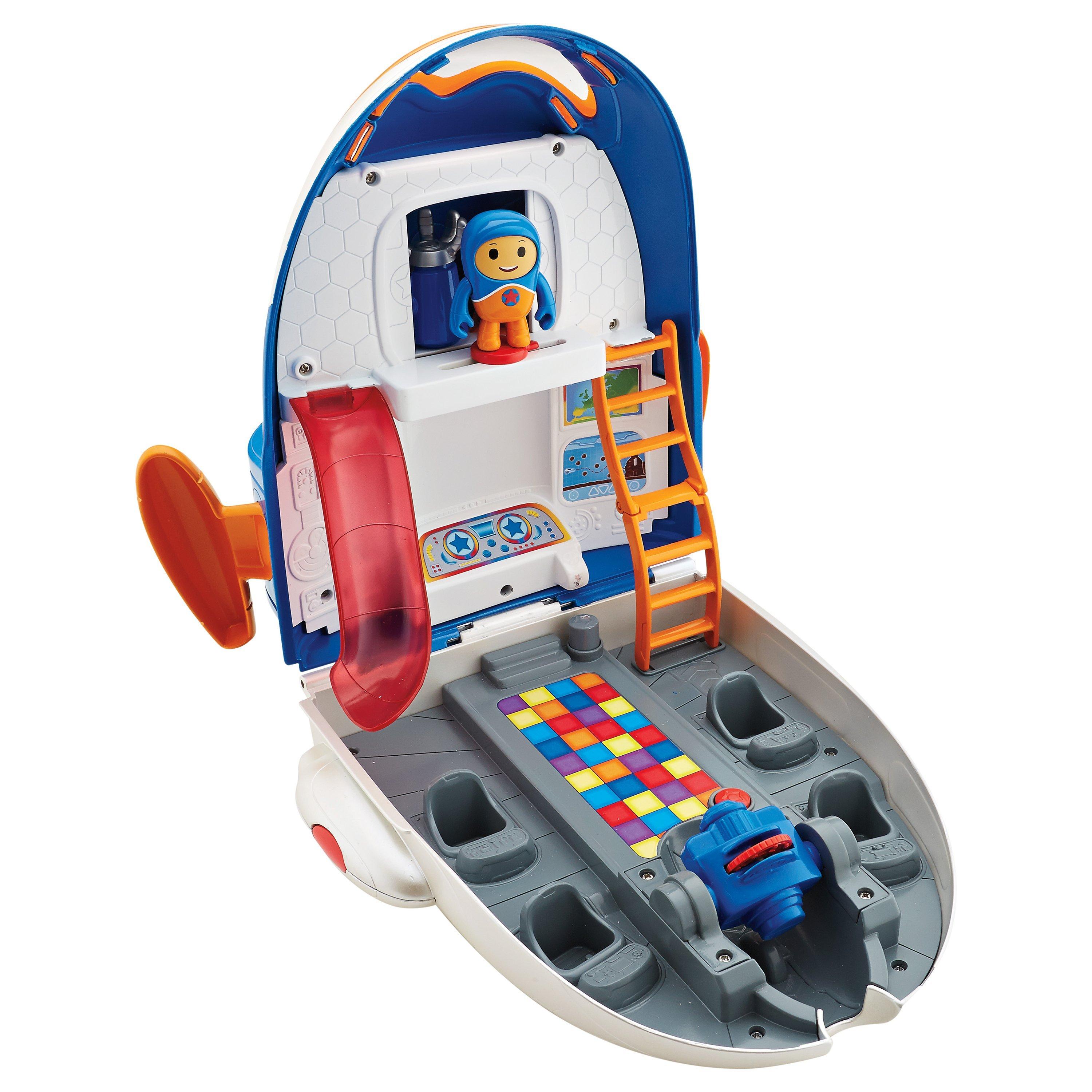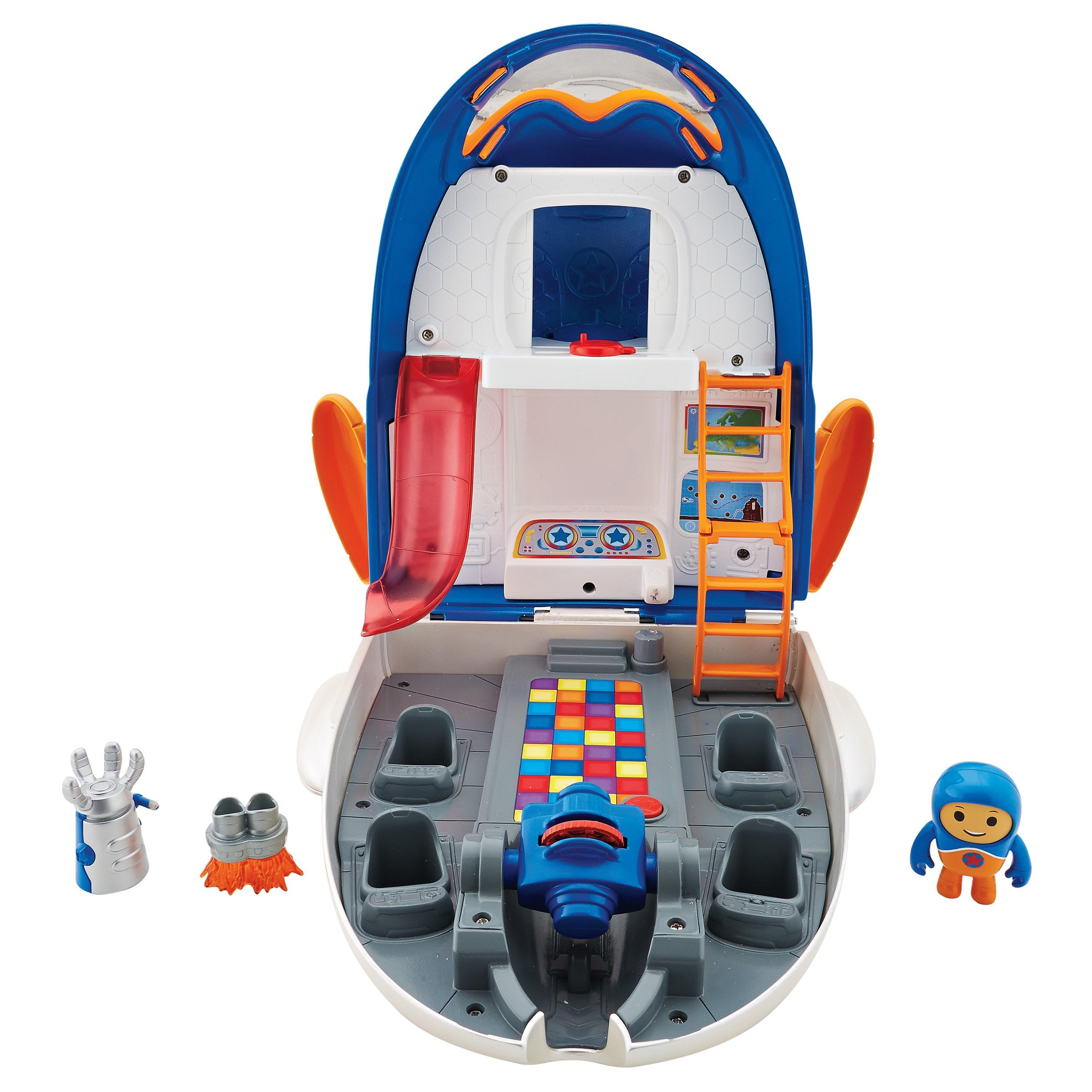 The Jet Pad HQ play set includes rolling wheels and is loaded with features like a slide, a hidden room where special click-ons (exclusive to this play set) are stored, plus a secret hangar room! Best of all, you and the Go Jetters will always be ready for the next adventure with the special projection feature. Just open the play set and the projector flips to project an image on the control panel screen. Images include iconic landmarks as seen on the show, both glitched and un-glitched.