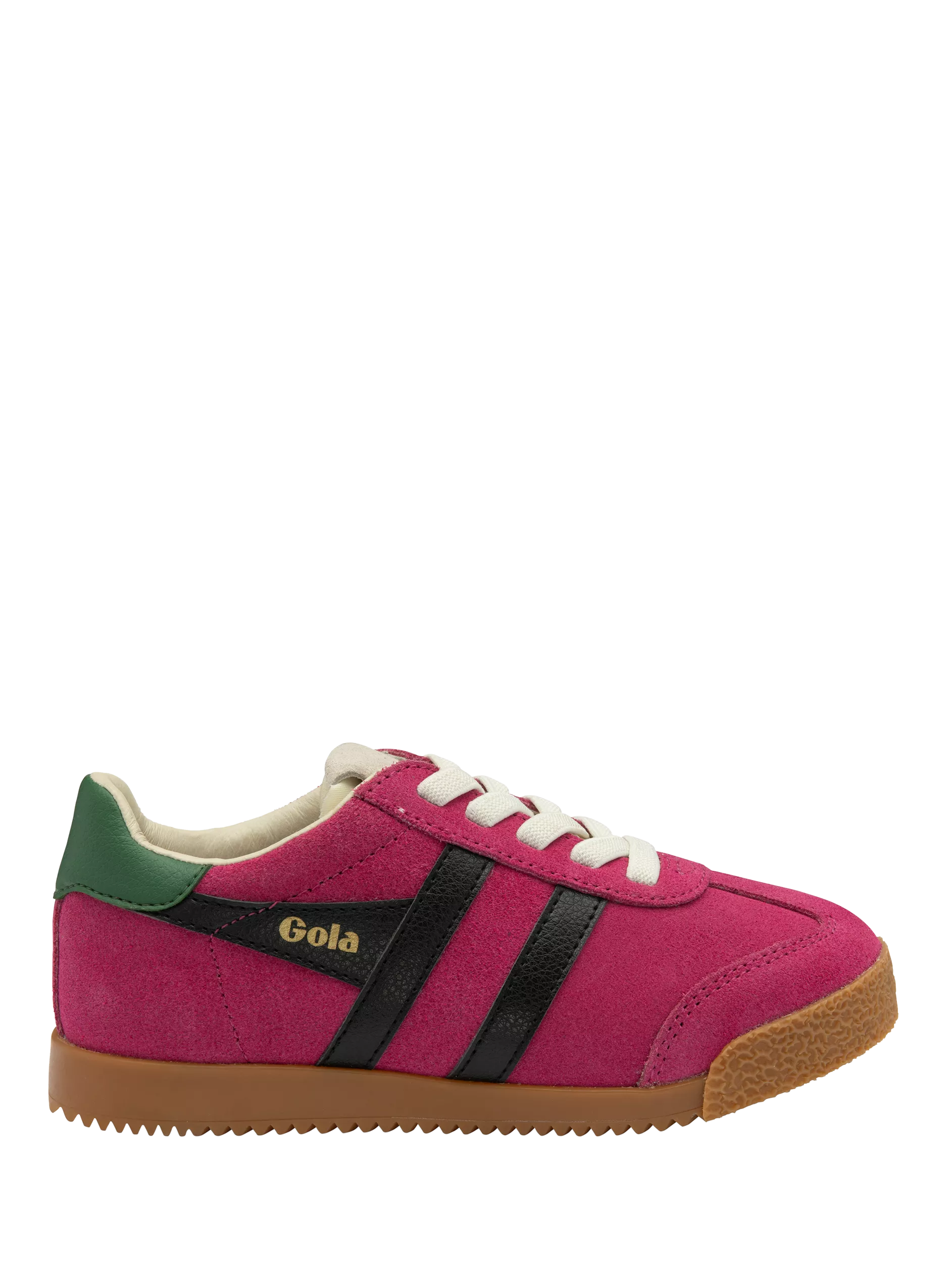Today, it features modern, vibrant colour combinations. Gola Elan boasts a suede upper with a contrasting wingflash and heel tab. A fun, retro look for youngsters. Additional features include a gum sole unit, elasticated laces for easy on/off and iconic Gola wingflash branding.